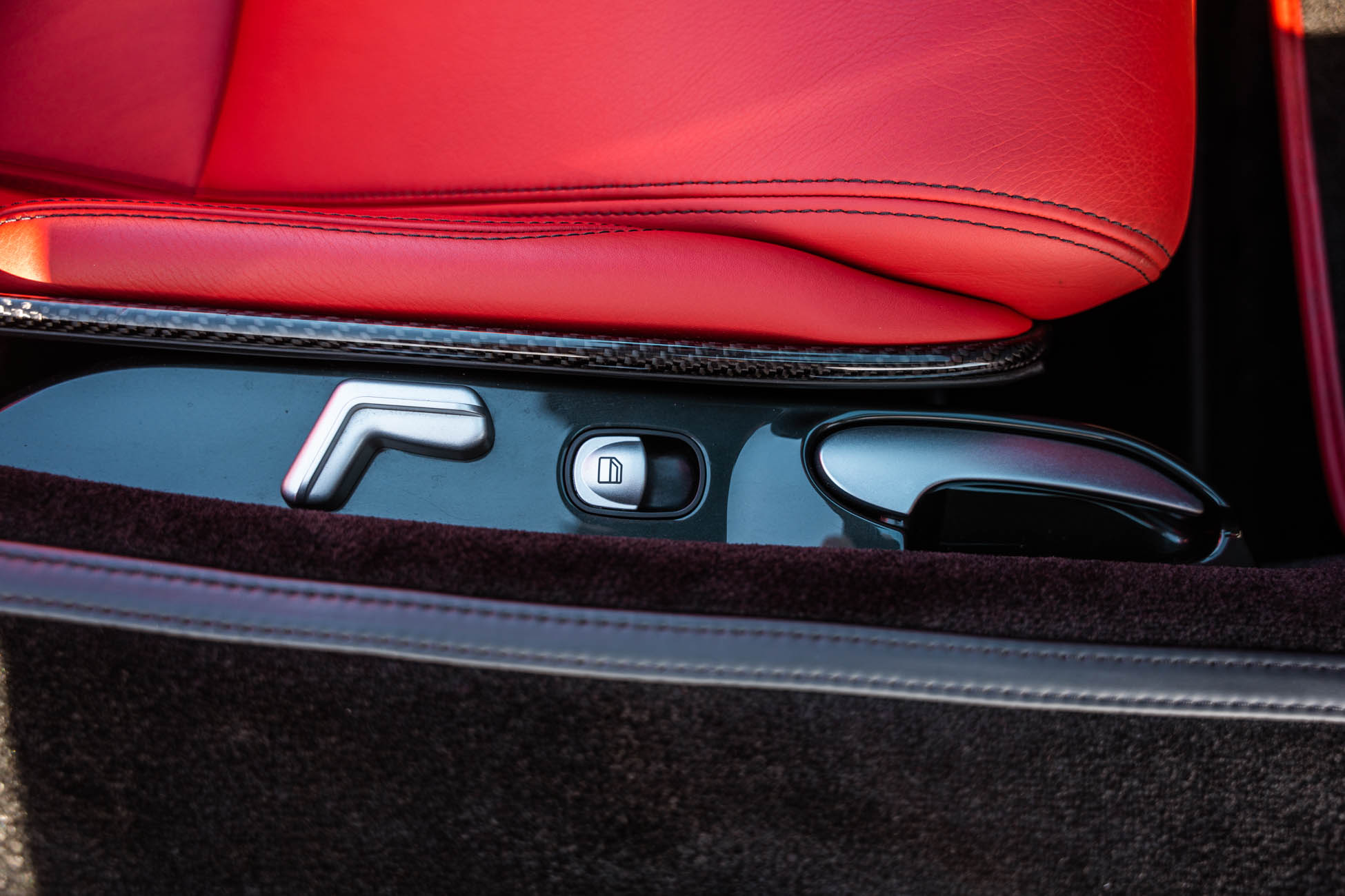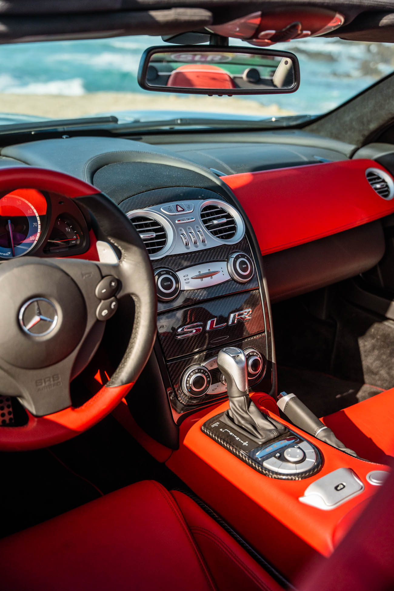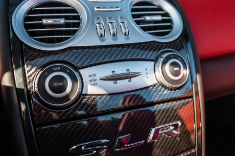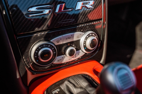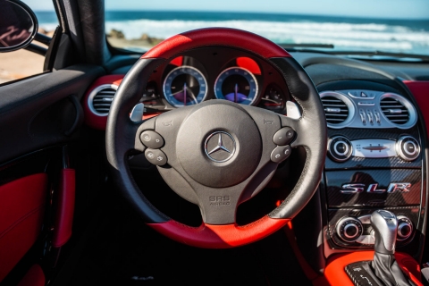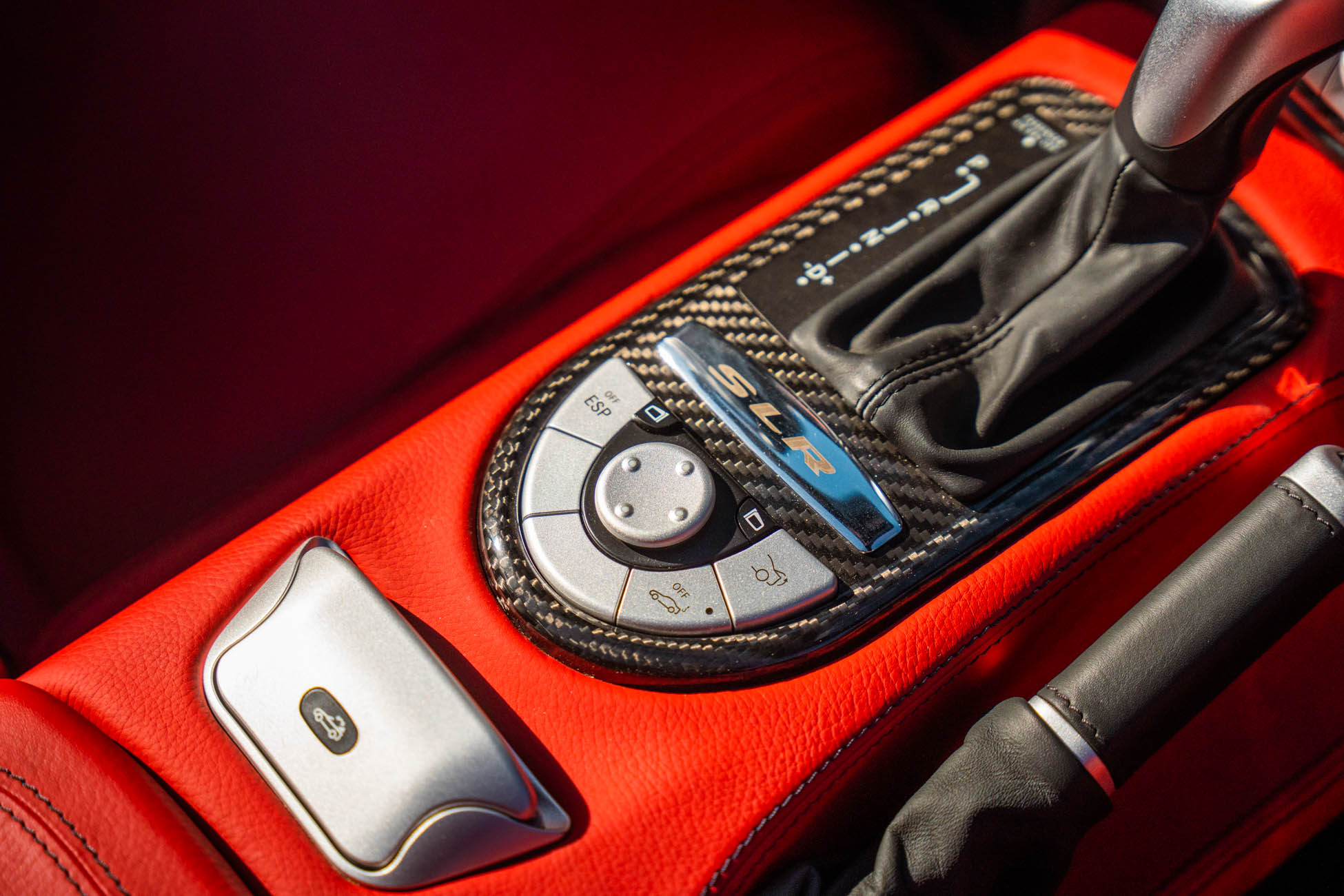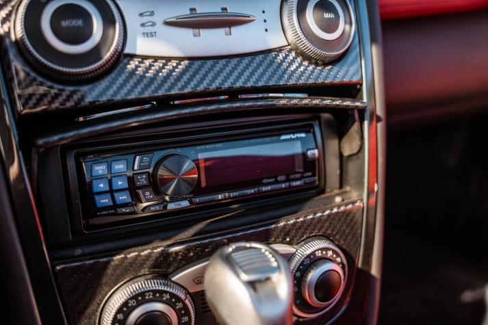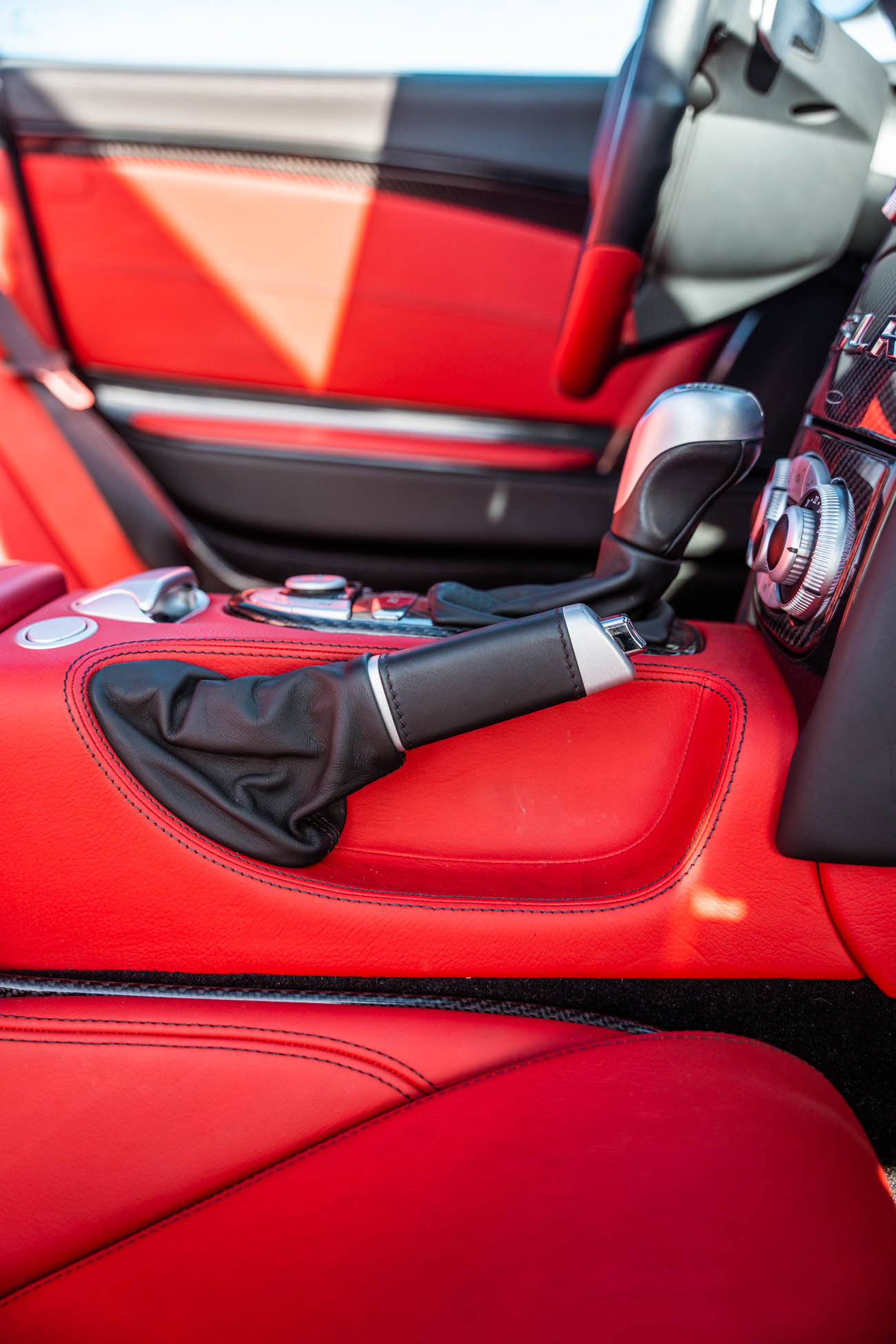 300SL Red Silver Arrow leather covers the power-adjustable carbon-fiber seats along with the center console, dashboard, and door panel inserts, while carbon-fiber trim accents the cabin. Additional equipment includes an Alpine head unit, a Bose sound system, a shift knob-mounted starter button, a wind deflector, and dual-zone automatic climate control.