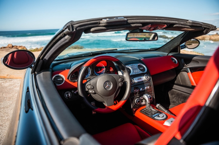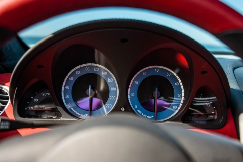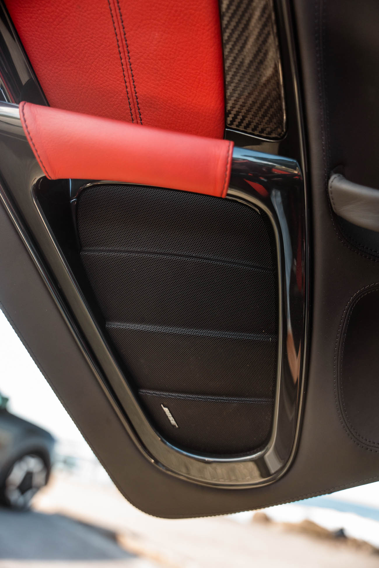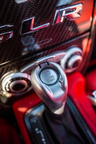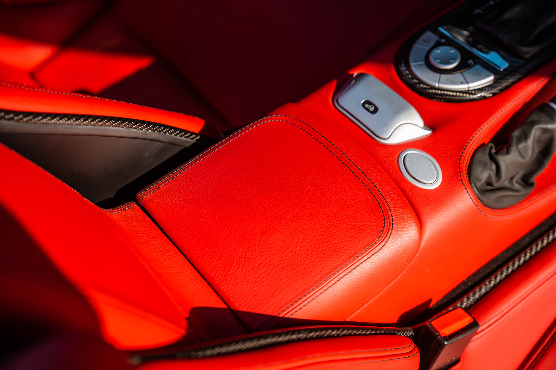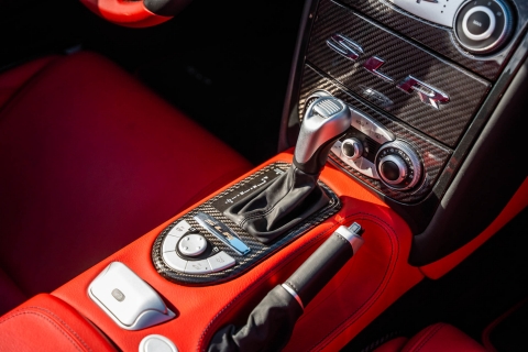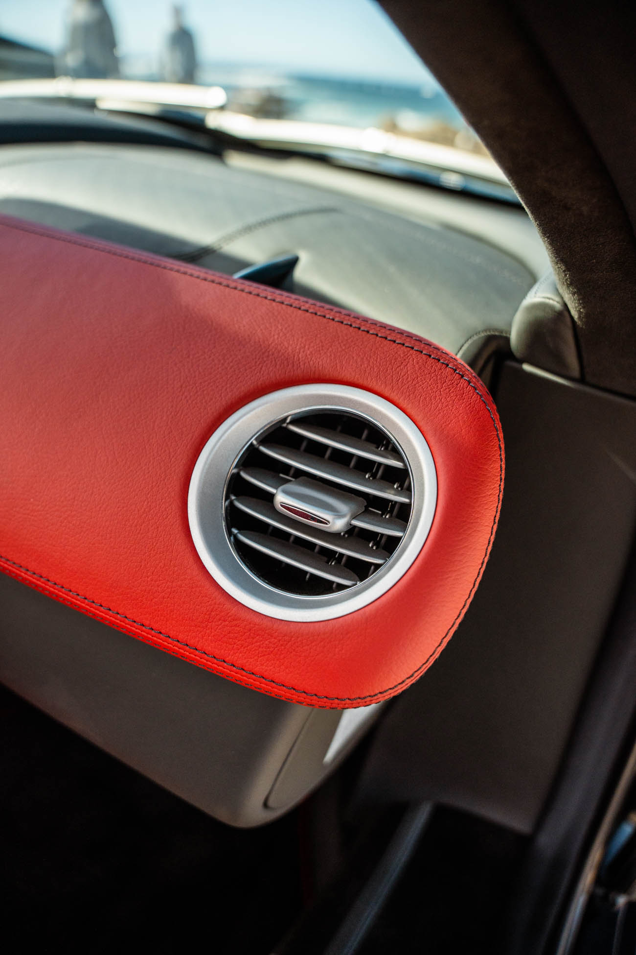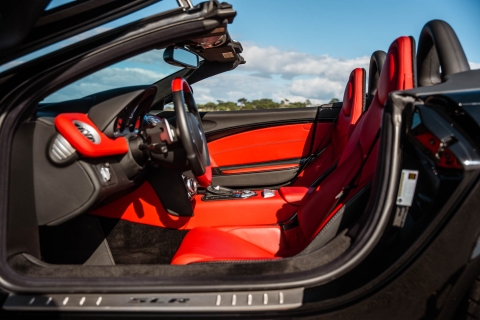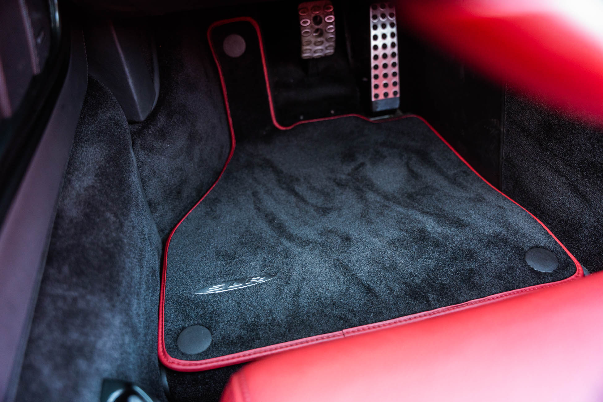 300SL Red Silver Arrow leather covers the power-adjustable carbon-fiber seats along with the center console, dashboard, and door panel inserts, while carbon-fiber trim accents the cabin. Additional equipment includes an Alpine head unit, a Bose sound system, a shift knob-mounted starter button, a wind deflector, and dual-zone automatic climate control.
