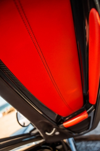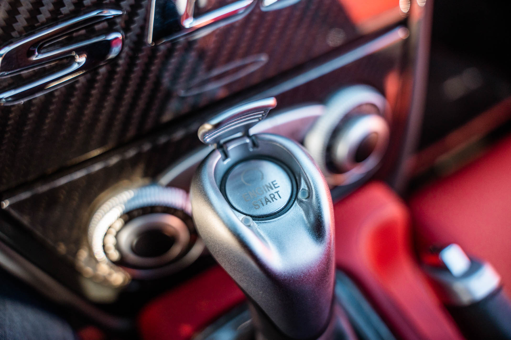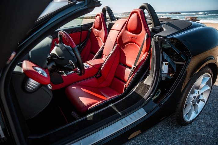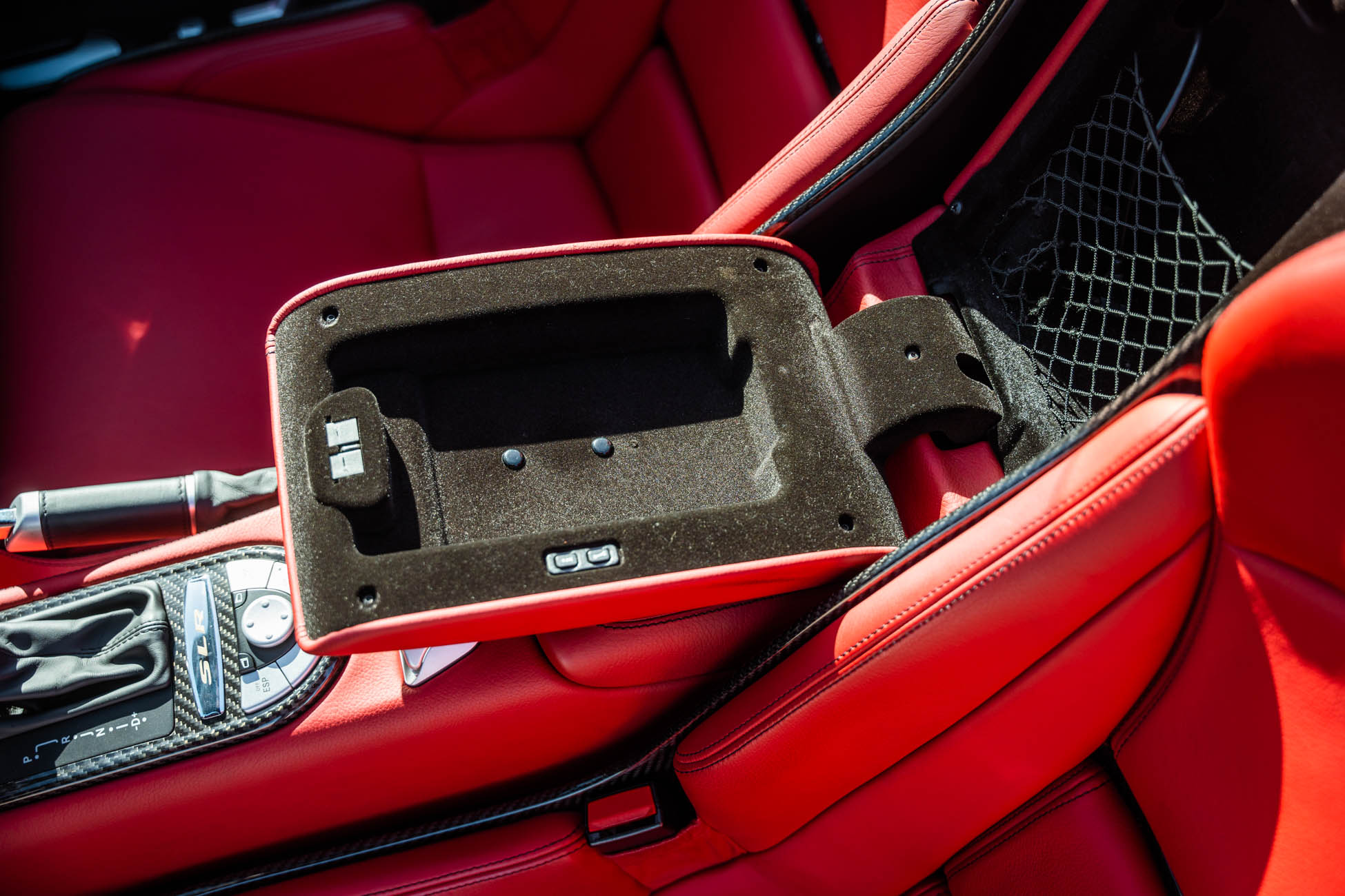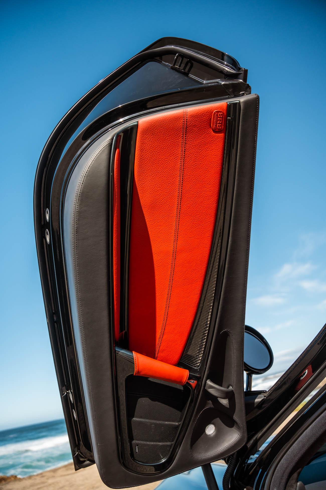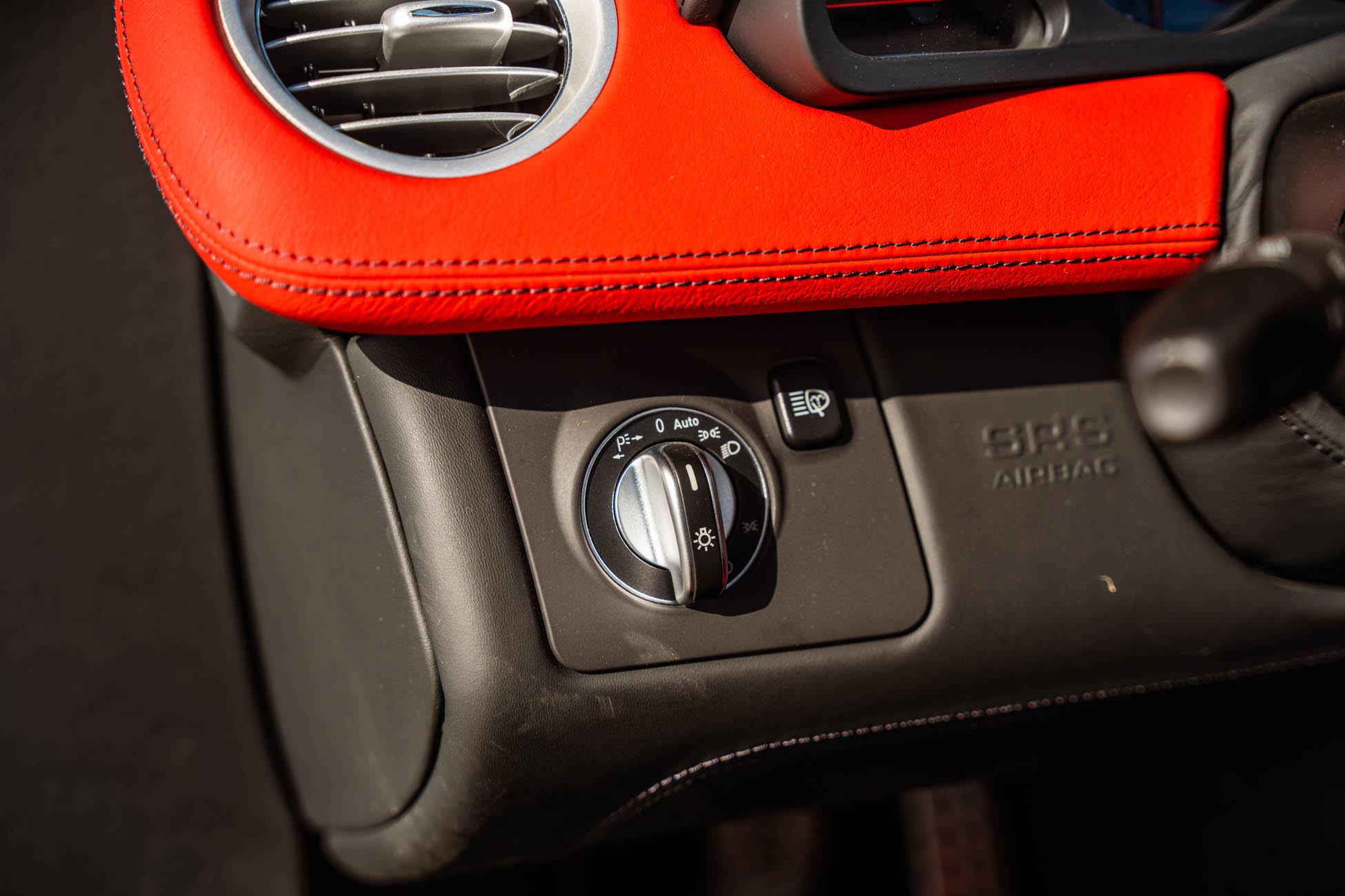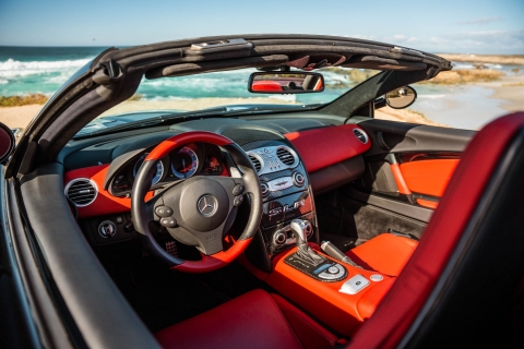 300SL Red Silver Arrow leather covers the power-adjustable carbon-fiber seats along with the center console, dashboard, and door panel inserts, while carbon-fiber trim accents the cabin. Additional equipment includes an Alpine head unit, a Bose sound system, a shift knob-mounted starter button, a wind deflector, and dual-zone automatic climate control.
