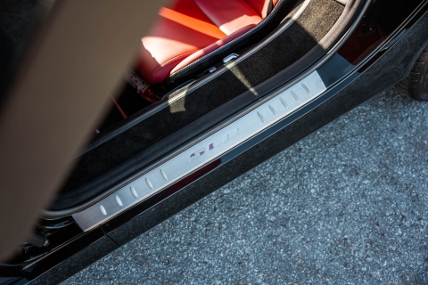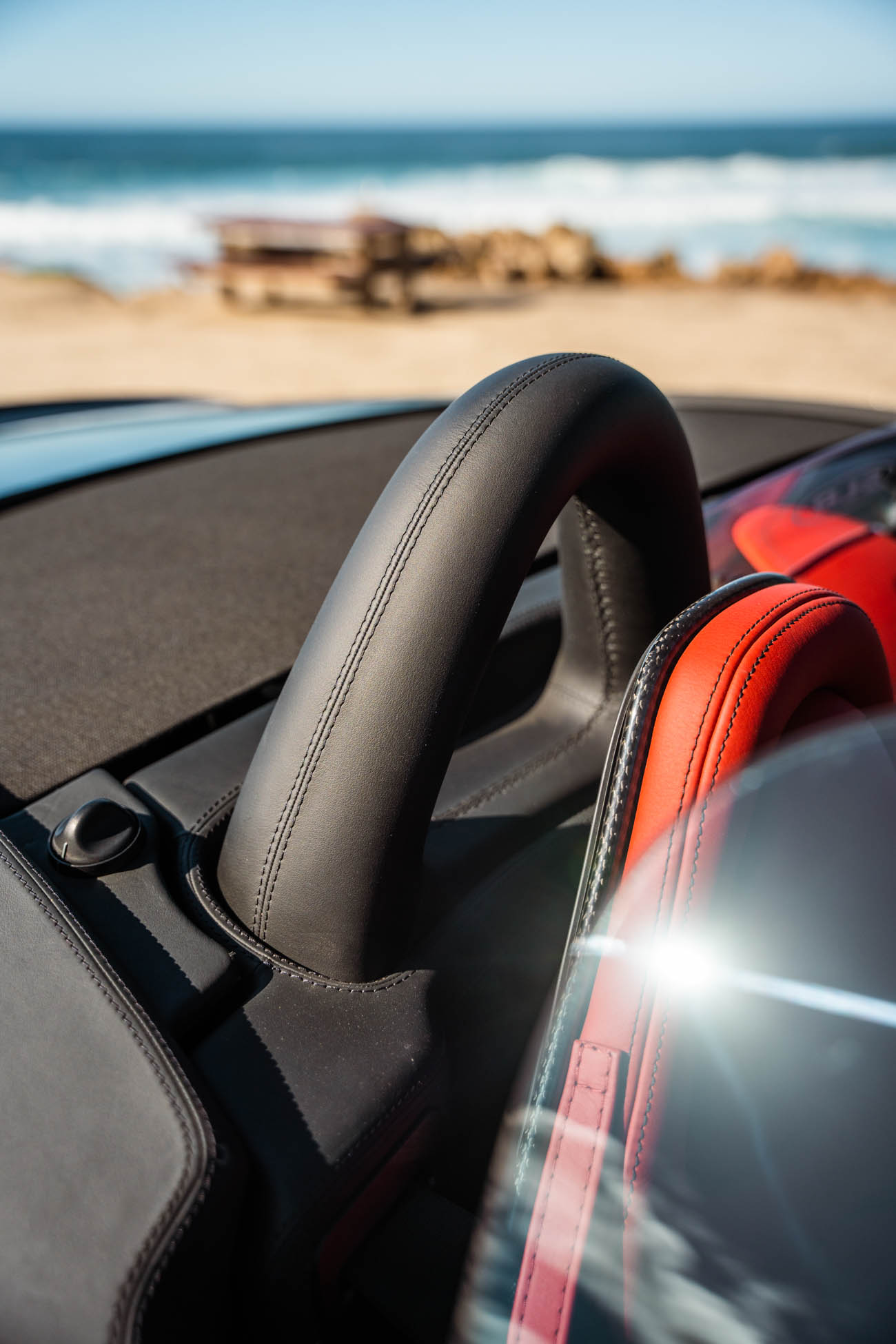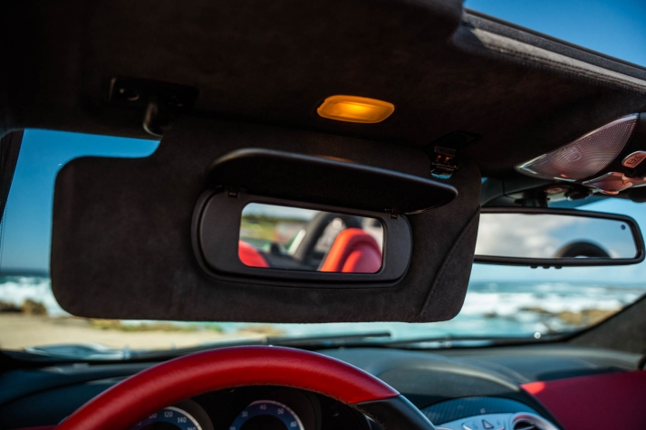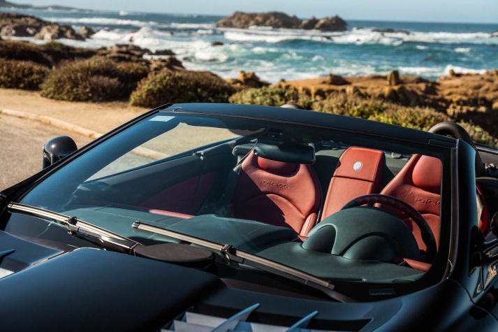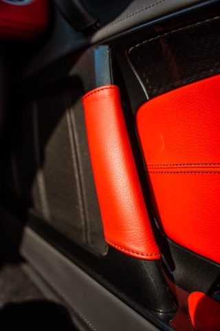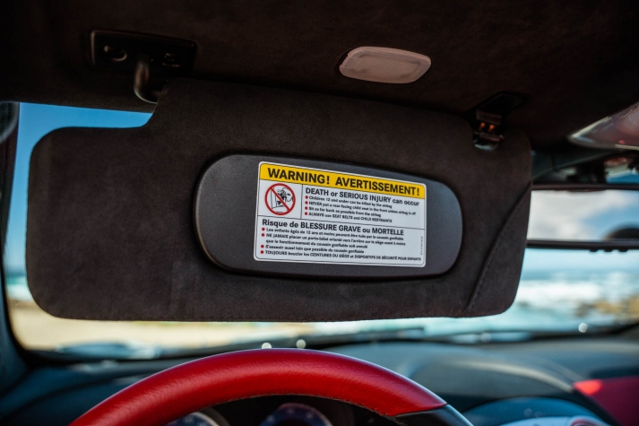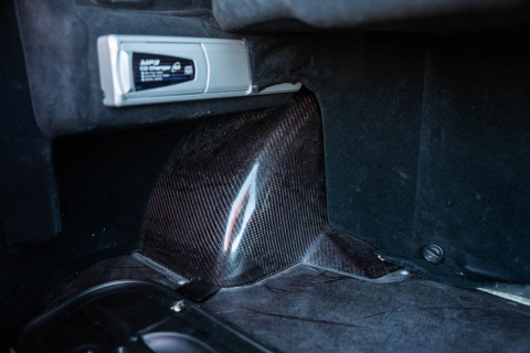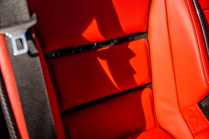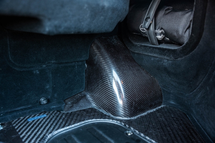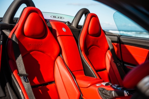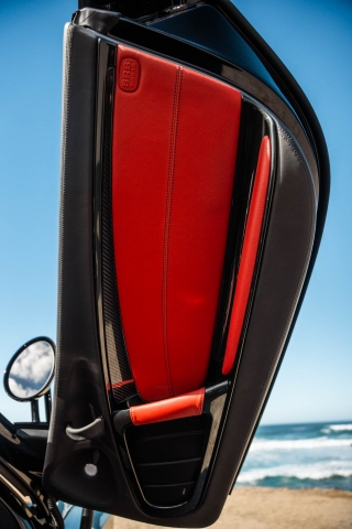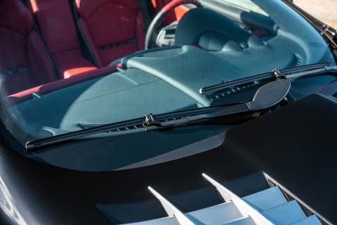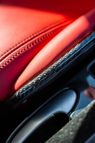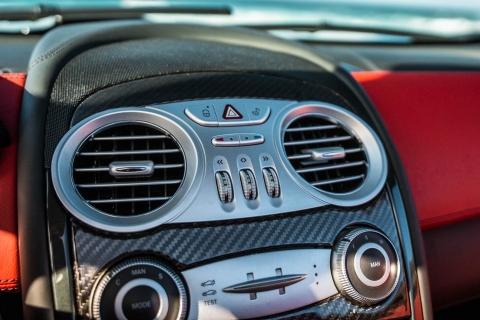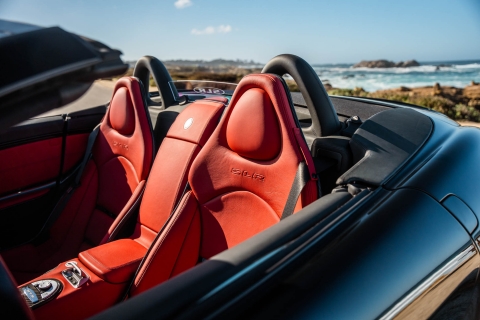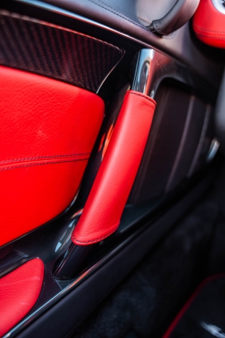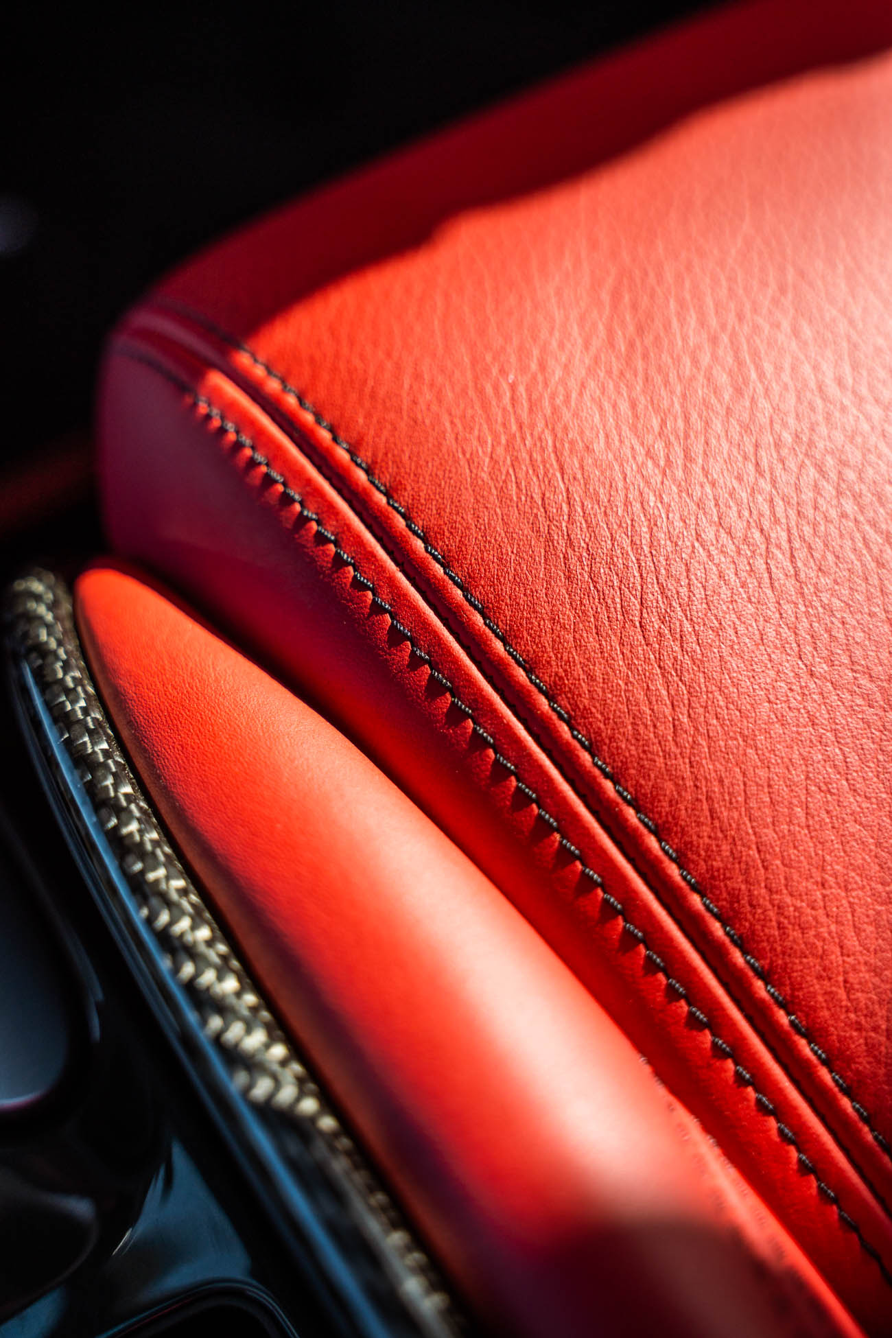300SL Red Silver Arrow leather covers the power-adjustable carbon-fiber seats along with the center console, dashboard, and door panel inserts, while carbon-fiber trim accents the cabin. Additional equipment includes an Alpine head unit, a Bose sound system, a shift knob-mounted starter button, a wind deflector, and dual-zone automatic climate control.