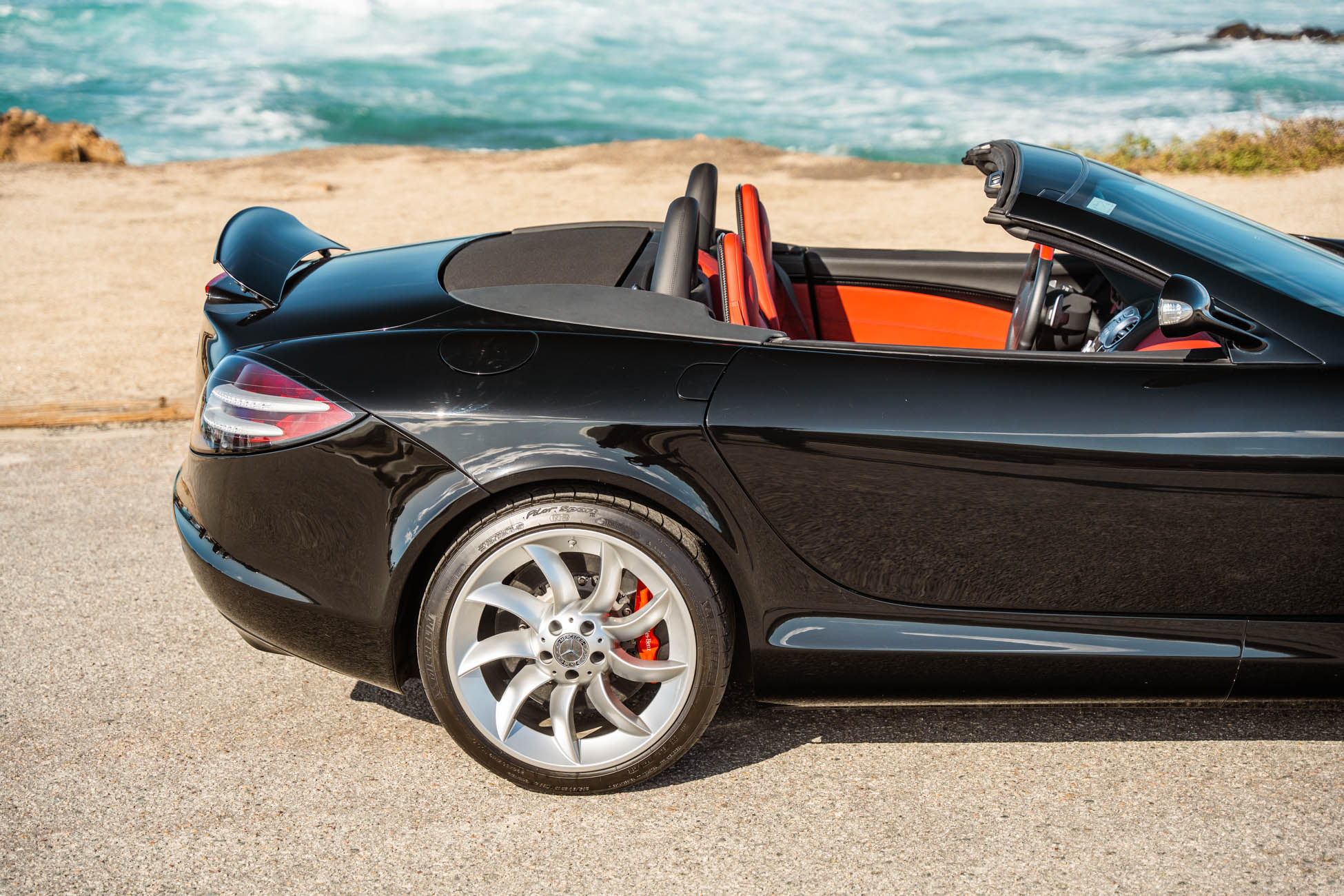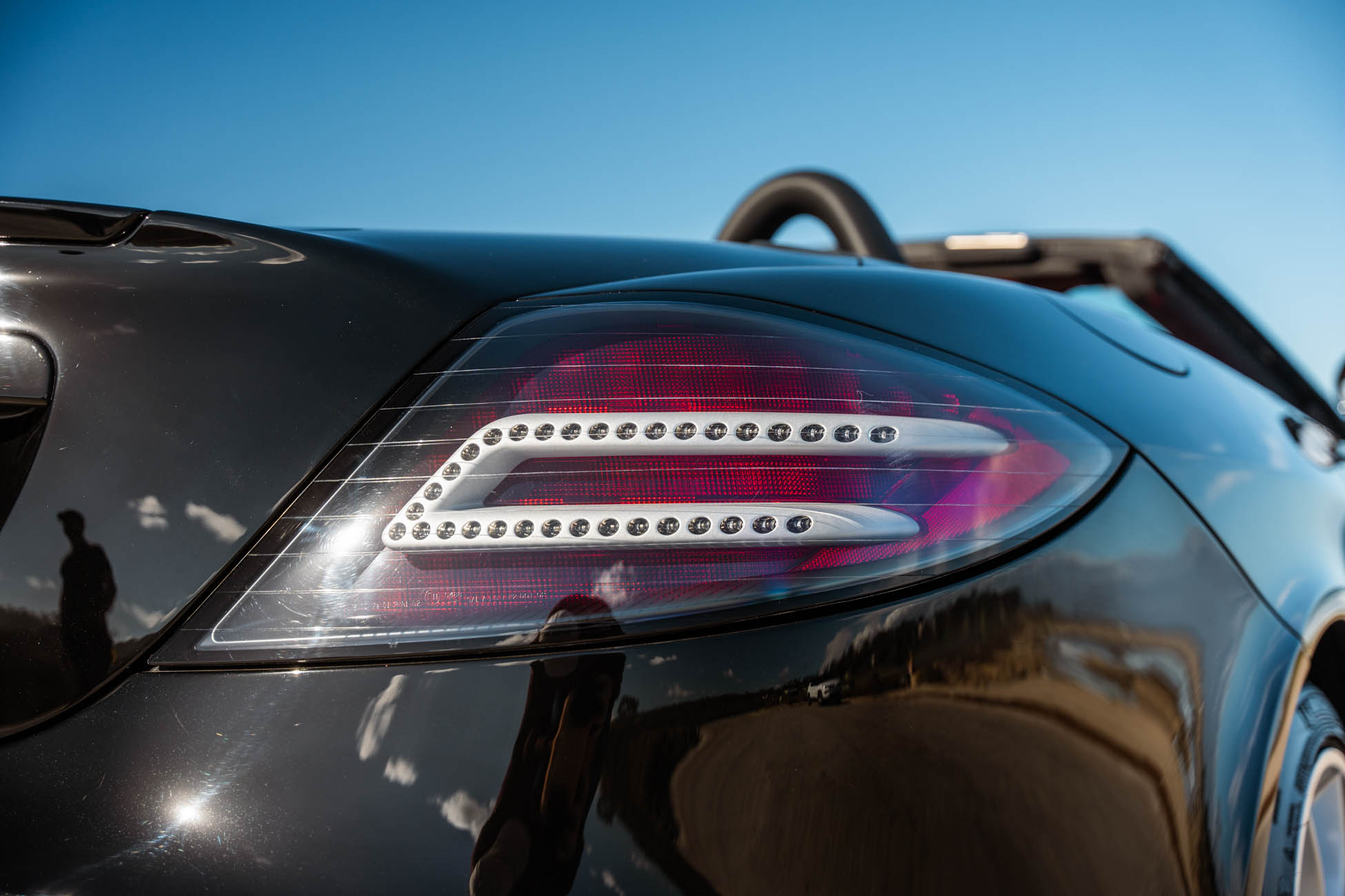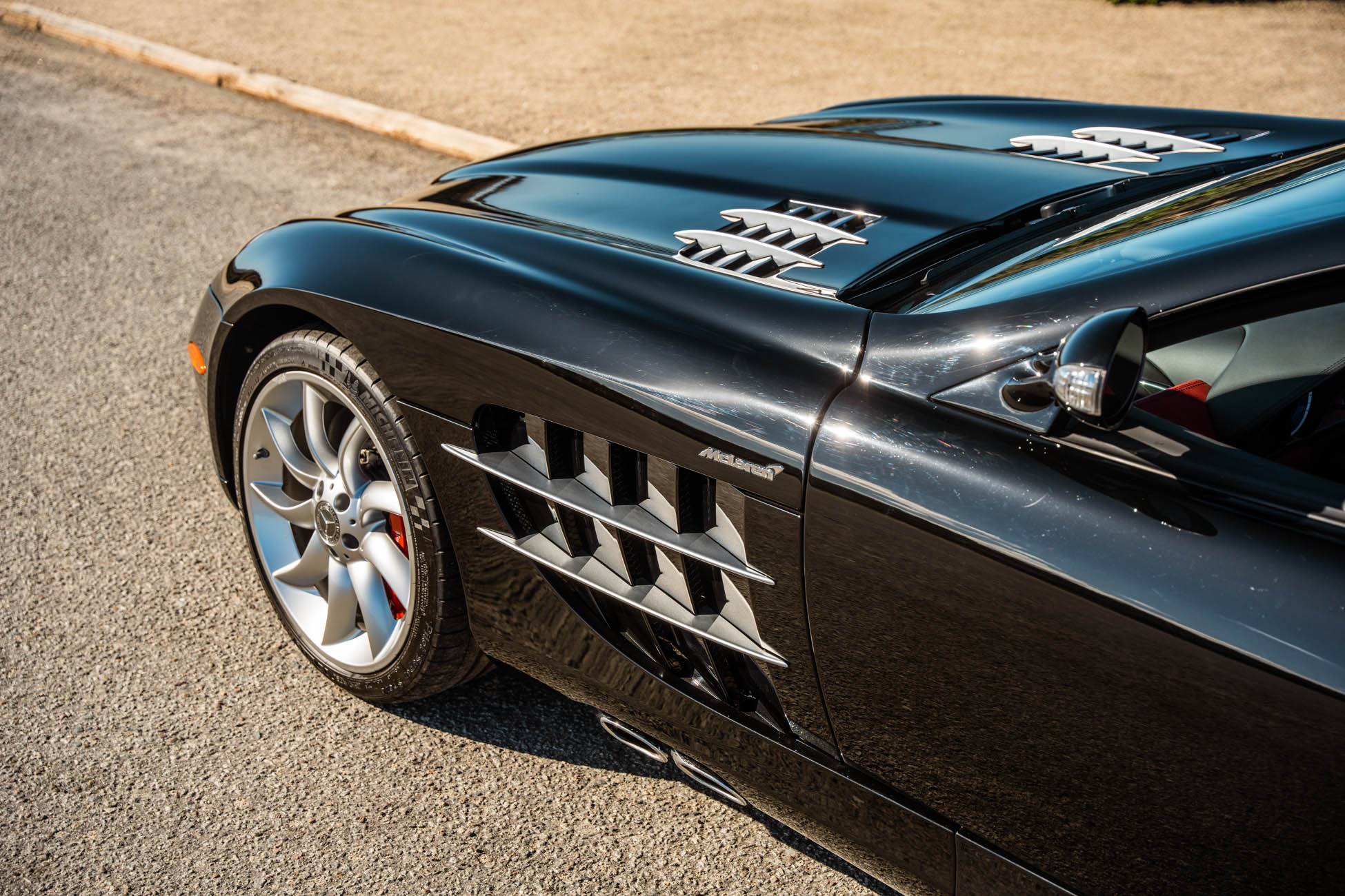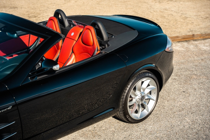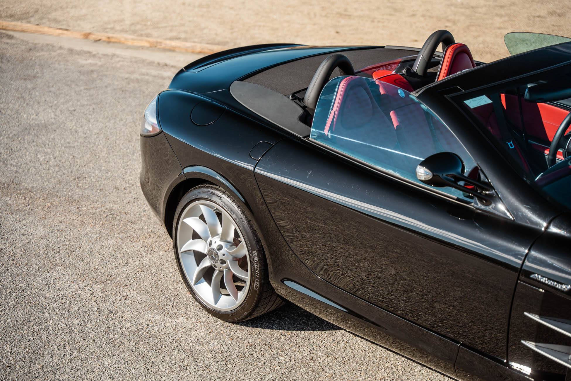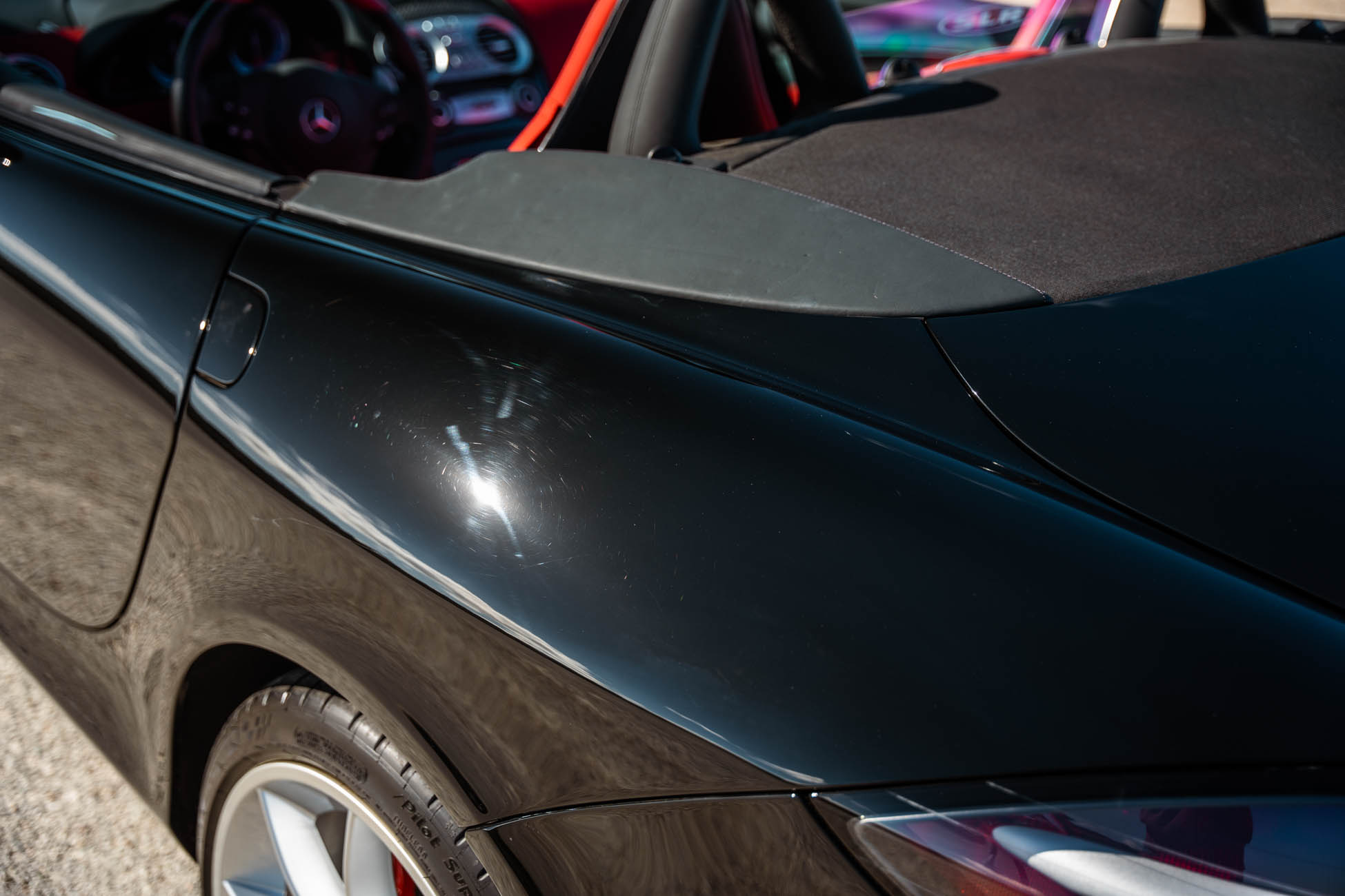The SLR was built with a carbon-fiber monocoque and crash structures. This example is finished in Pure Black and features upward-opening butterfly doors, an Anthracite Black convertible soft top, xenon headlights, integrated fog lights, heated side mirrors, twin side-exit exhaust outlets behind each front wheel, and an electronically deployed rear spoiler air brake. The seller notes an area of paint touch-ups, and close-up photographs of the exterior finish and trim are shown in the gallery below.