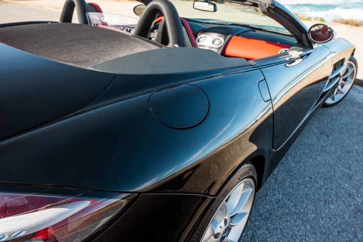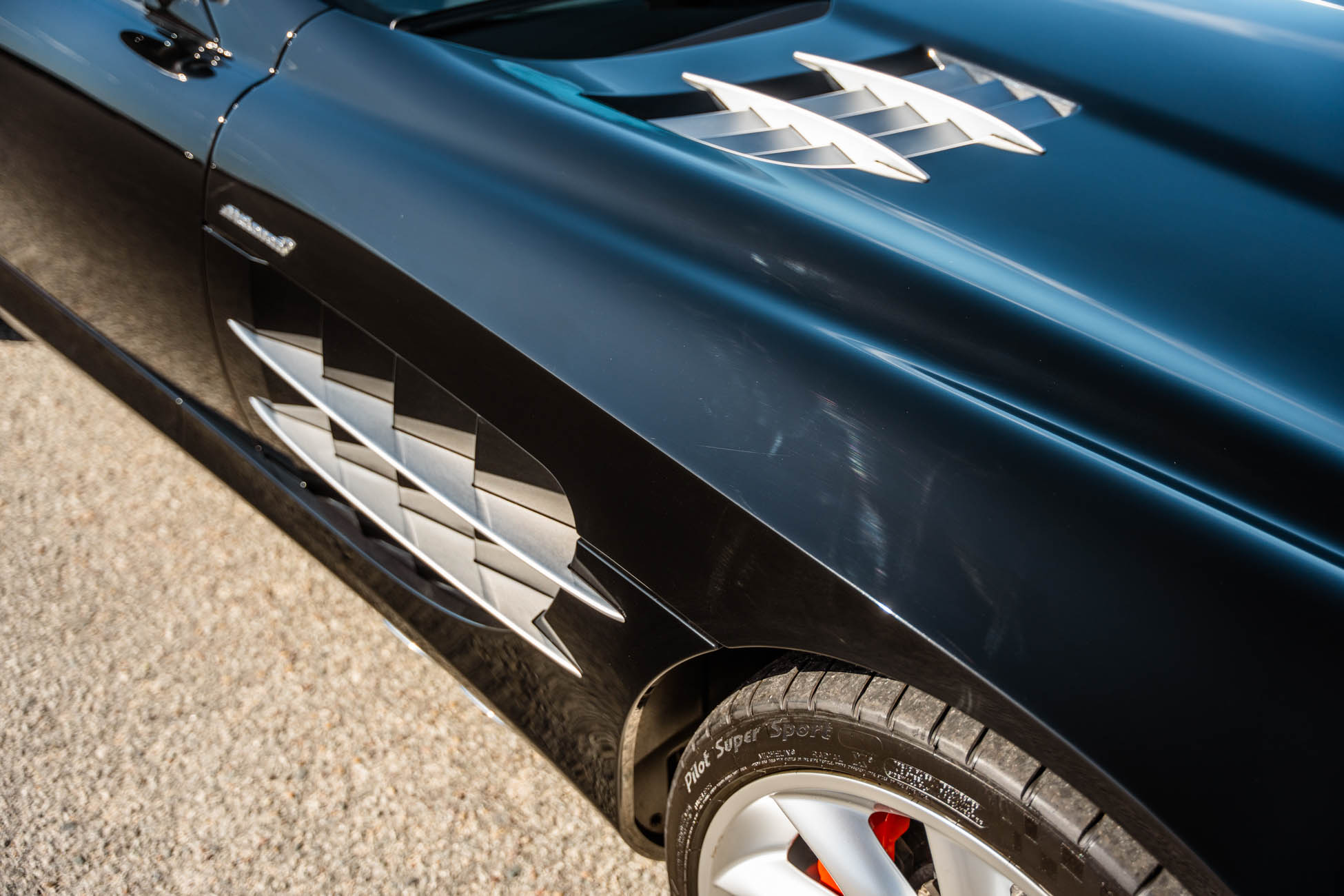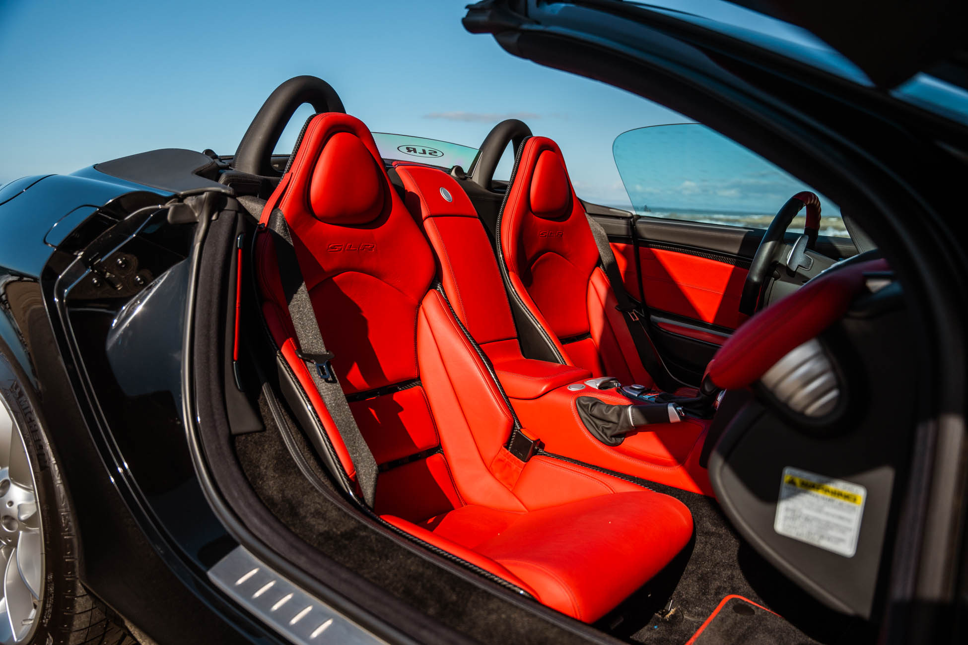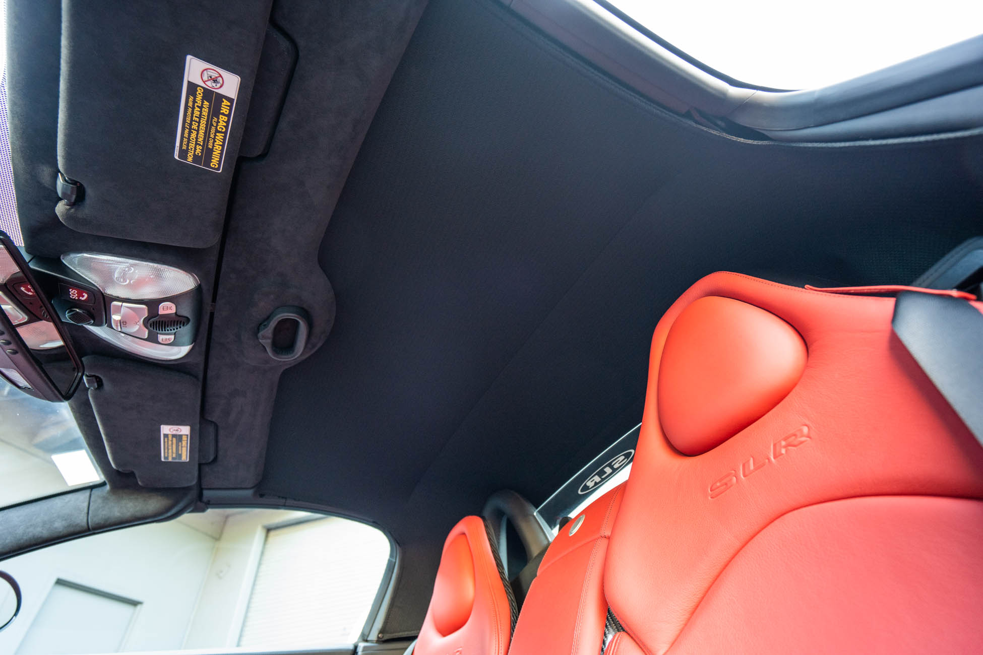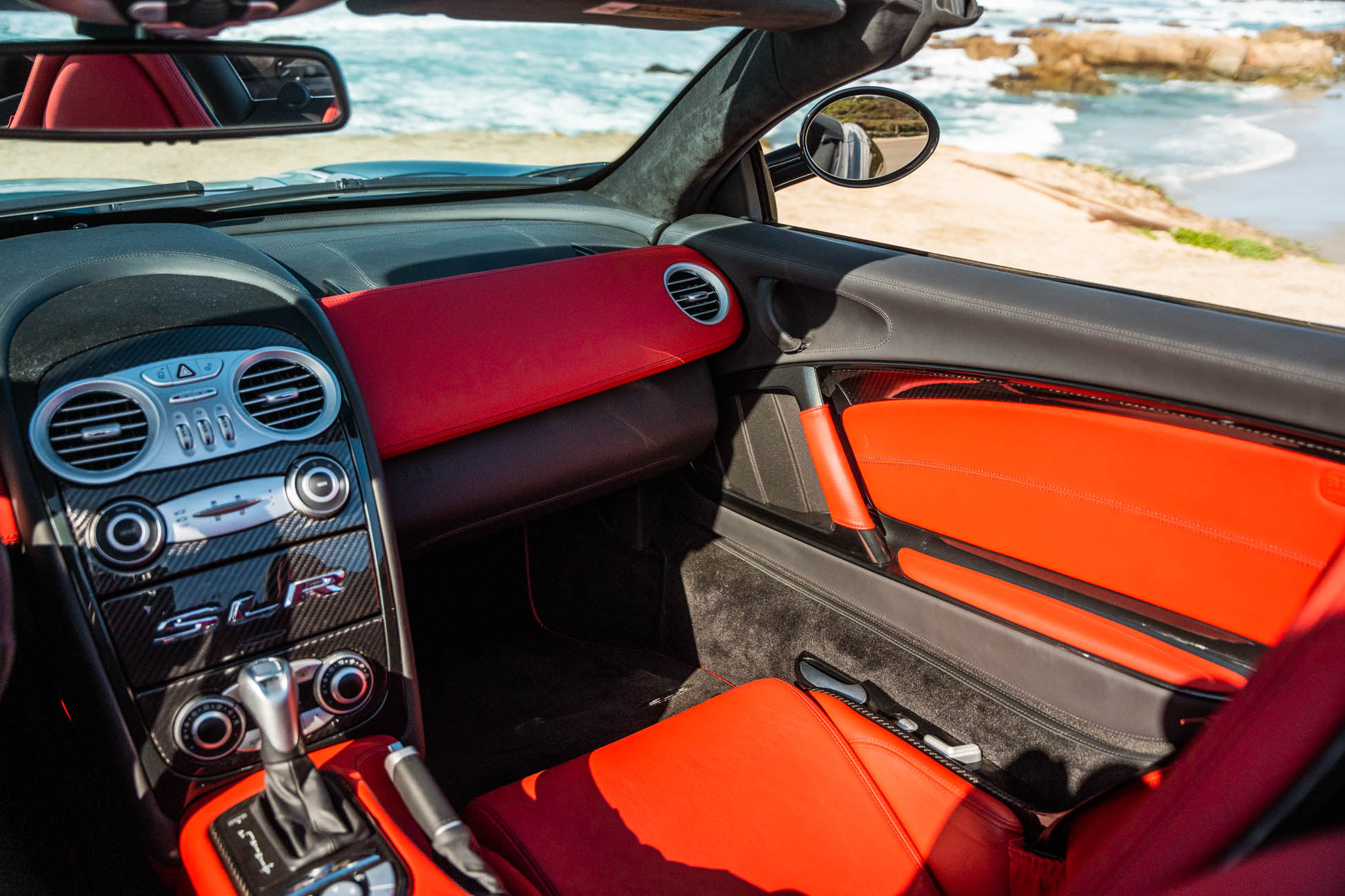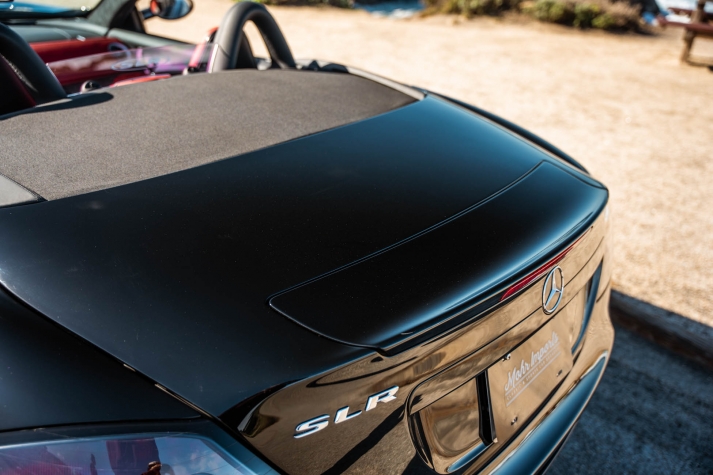 The SLR was built with a carbon-fiber monocoque and crash structures. This example is finished in Pure Black and features upward-opening butterfly doors, an Anthracite Black convertible soft top, xenon headlights, integrated fog lights, heated side mirrors, twin side-exit exhaust outlets behind each front wheel, and an electronically deployed rear spoiler air brake. The seller notes an area of paint touch-ups, and close-up photographs of the exterior finish and trim are shown in the gallery below.