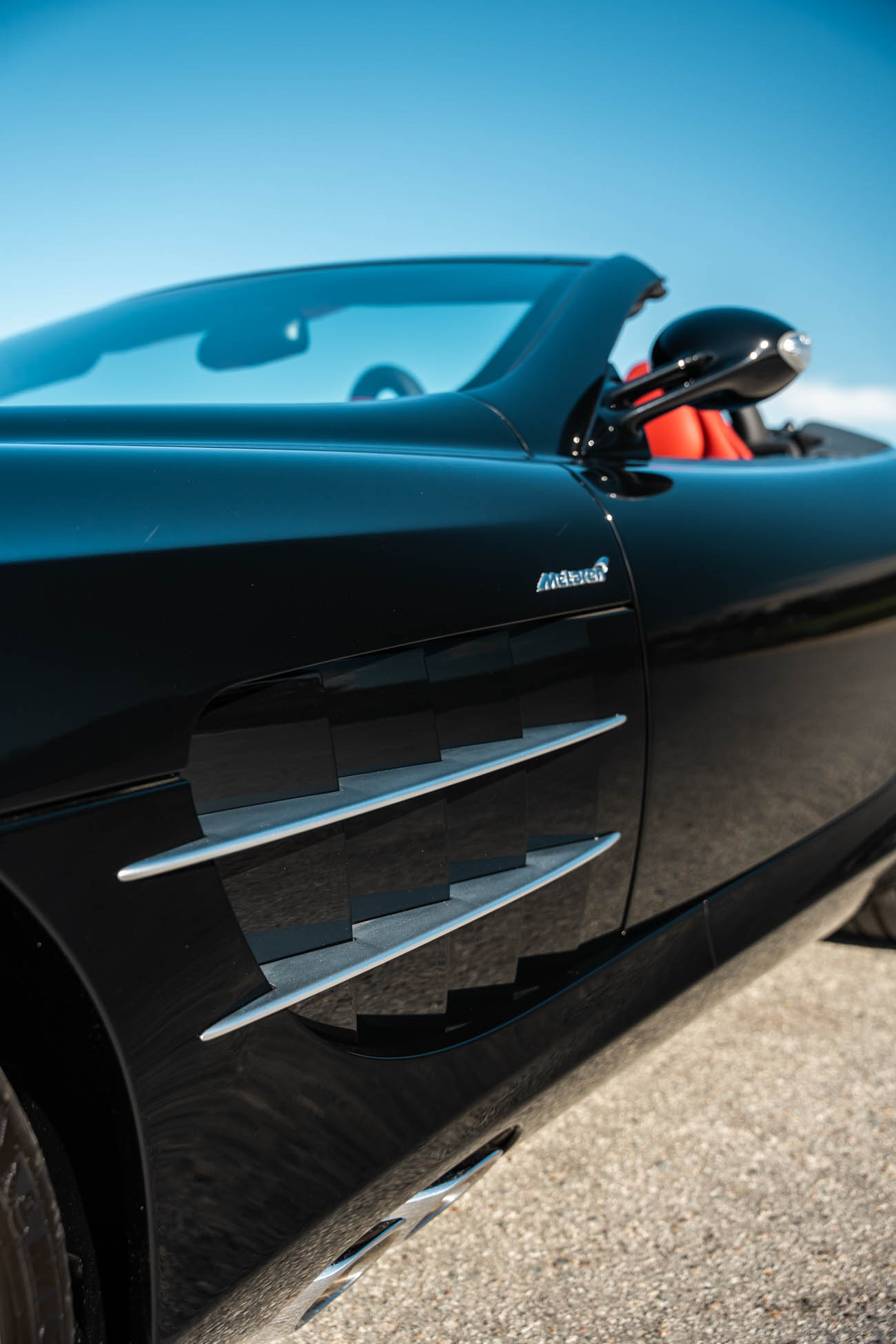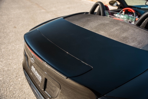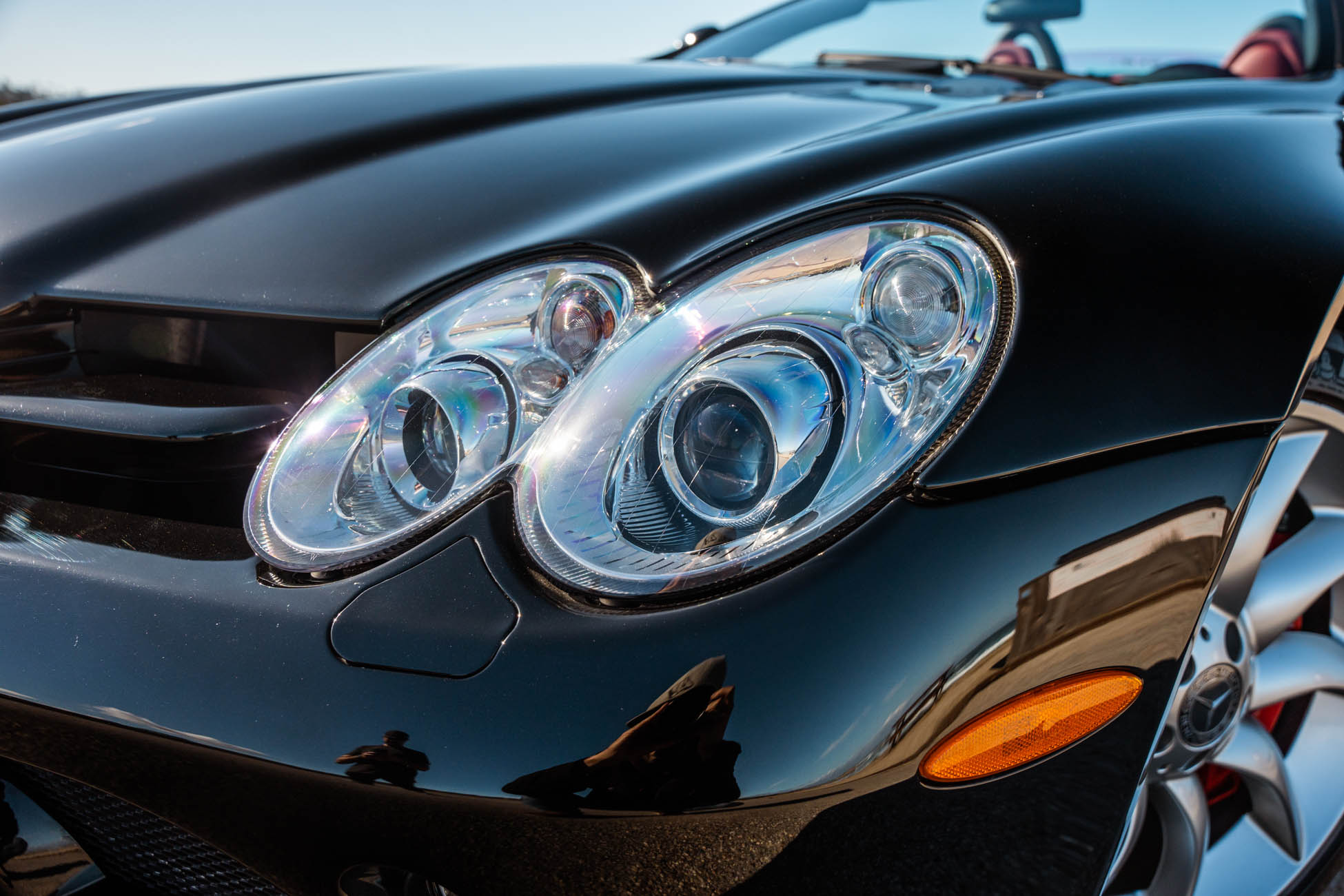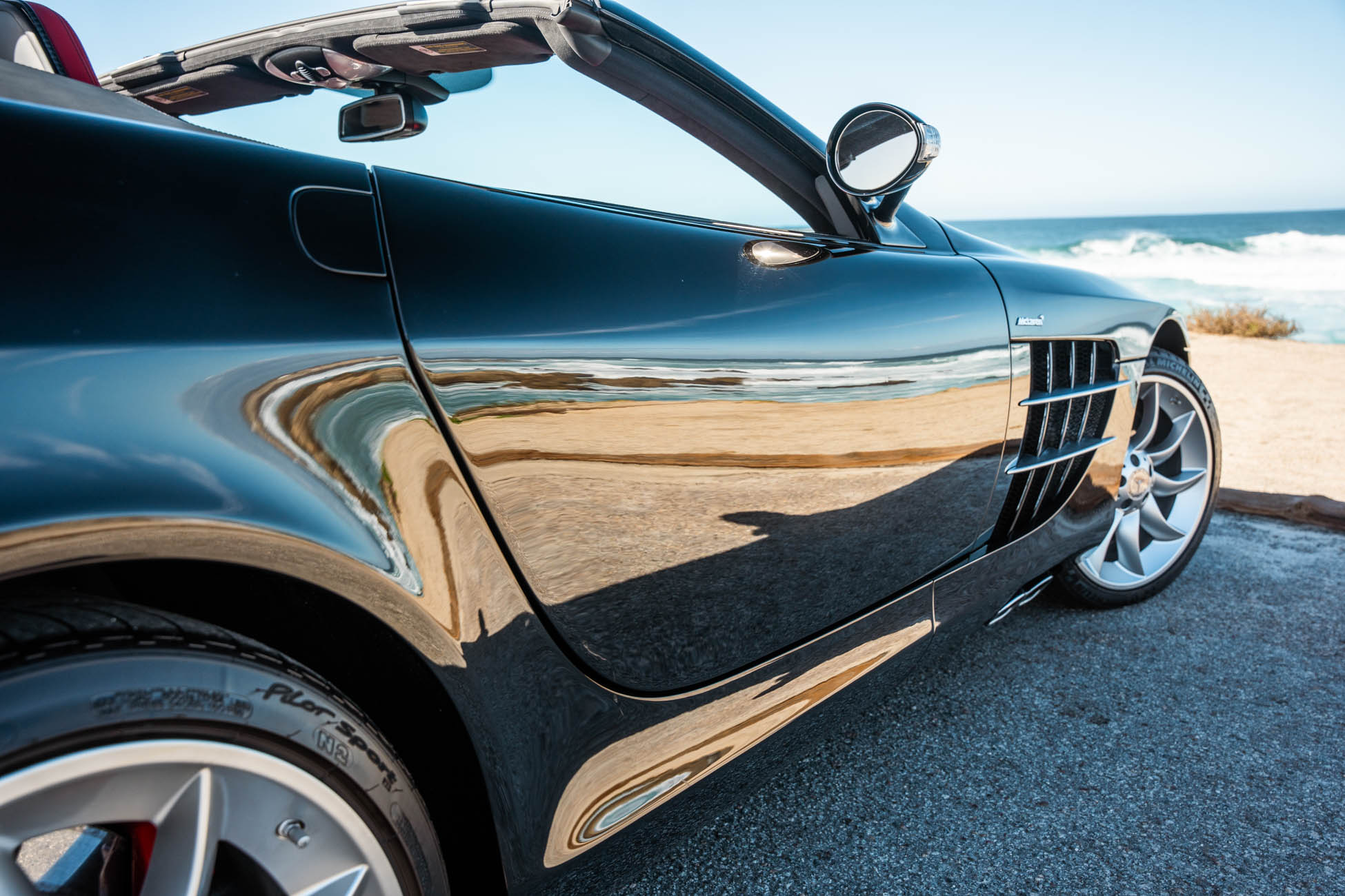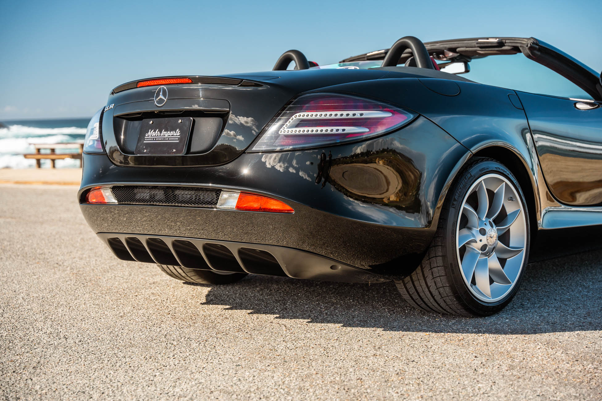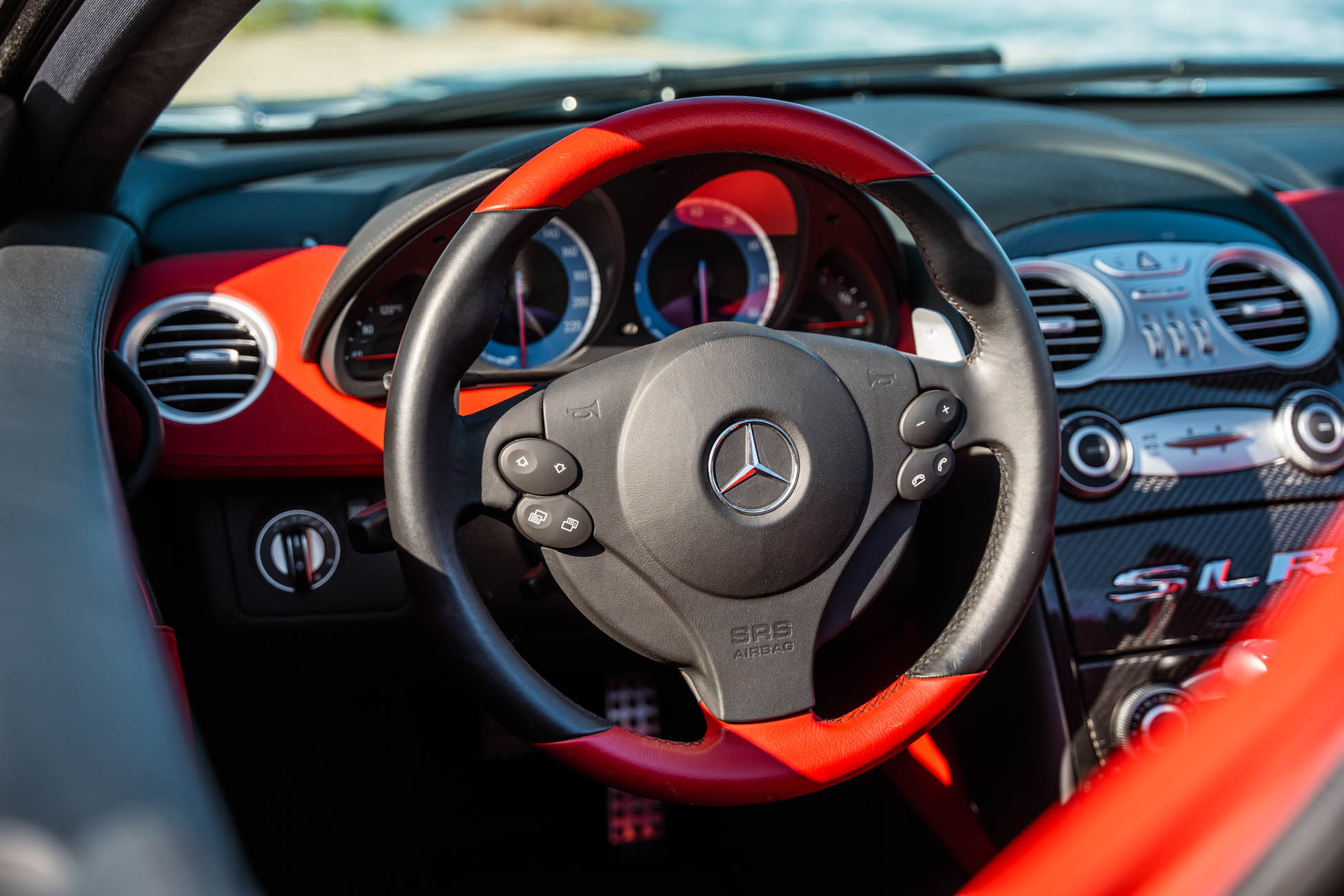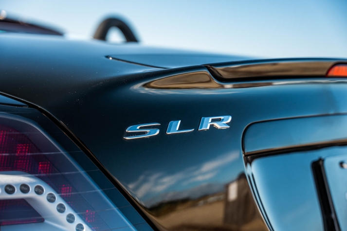 The SLR was built with a carbon-fiber monocoque and crash structures. This example is finished in Pure Black and features upward-opening butterfly doors, an Anthracite Black convertible soft top, xenon headlights, integrated fog lights, heated side mirrors, twin side-exit exhaust outlets behind each front wheel, and an electronically deployed rear spoiler air brake. The seller notes an area of paint touch-ups, and close-up photographs of the exterior finish and trim are shown in the gallery below.