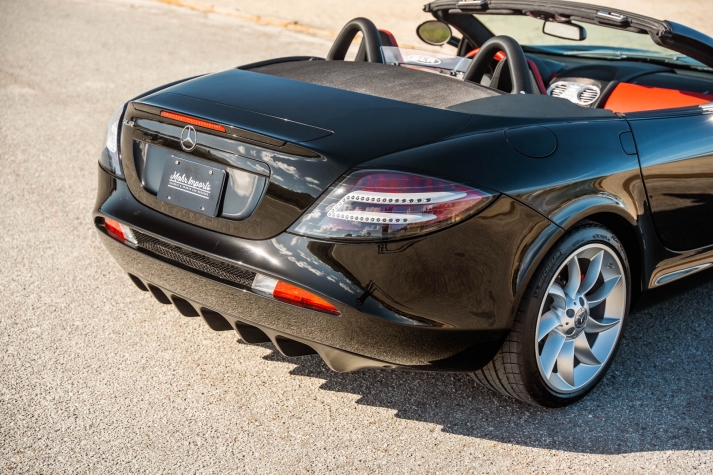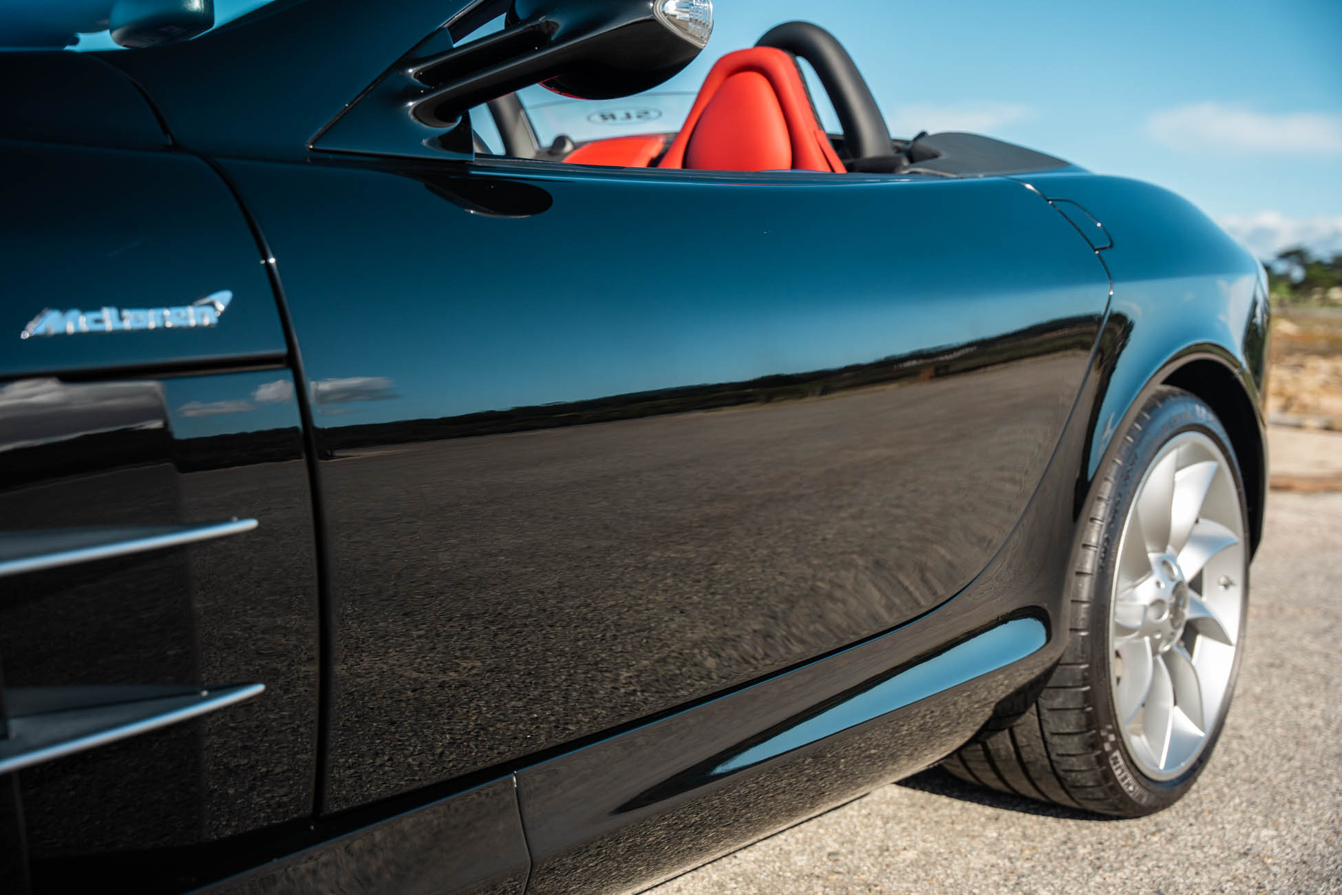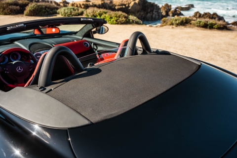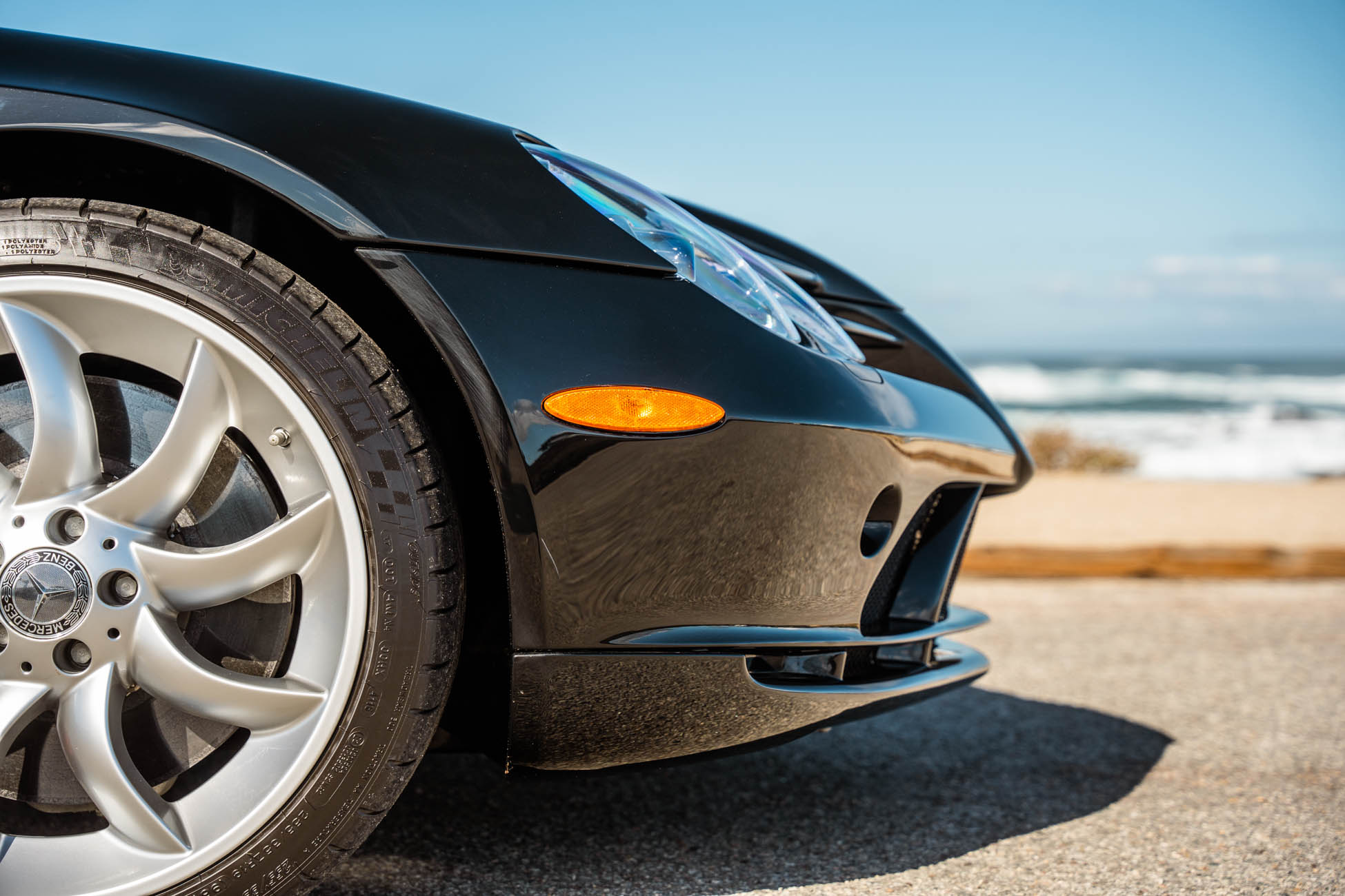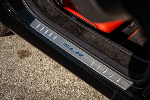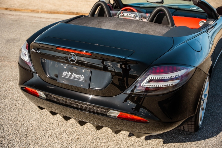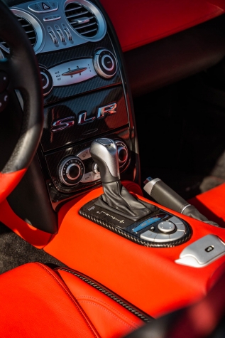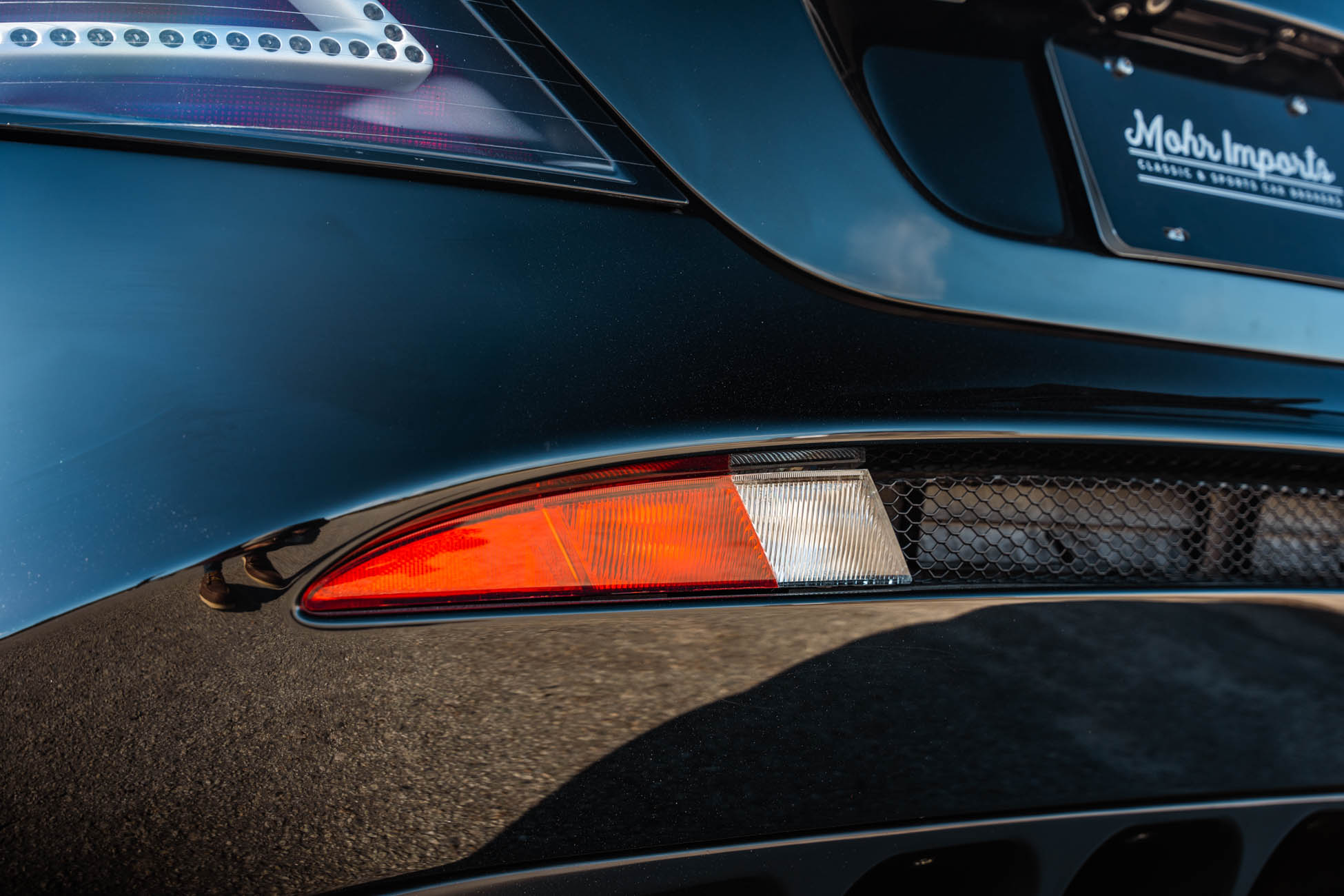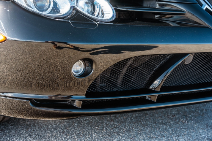 The SLR was built with a carbon-fiber monocoque and crash structures. This example is finished in Pure Black and features upward-opening butterfly doors, an Anthracite Black convertible soft top, xenon headlights, integrated fog lights, heated side mirrors, twin side-exit exhaust outlets behind each front wheel, and an electronically deployed rear spoiler air brake. The seller notes an area of paint touch-ups, and close-up photographs of the exterior finish and trim are shown in the gallery below.