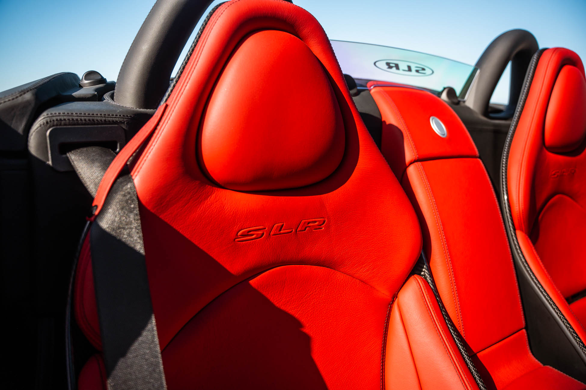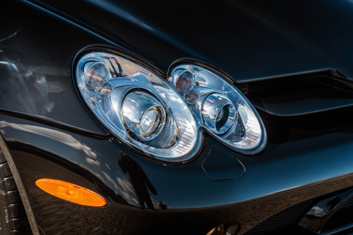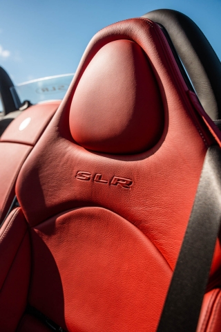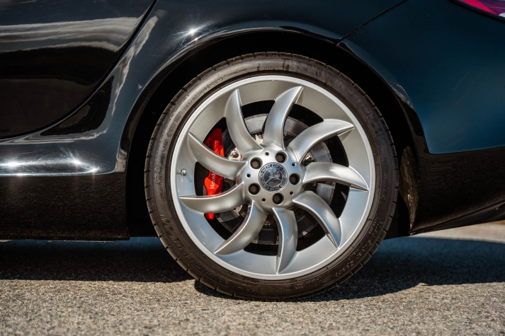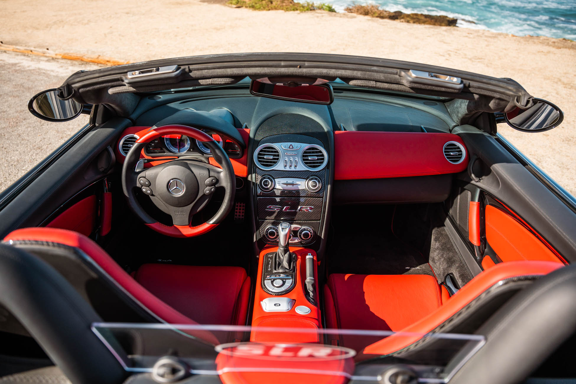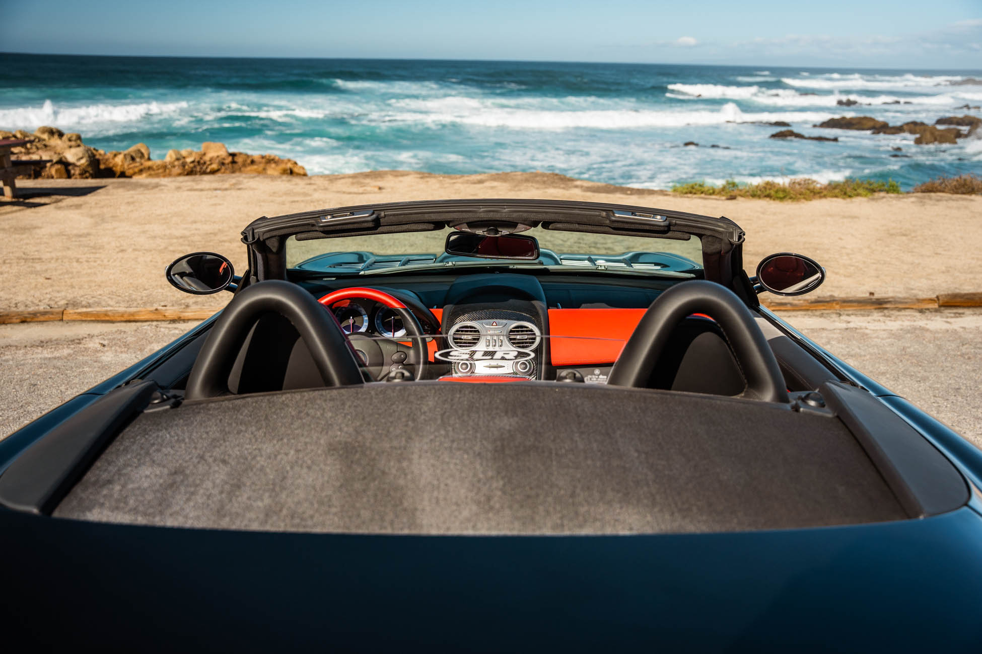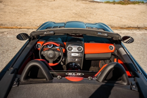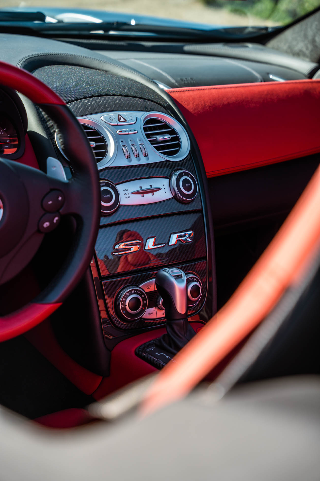 The SLR was built with a carbon-fiber monocoque and crash structures. This example is finished in Pure Black and features upward-opening butterfly doors, an Anthracite Black convertible soft top, xenon headlights, integrated fog lights, heated side mirrors, twin side-exit exhaust outlets behind each front wheel, and an electronically deployed rear spoiler air brake. The seller notes an area of paint touch-ups, and close-up photographs of the exterior finish and trim are shown in the gallery below.