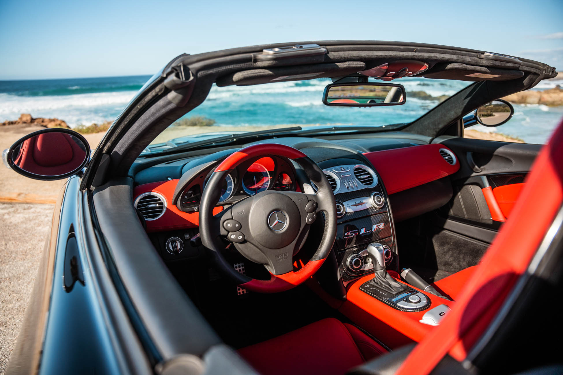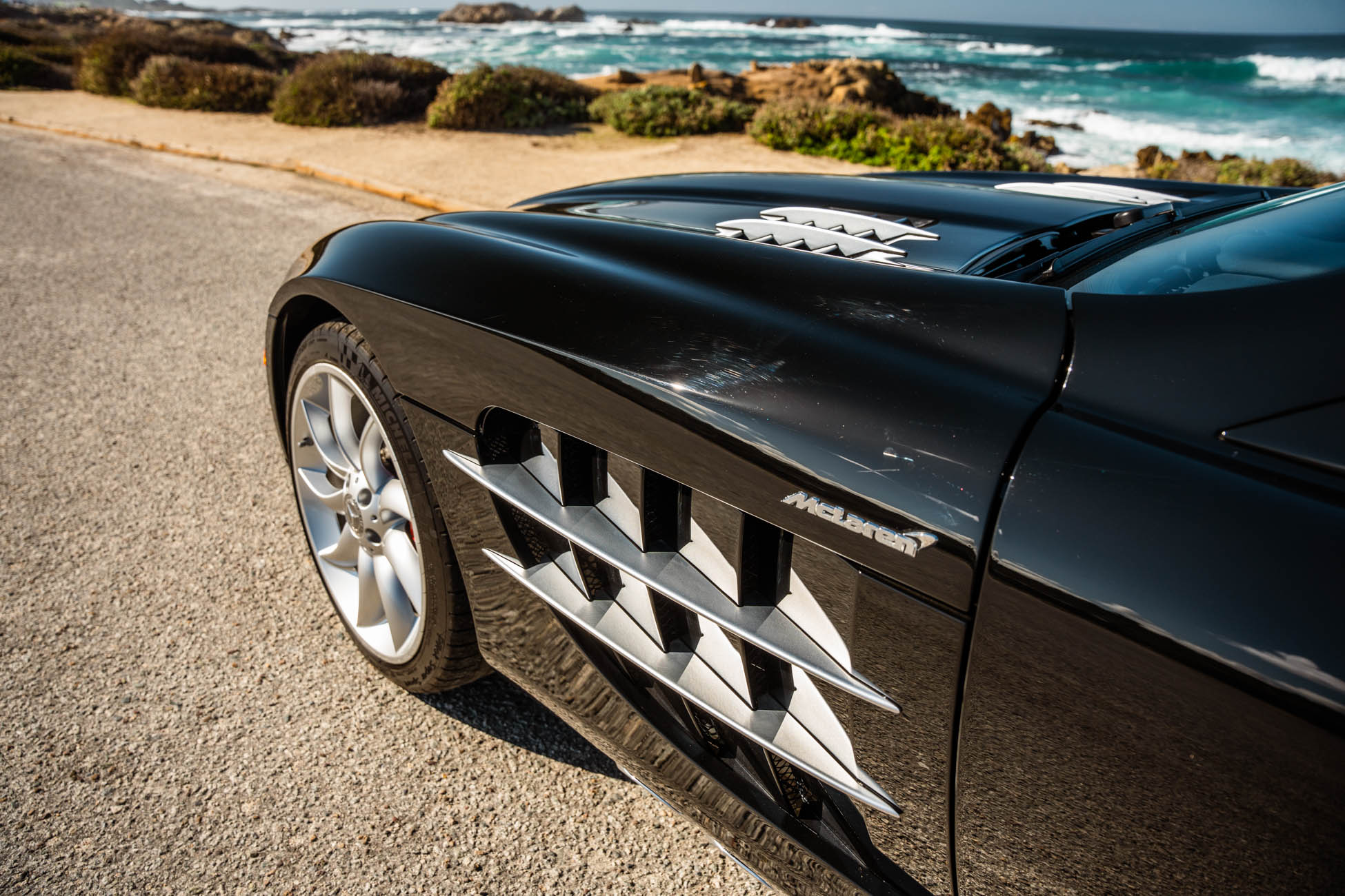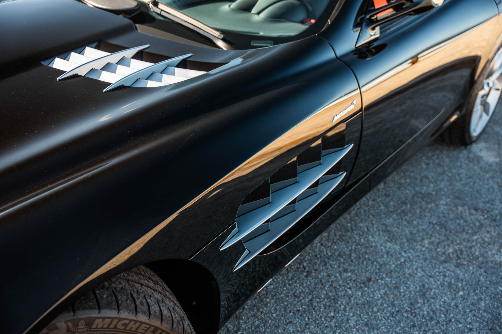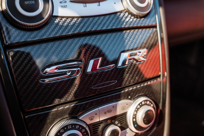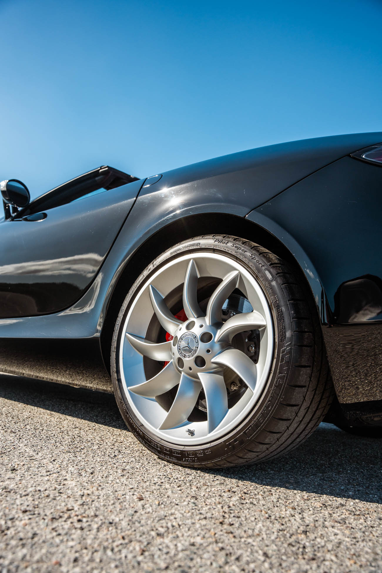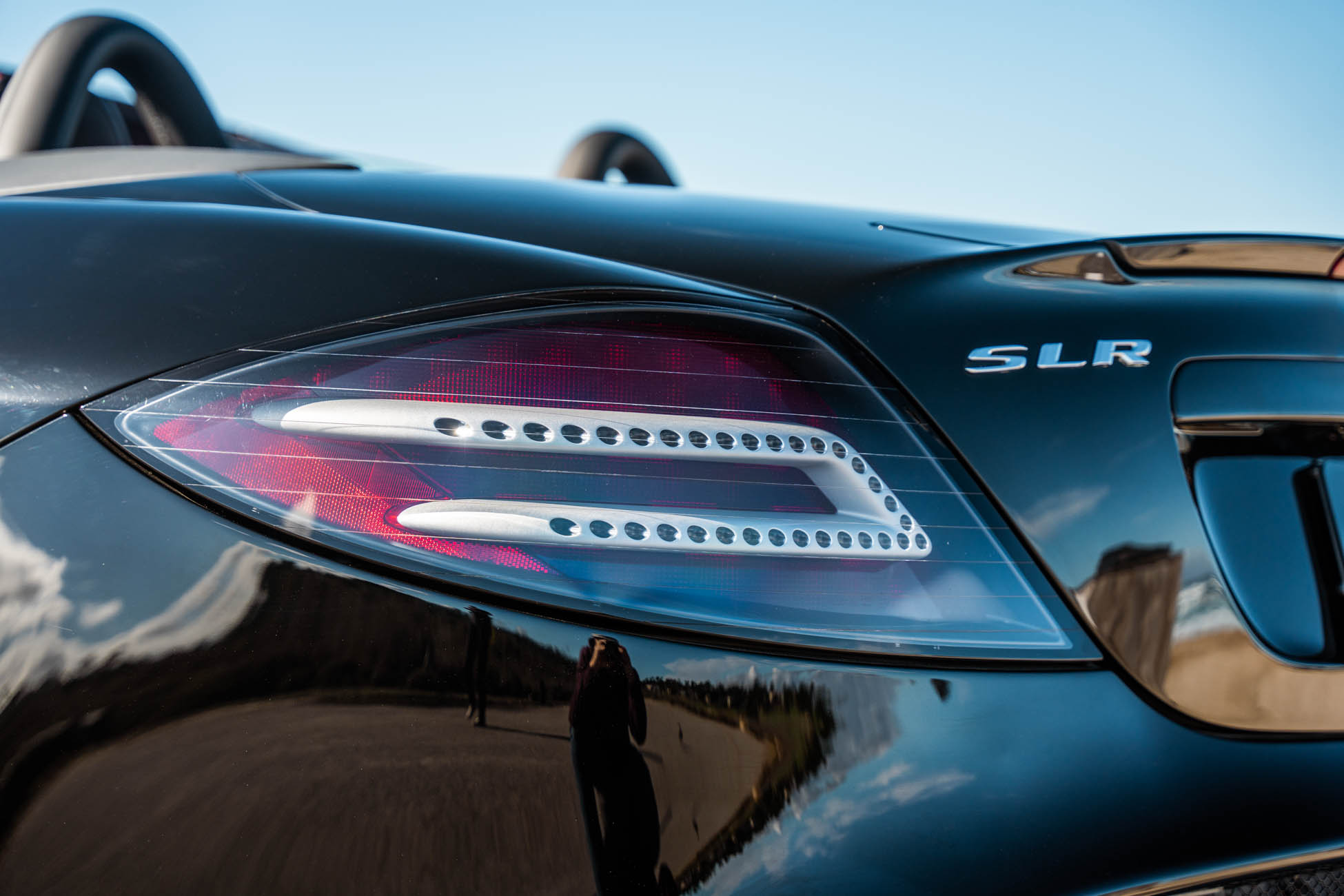 The SLR was built with a carbon-fiber monocoque and crash structures. This example is finished in Pure Black and features upward-opening butterfly doors, an Anthracite Black convertible soft top, xenon headlights, integrated fog lights, heated side mirrors, twin side-exit exhaust outlets behind each front wheel, and an electronically deployed rear spoiler air brake. The seller notes an area of paint touch-ups, and close-up photographs of the exterior finish and trim are shown in the gallery below.