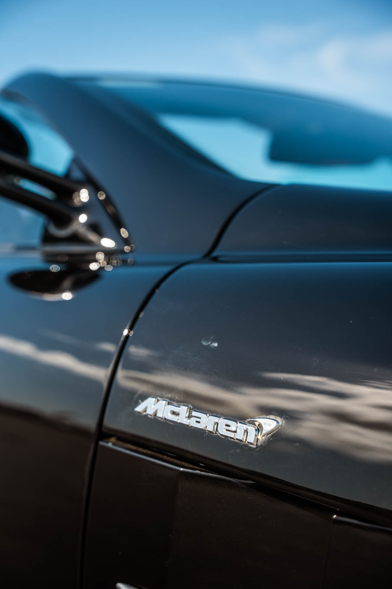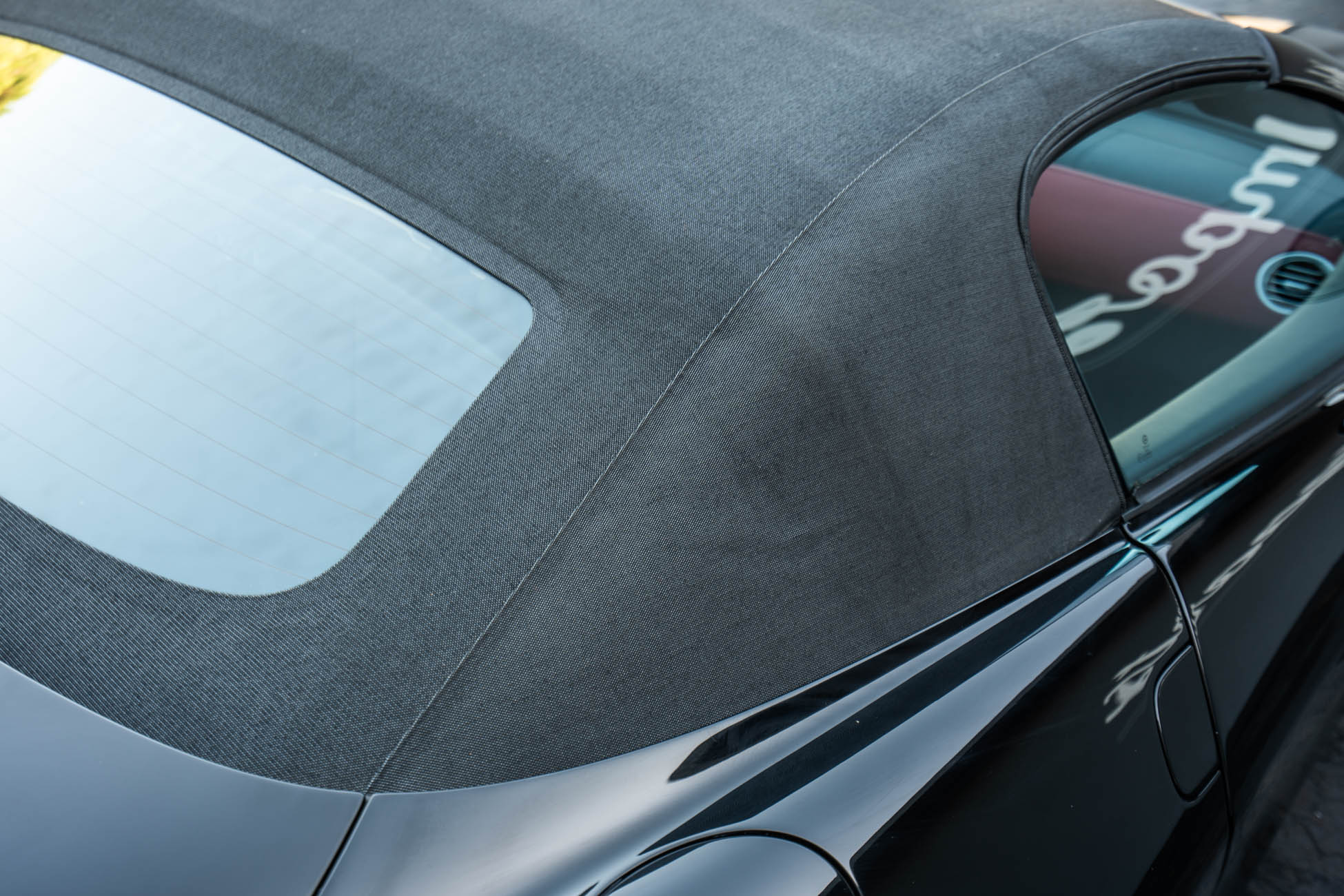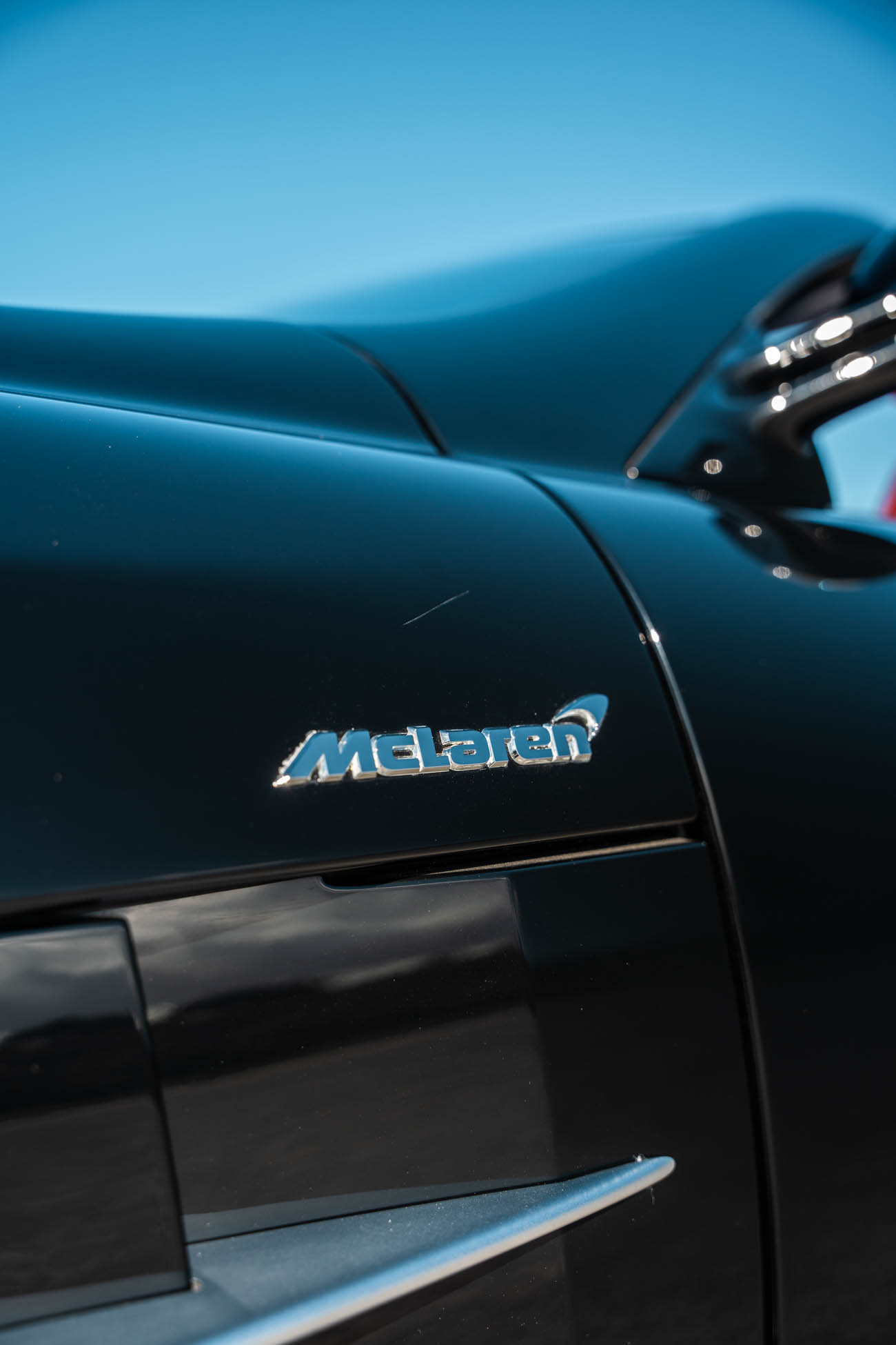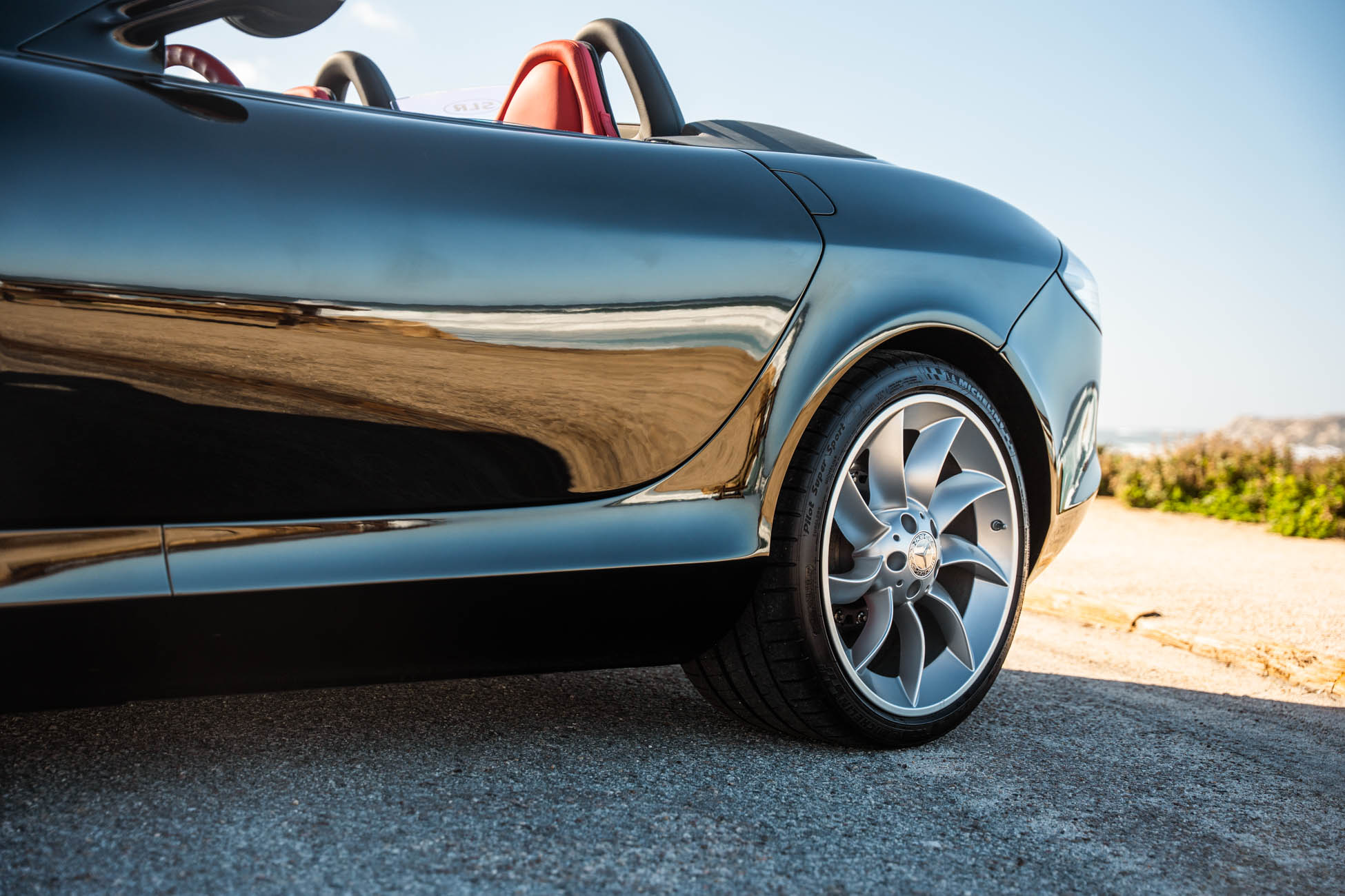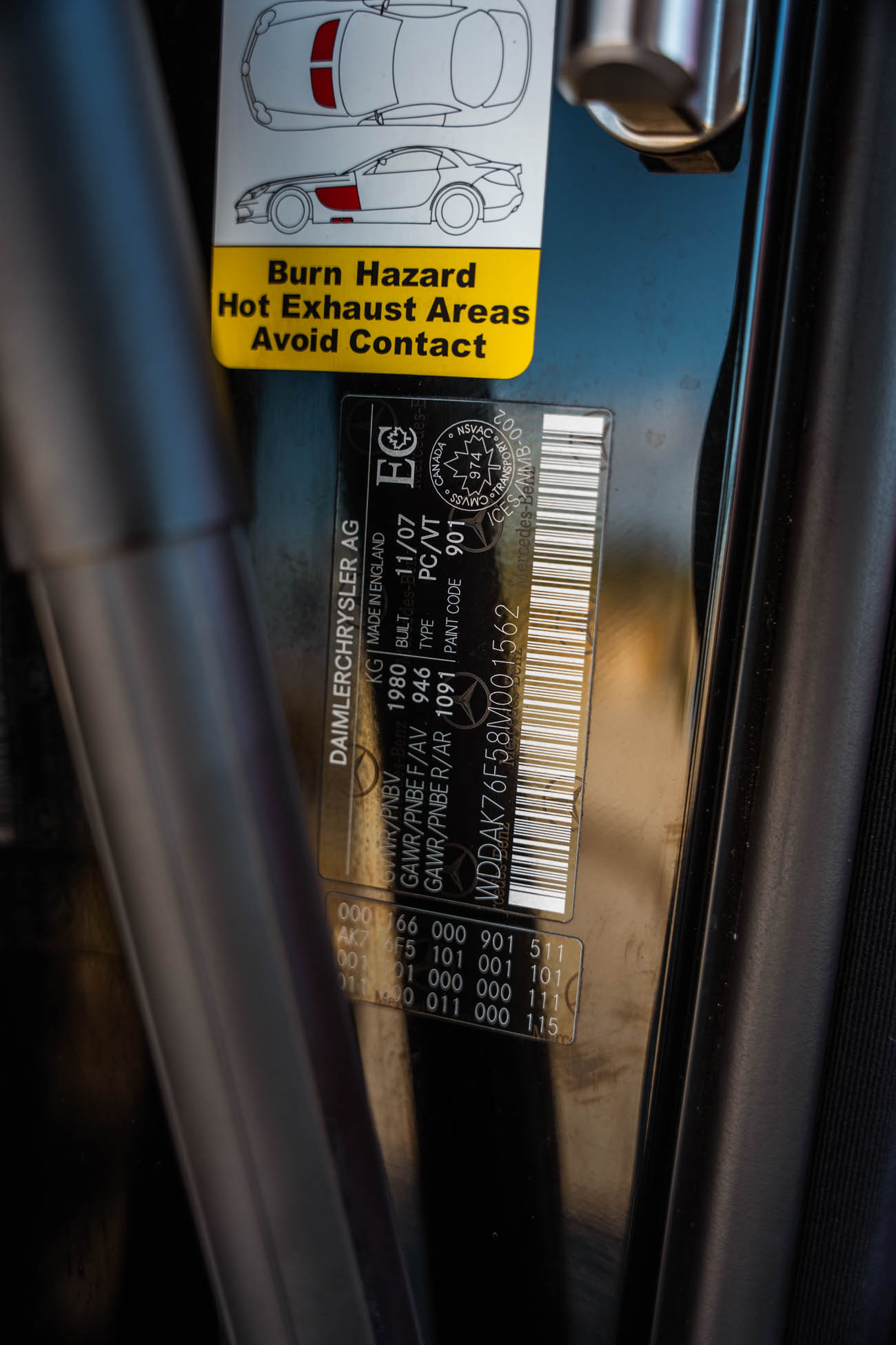 The SLR was built with a carbon-fiber monocoque and crash structures. This example is finished in Pure Black and features upward-opening butterfly doors, an Anthracite Black convertible soft top, xenon headlights, integrated fog lights, heated side mirrors, twin side-exit exhaust outlets behind each front wheel, and an electronically deployed rear spoiler air brake. The seller notes an area of paint touch-ups, and close-up photographs of the exterior finish and trim are shown in the gallery below.