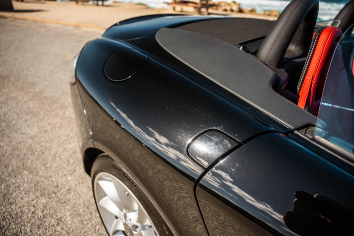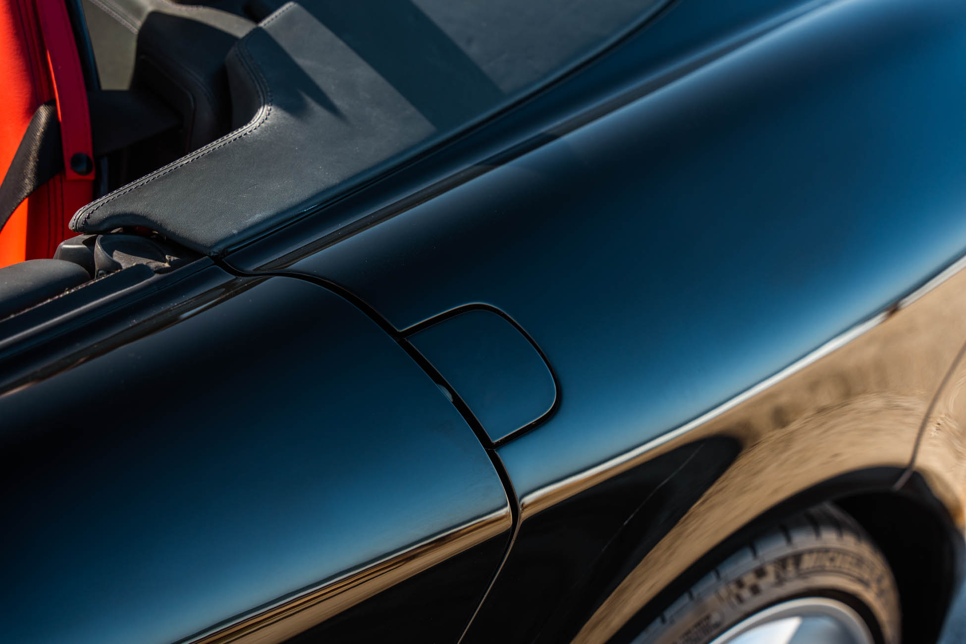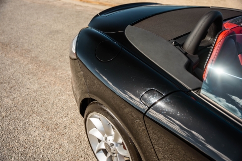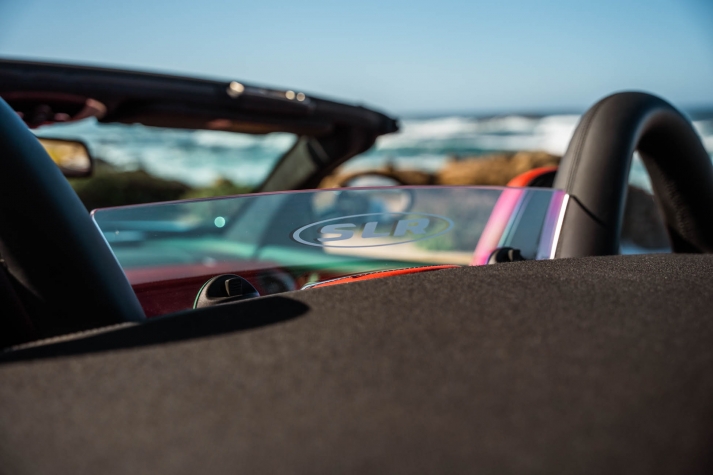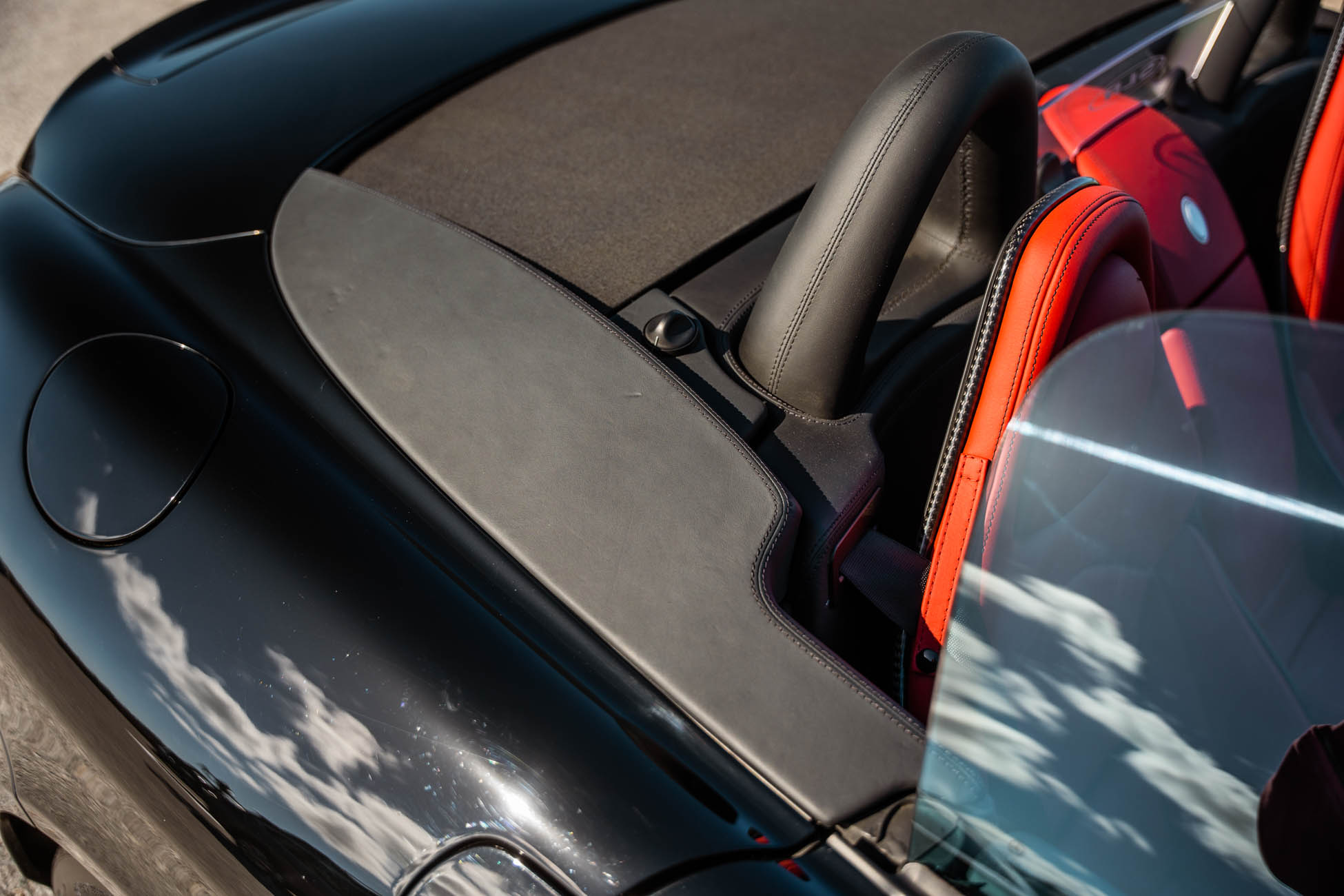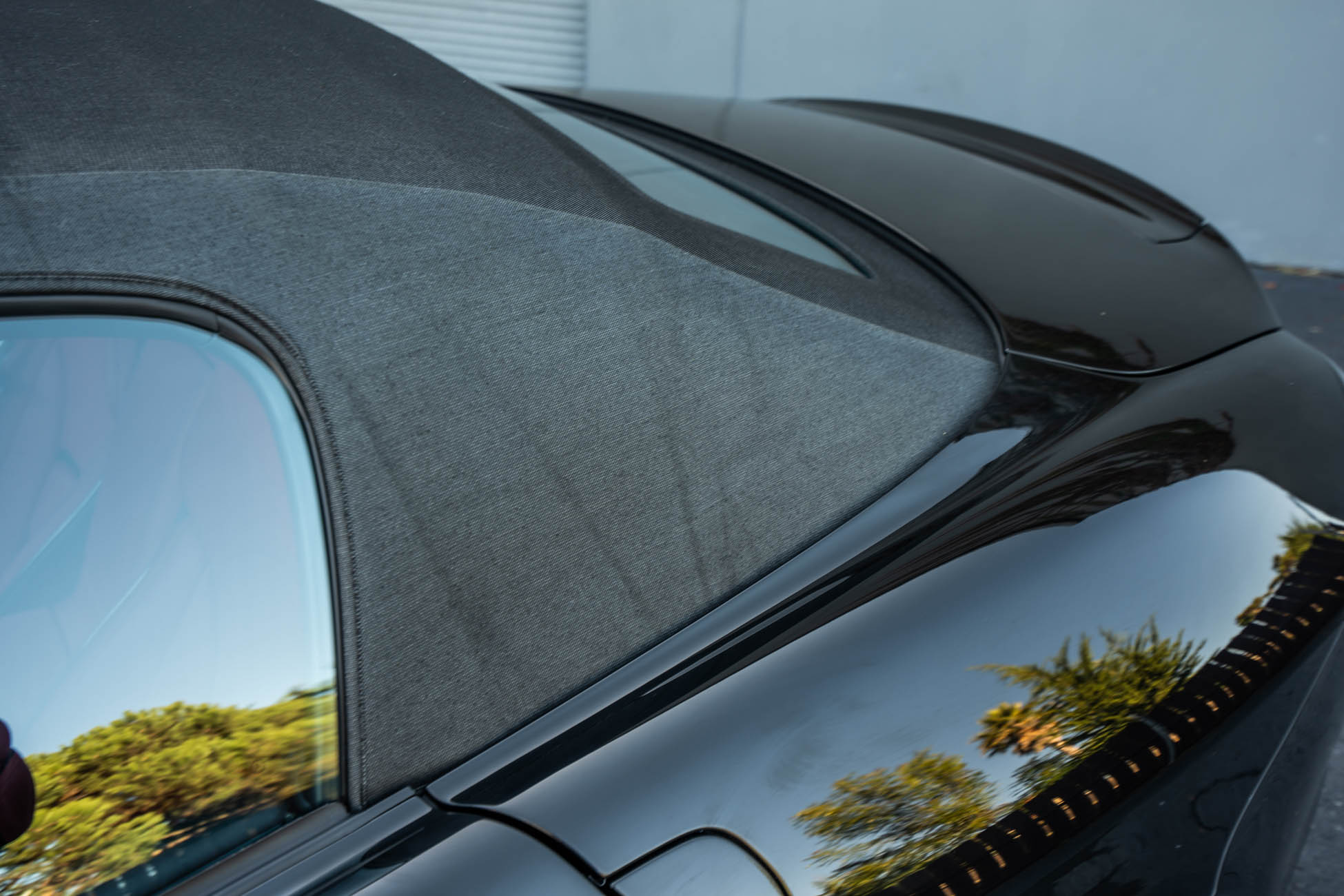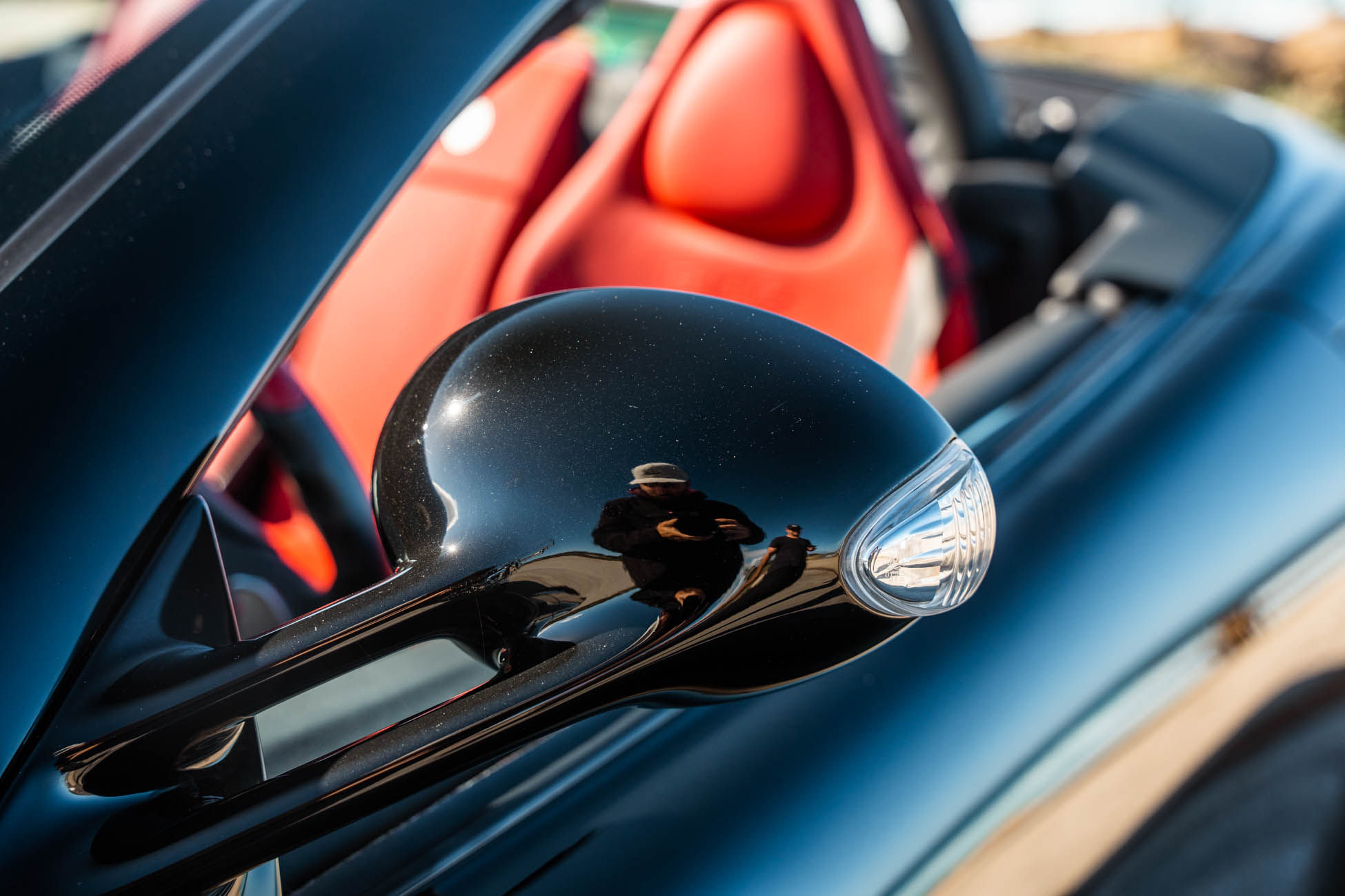 The SLR was built with a carbon-fiber monocoque and crash structures. This example is finished in Pure Black and features upward-opening butterfly doors, an Anthracite Black convertible soft top, xenon headlights, integrated fog lights, heated side mirrors, twin side-exit exhaust outlets behind each front wheel, and an electronically deployed rear spoiler air brake. The seller notes an area of paint touch-ups, and close-up photographs of the exterior finish and trim are shown in the gallery below.