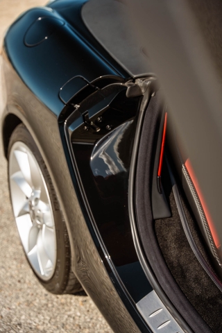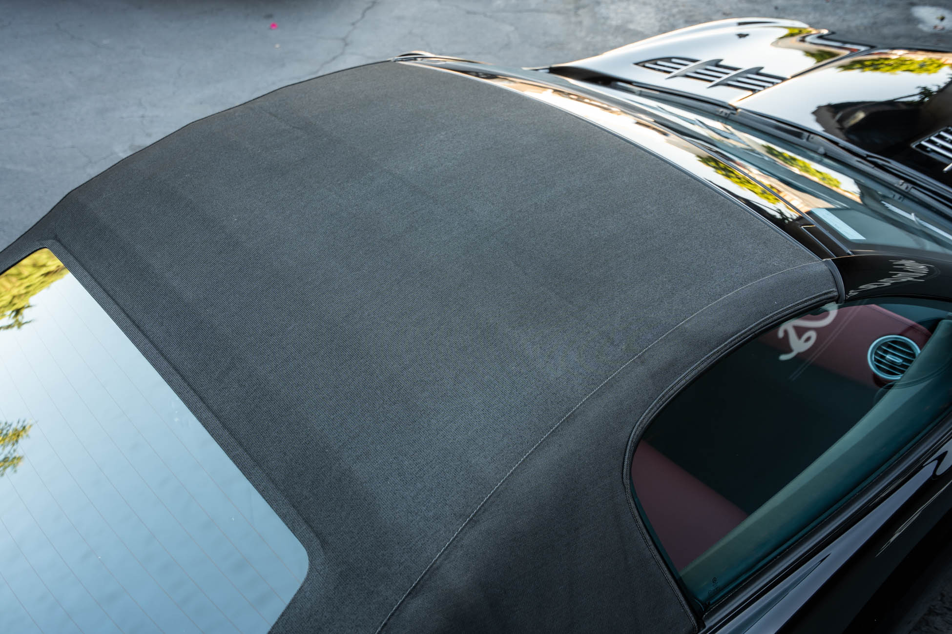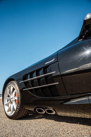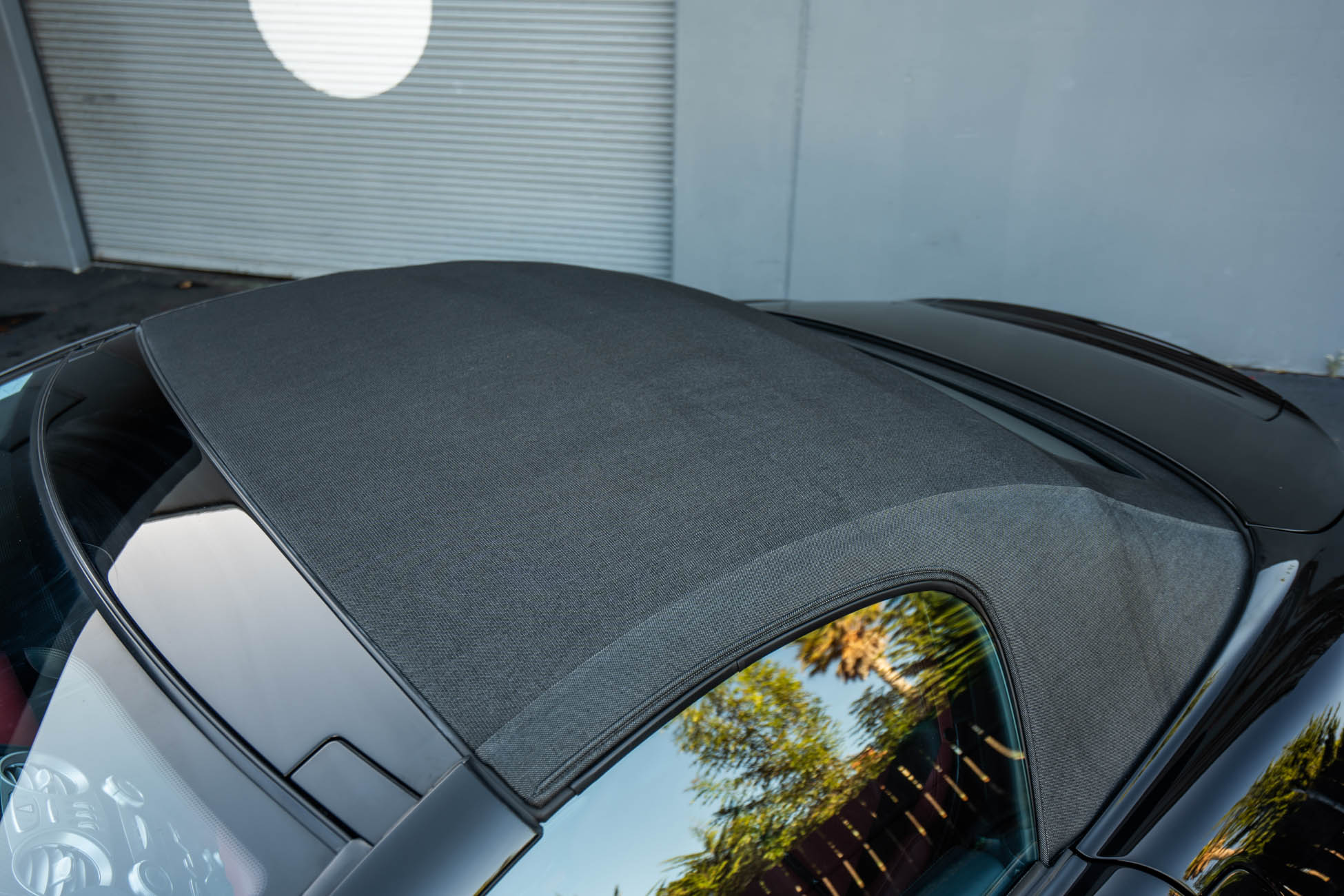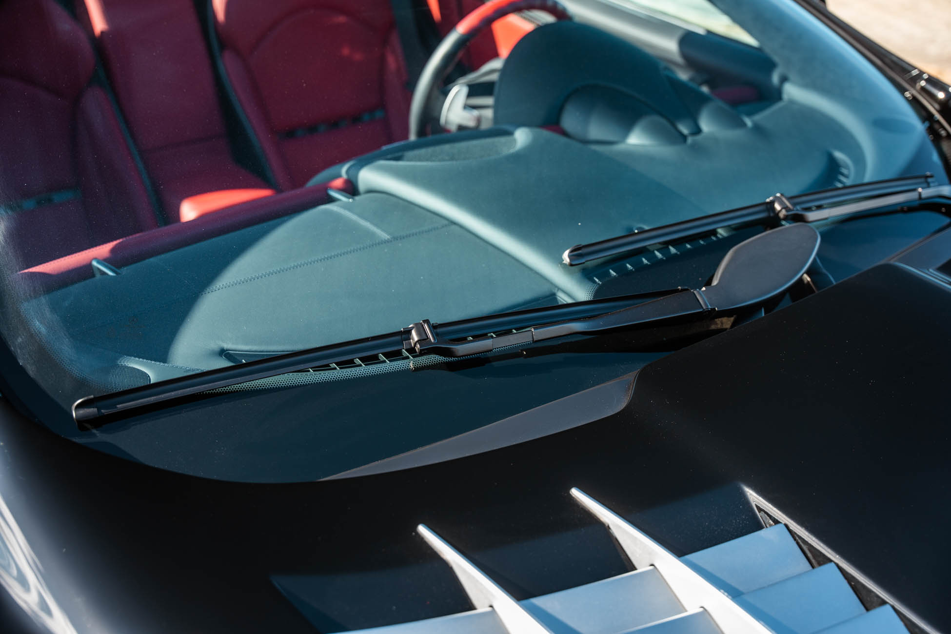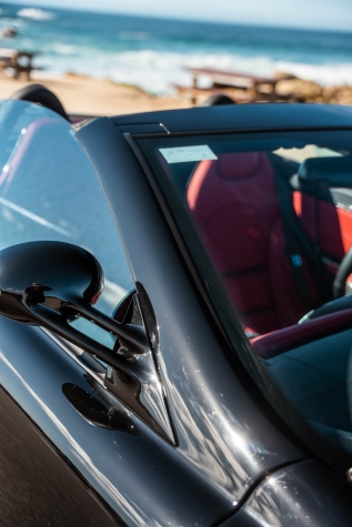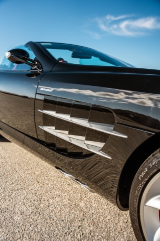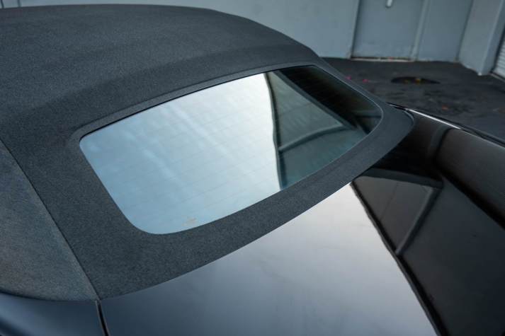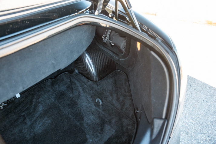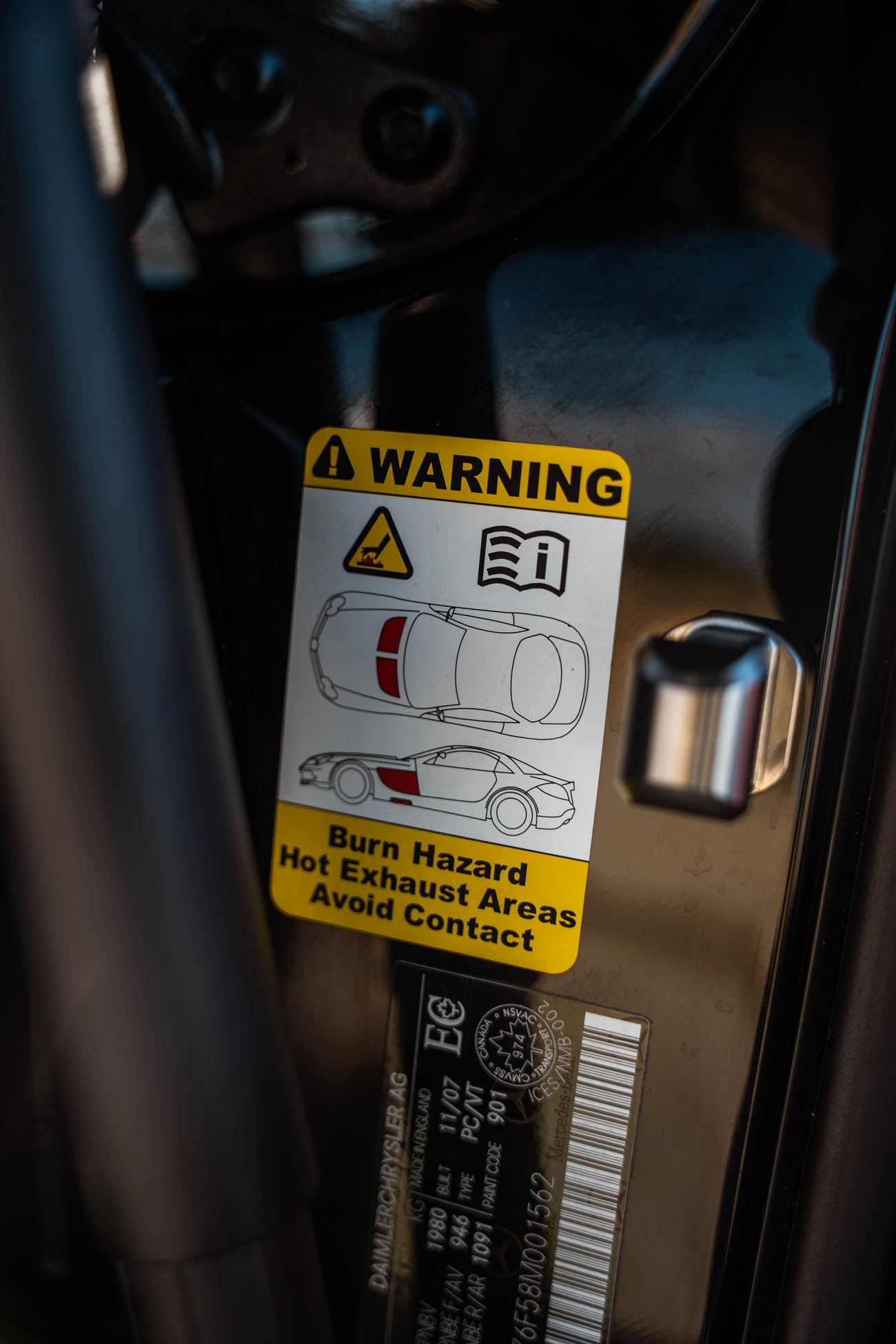 The SLR was built with a carbon-fiber monocoque and crash structures. This example is finished in Pure Black and features upward-opening butterfly doors, an Anthracite Black convertible soft top, xenon headlights, integrated fog lights, heated side mirrors, twin side-exit exhaust outlets behind each front wheel, and an electronically deployed rear spoiler air brake. The seller notes an area of paint touch-ups, and close-up photographs of the exterior finish and trim are shown in the gallery below.