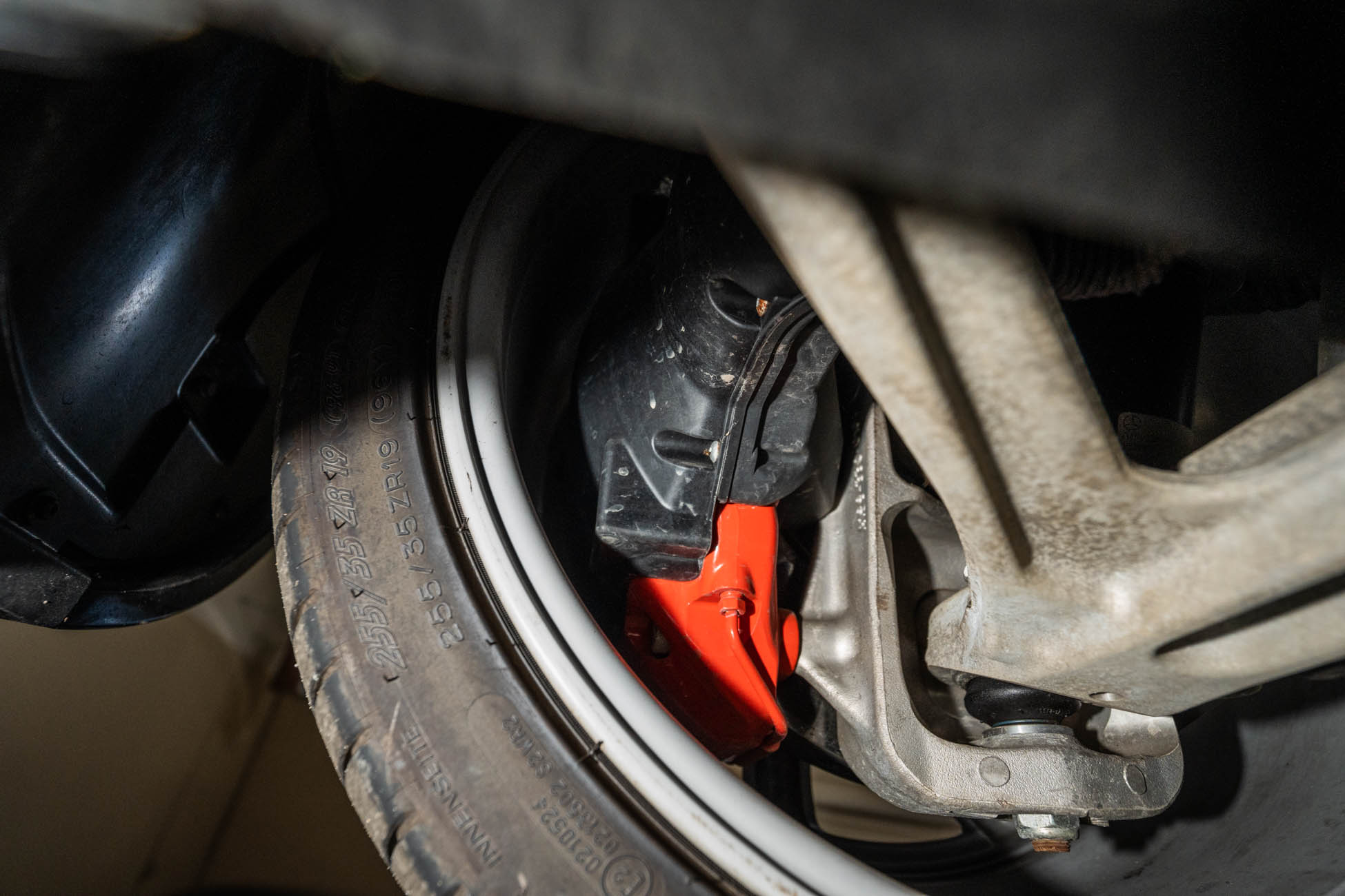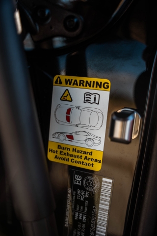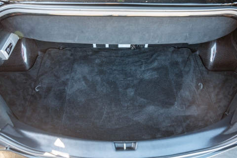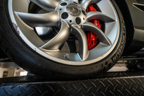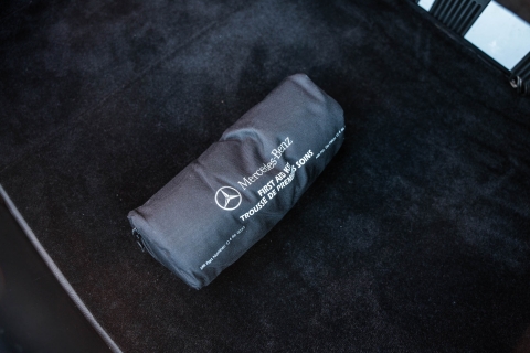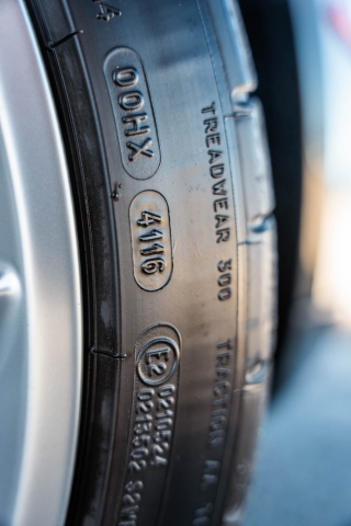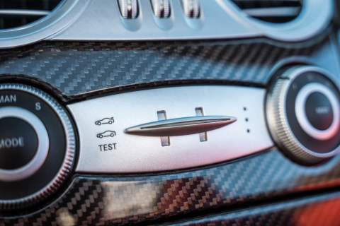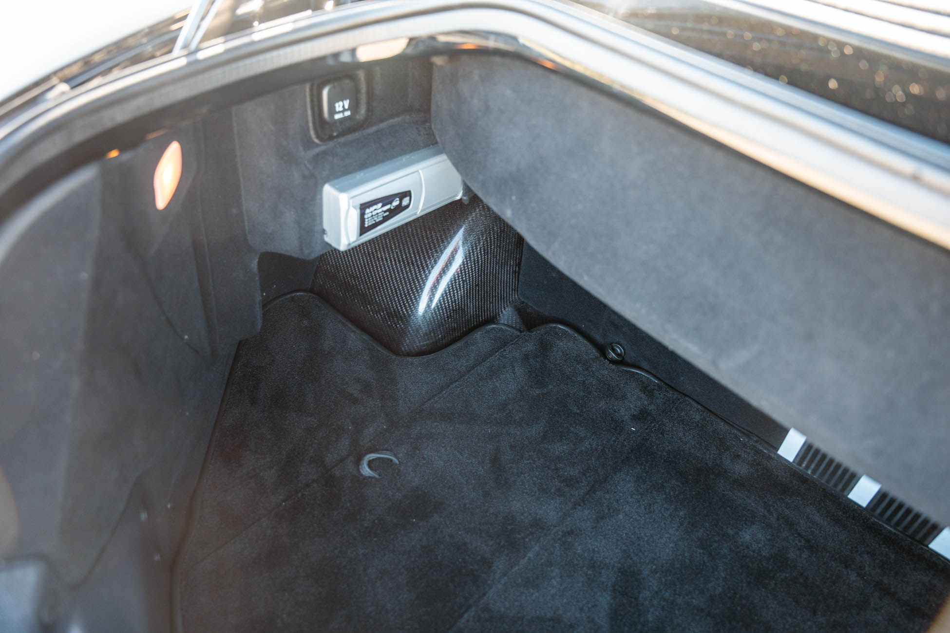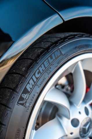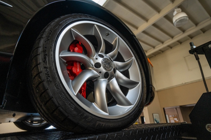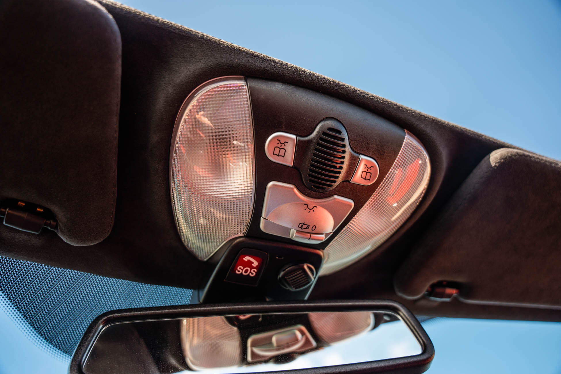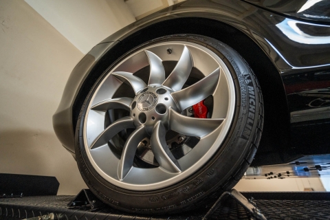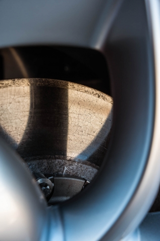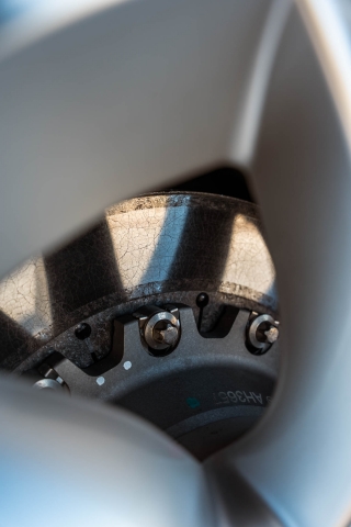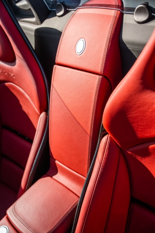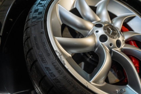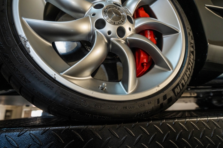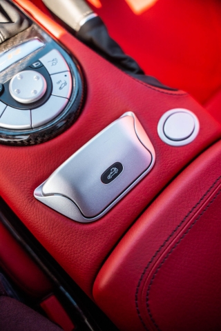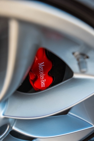 Asymmetrical turbine-style 19? alloy wheels are mounted with Michelin Pilot Sport tires that have 2015 and 2016 date codes. Stopping power is provided by red Mercedes-Benz-branded calipers over carbon-ceramic rotors at all four corners, and the car is equipped with a Sensotronic Brake Control system (SBC).