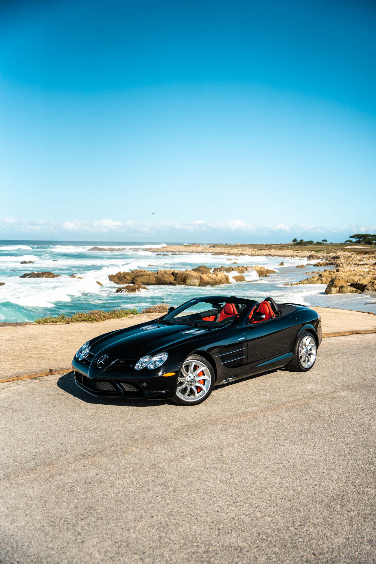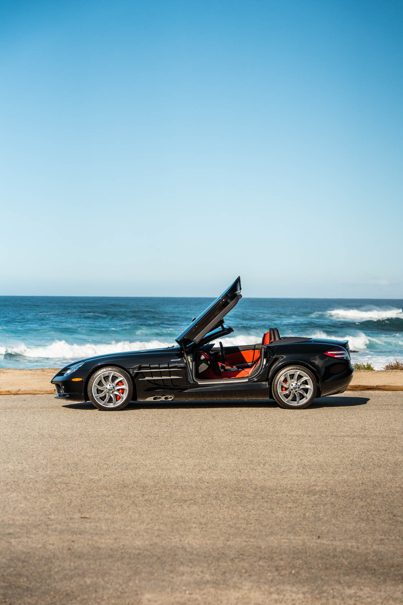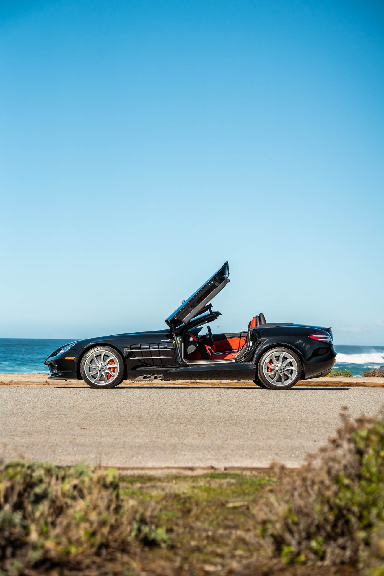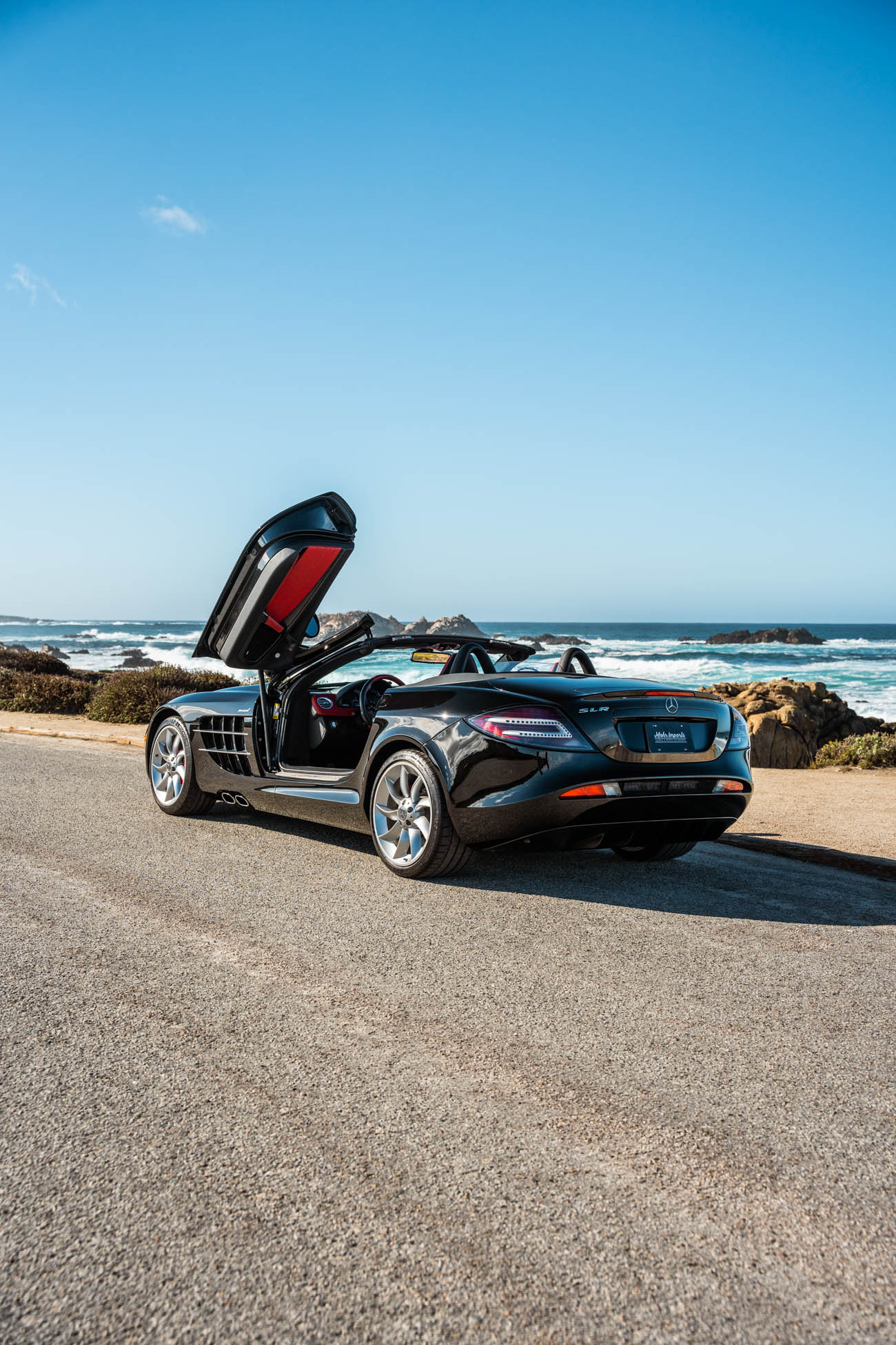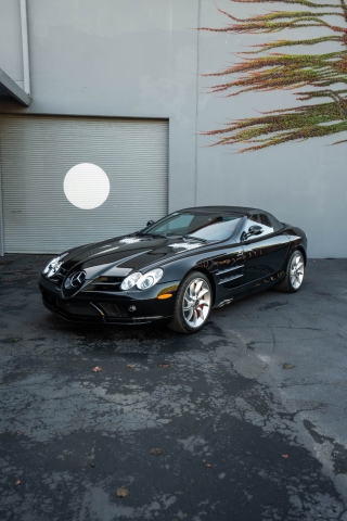 This Canadian-market 2008 Mercedes-Benz SLR McLaren roadster spent time in Nova Scotia before relocating to the US in 2010 and later to Sweden. It is powered by a supercharged 5.4-liter M155 V8 paired with an AMG Speedshift R five-speed automatic transmission and is finished in Pure Black over 300SL Red Silver Arrow leather upholstery. Equipment includes asymmetrical 19? turbine-spoke alloy wheels, carbon-ceramic disc brakes, butterfly doors, xenon headlights, an Anthracite Black soft top, side-exit exhaust pipes, carbon-fiber seats, an Alpine head unit, a Bose sound system, and dual-zone automatic climate control. Purchased by the current owner in 2024, this SLR McLaren roadster is offered on consignment in California by the selling dealer, a BaT Local Partner, with manufacturer’s literature, a Mercedes-Benz build sheet, a clean Carfax report, and a clean Montana title.