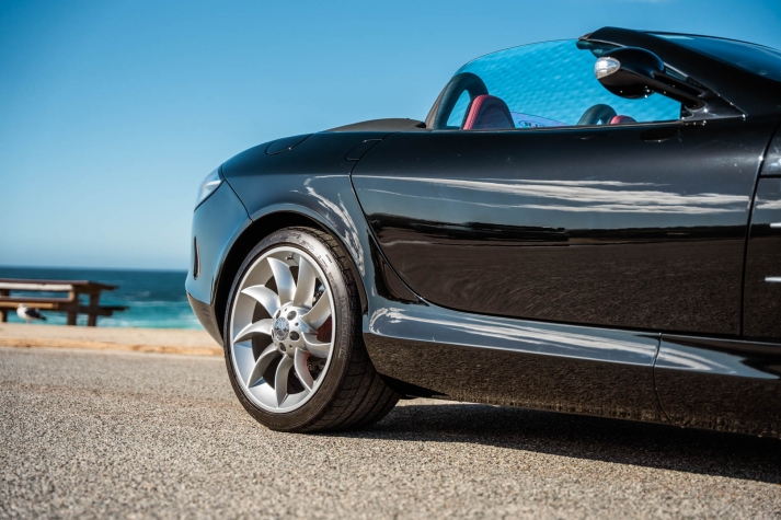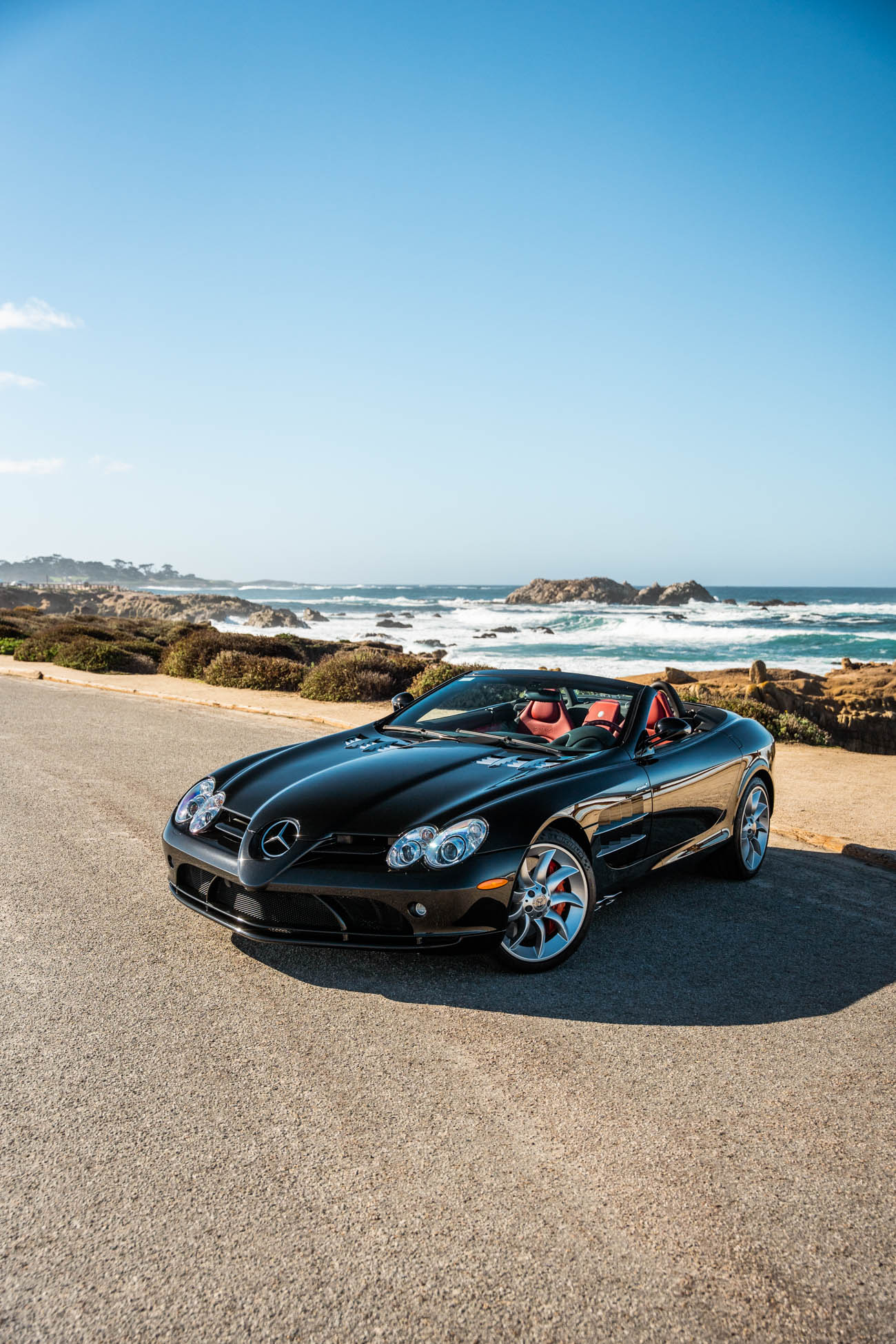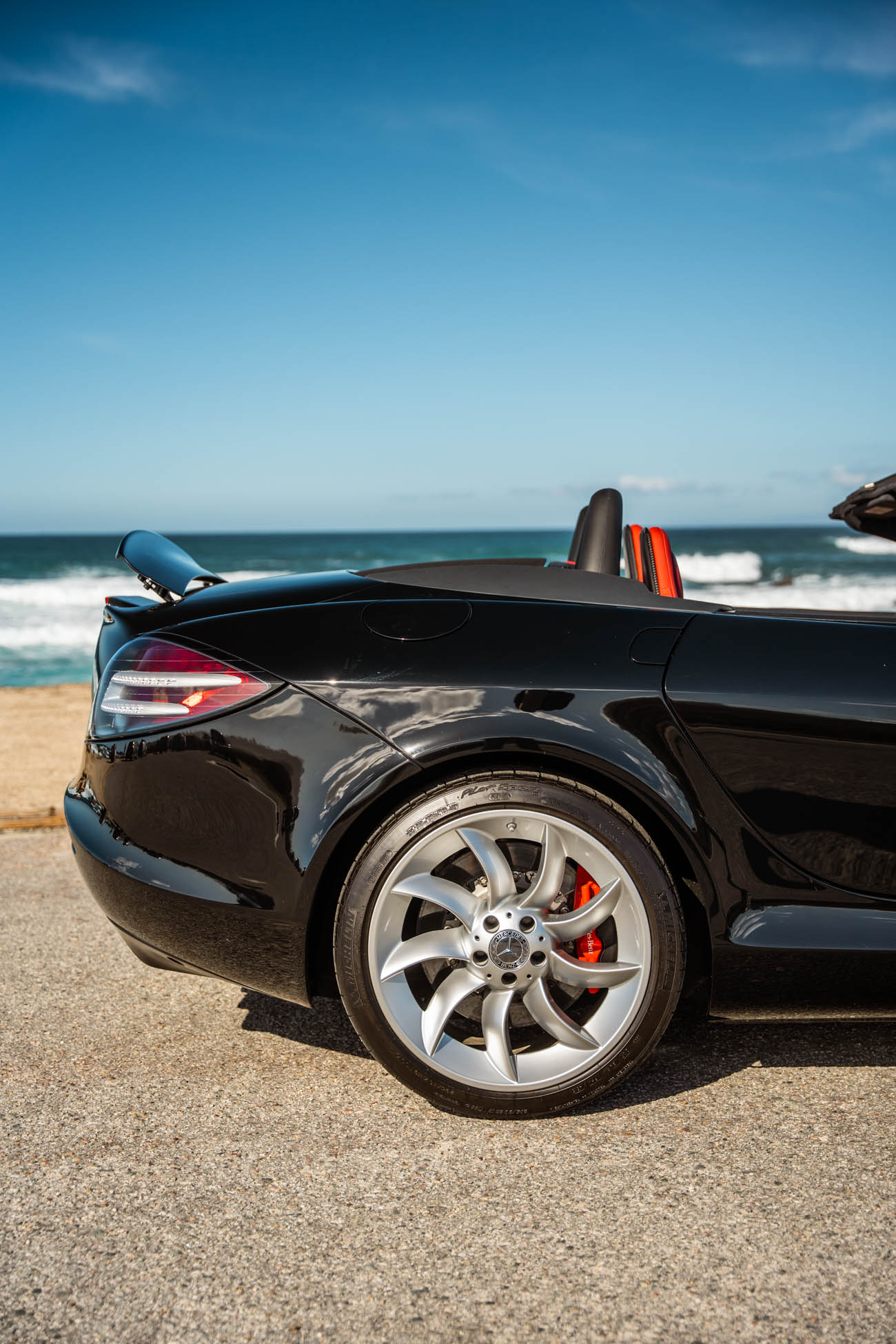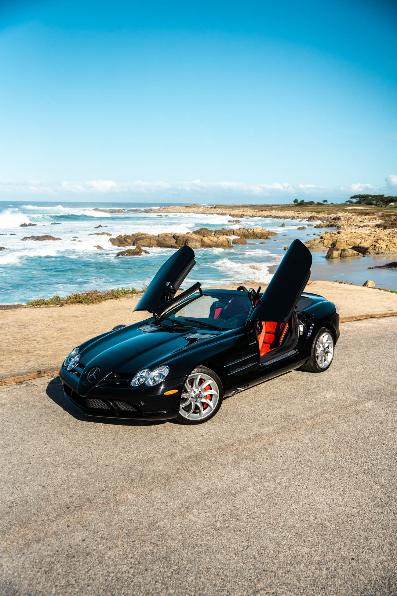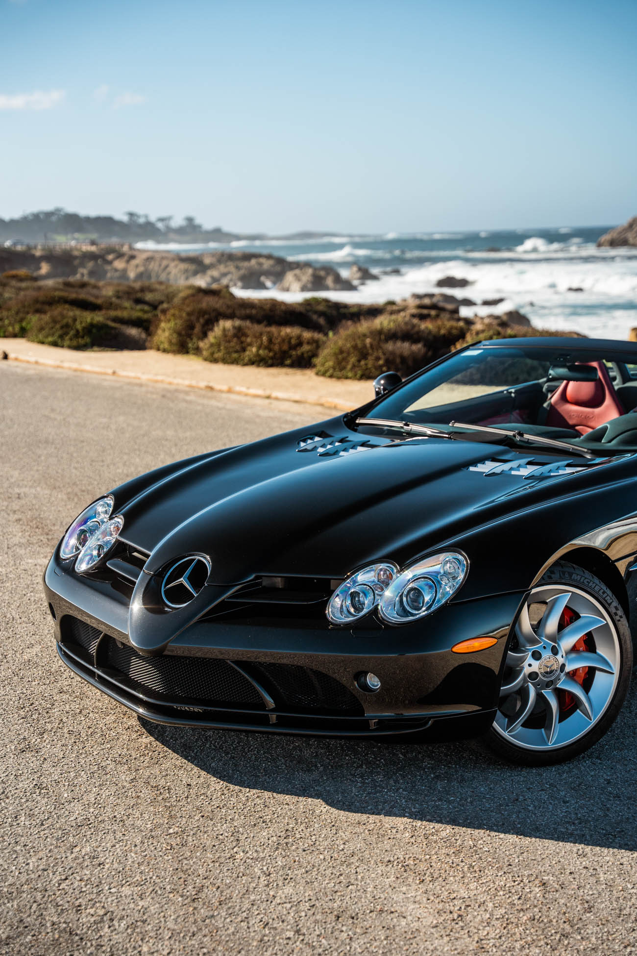 This Canadian-market 2008 Mercedes-Benz SLR McLaren roadster spent time in Nova Scotia before relocating to the US in 2010 and later to Sweden. It is powered by a supercharged 5.4-liter M155 V8 paired with an AMG Speedshift R five-speed automatic transmission and is finished in Pure Black over 300SL Red Silver Arrow leather upholstery. Equipment includes asymmetrical 19? turbine-spoke alloy wheels, carbon-ceramic disc brakes, butterfly doors, xenon headlights, an Anthracite Black soft top, side-exit exhaust pipes, carbon-fiber seats, an Alpine head unit, a Bose sound system, and dual-zone automatic climate control. Purchased by the current owner in 2024, this SLR McLaren roadster is offered on consignment in California by the selling dealer, a BaT Local Partner, with manufacturer’s literature, a Mercedes-Benz build sheet, a clean Carfax report, and a clean Montana title.