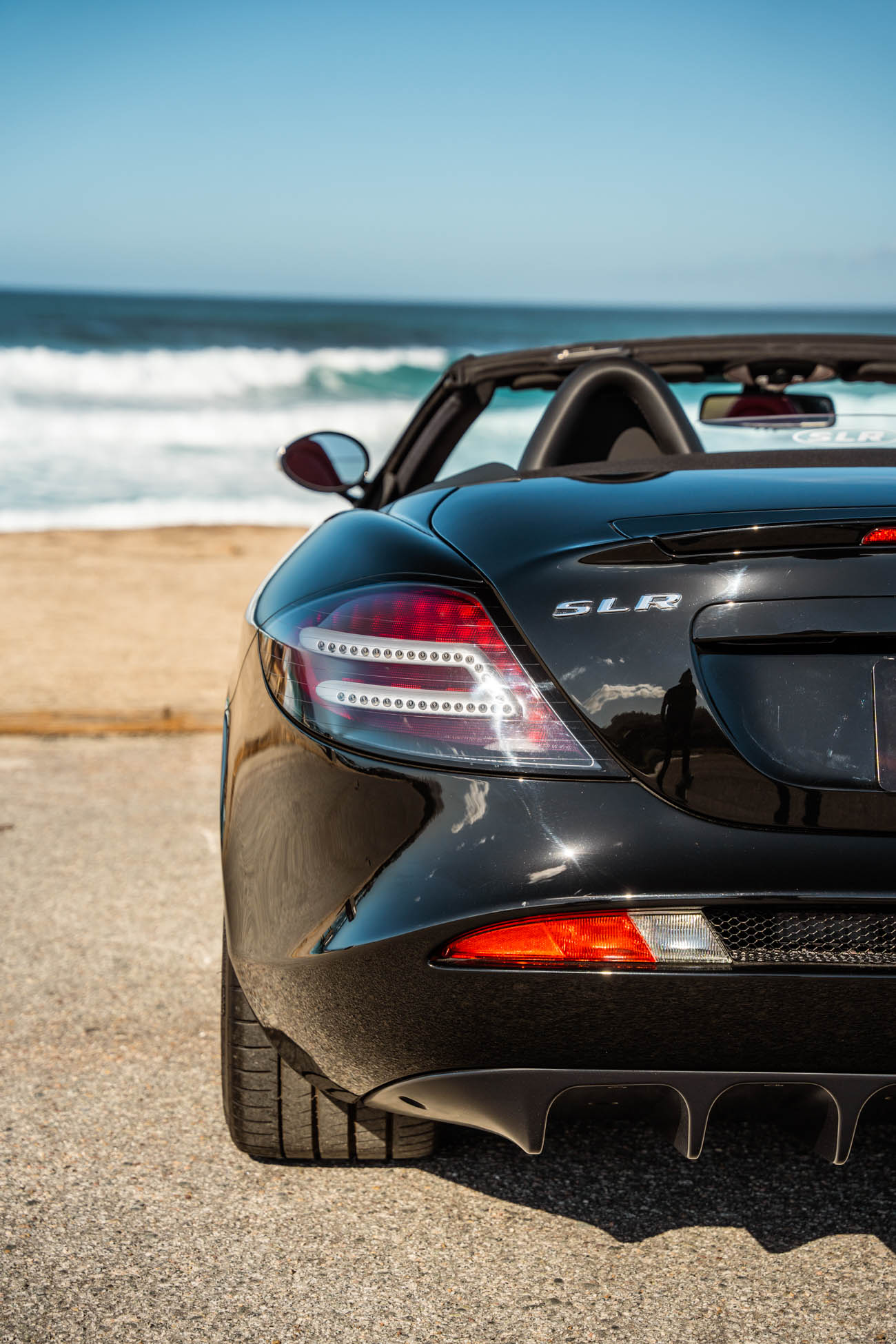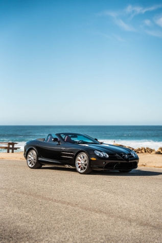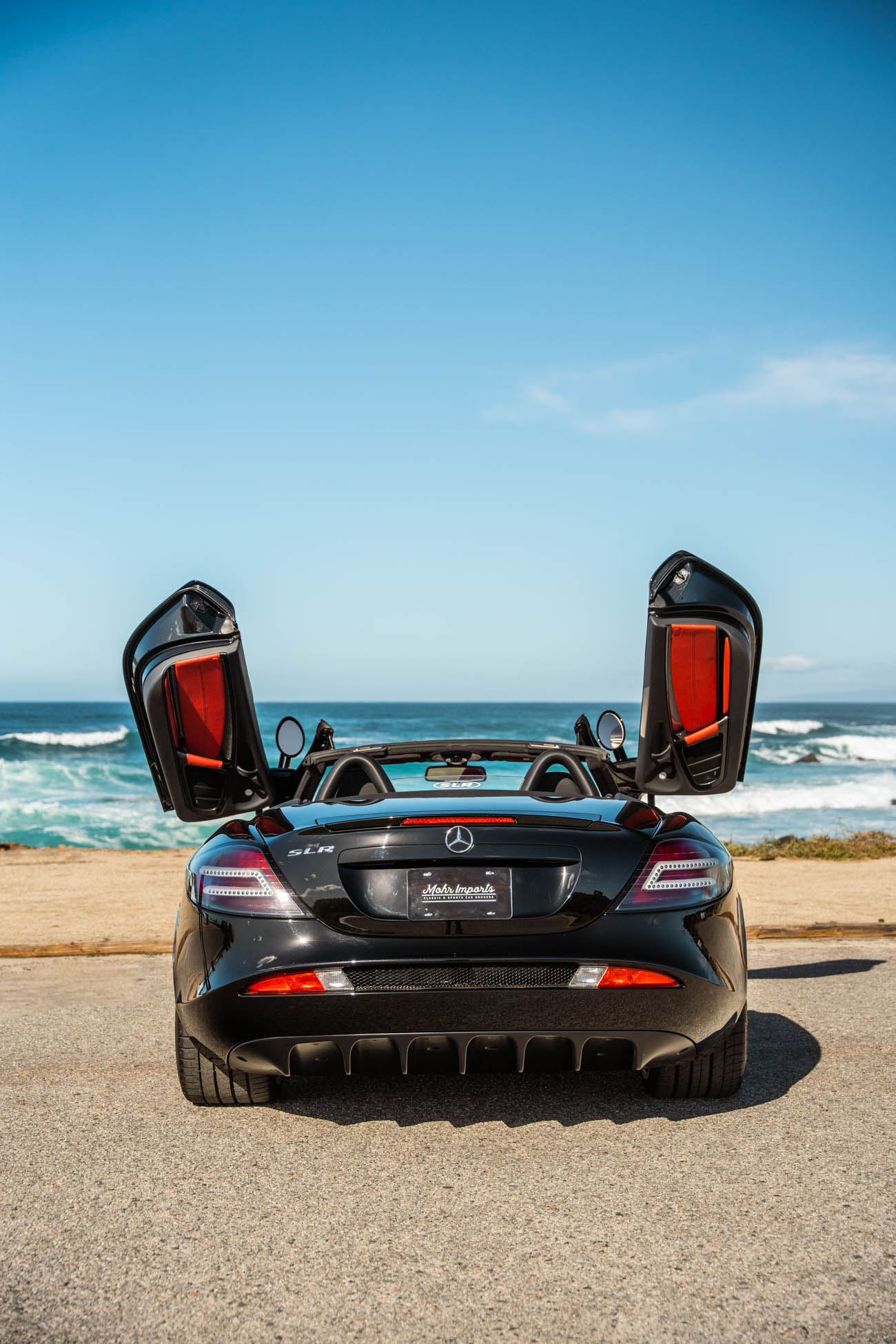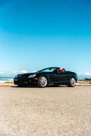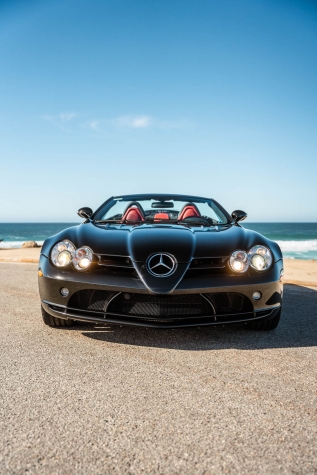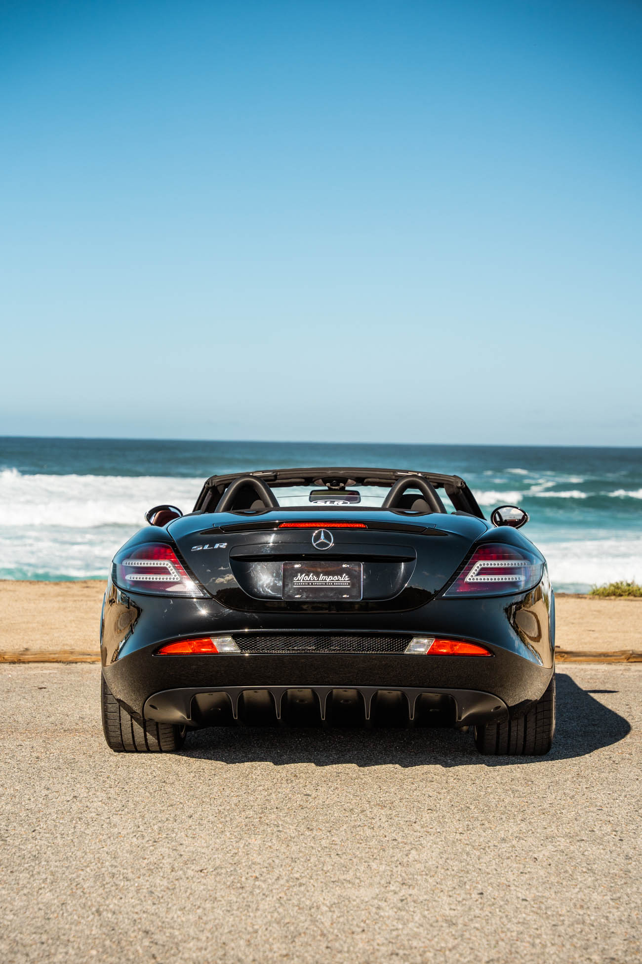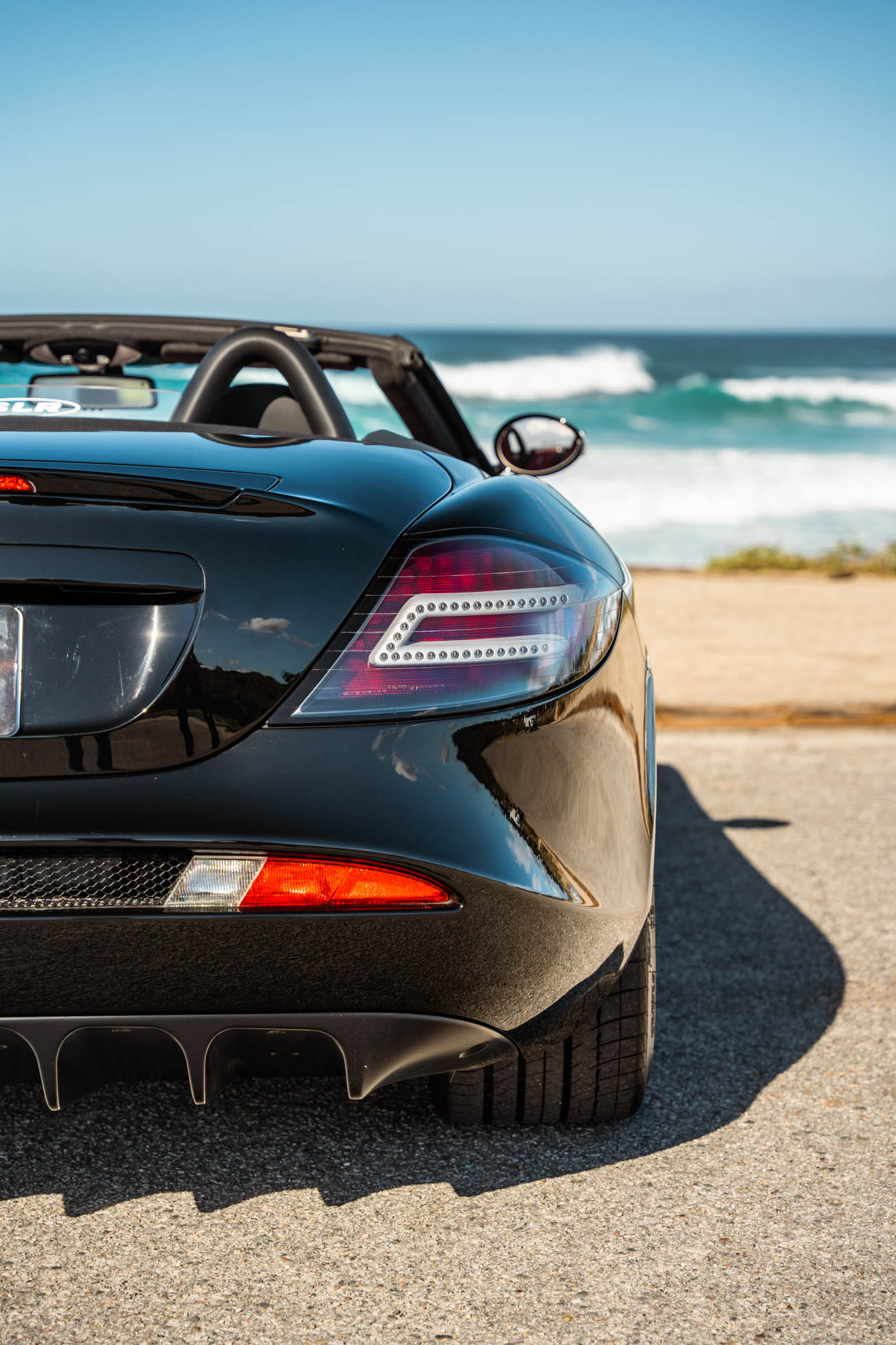 This Canadian-market 2008 Mercedes-Benz SLR McLaren roadster spent time in Nova Scotia before relocating to the US in 2010 and later to Sweden. It is powered by a supercharged 5.4-liter M155 V8 paired with an AMG Speedshift R five-speed automatic transmission and is finished in Pure Black over 300SL Red Silver Arrow leather upholstery. Equipment includes asymmetrical 19? turbine-spoke alloy wheels, carbon-ceramic disc brakes, butterfly doors, xenon headlights, an Anthracite Black soft top, side-exit exhaust pipes, carbon-fiber seats, an Alpine head unit, a Bose sound system, and dual-zone automatic climate control. Purchased by the current owner in 2024, this SLR McLaren roadster is offered on consignment in California by the selling dealer, a BaT Local Partner, with manufacturer’s literature, a Mercedes-Benz build sheet, a clean Carfax report, and a clean Montana title.
