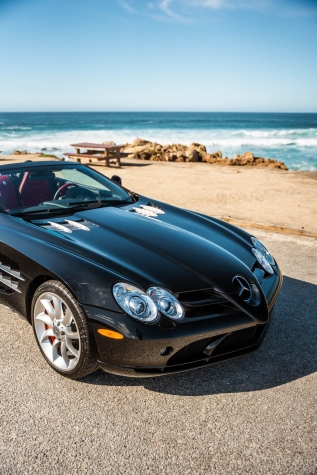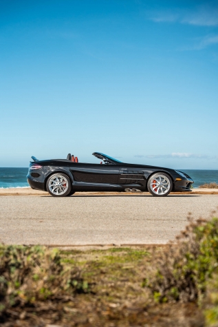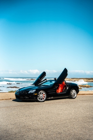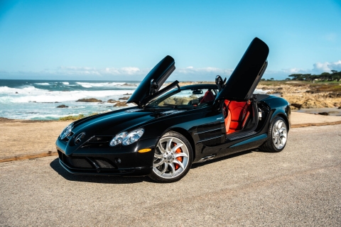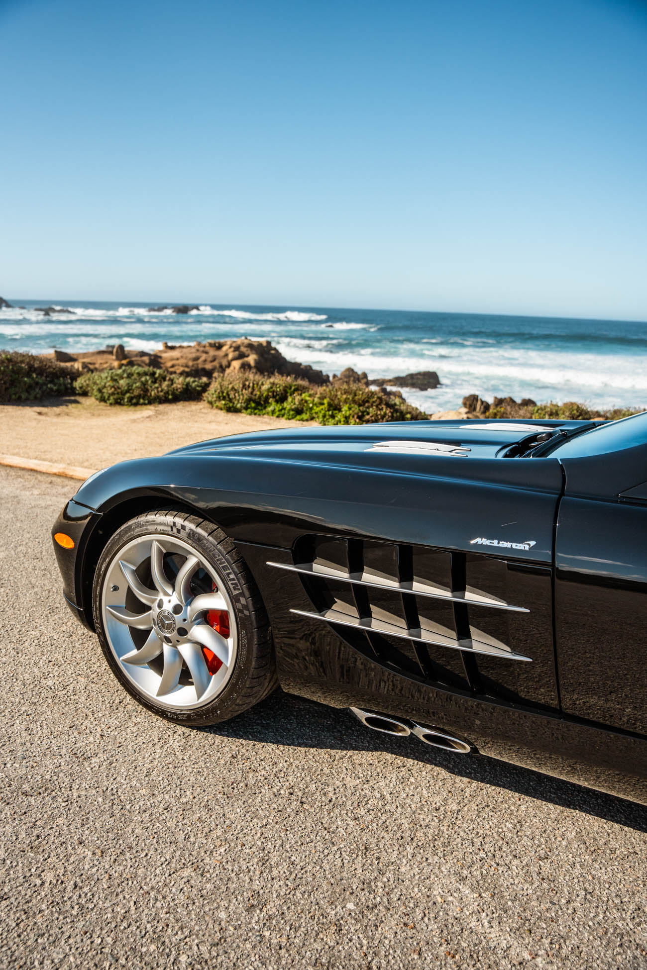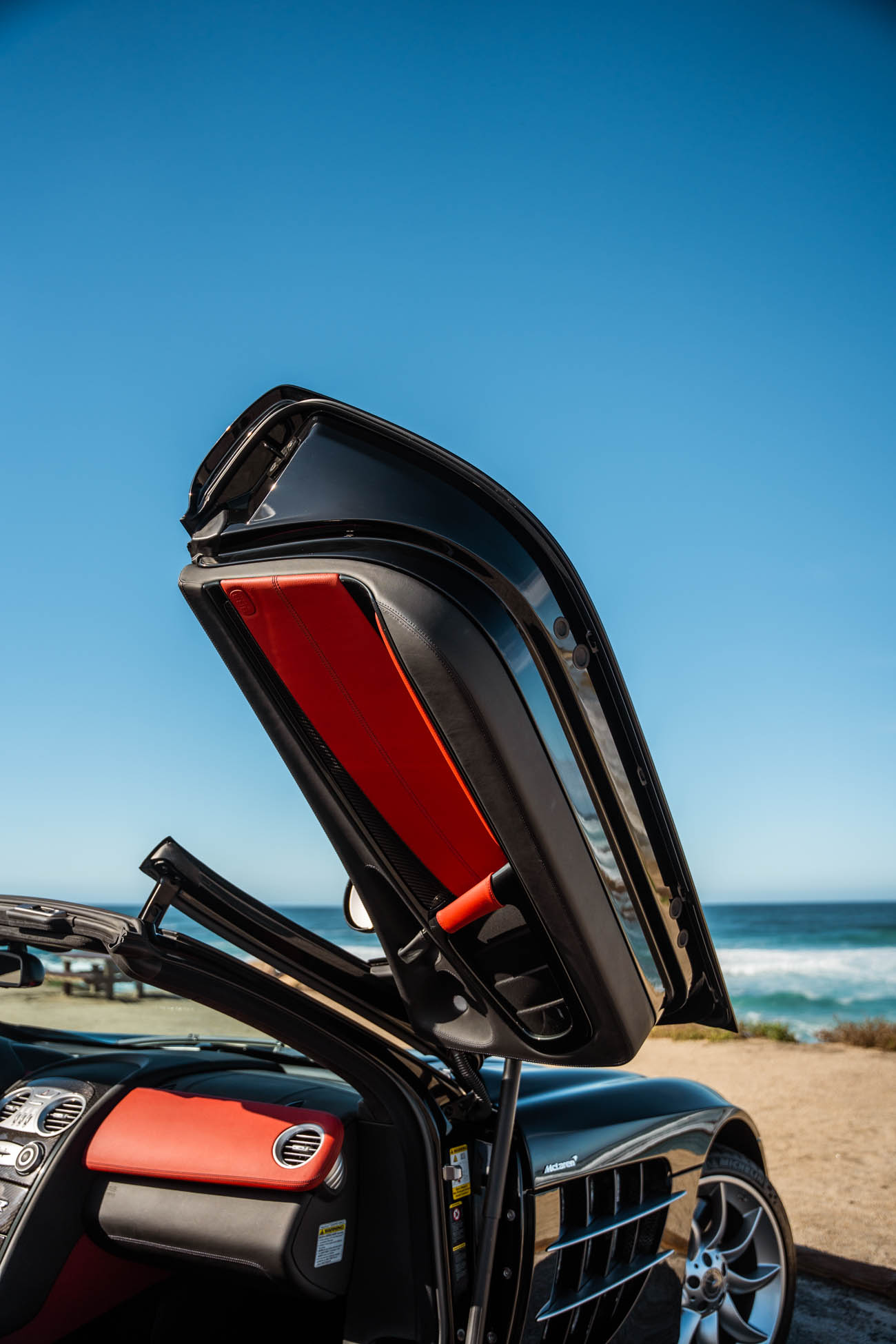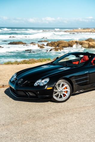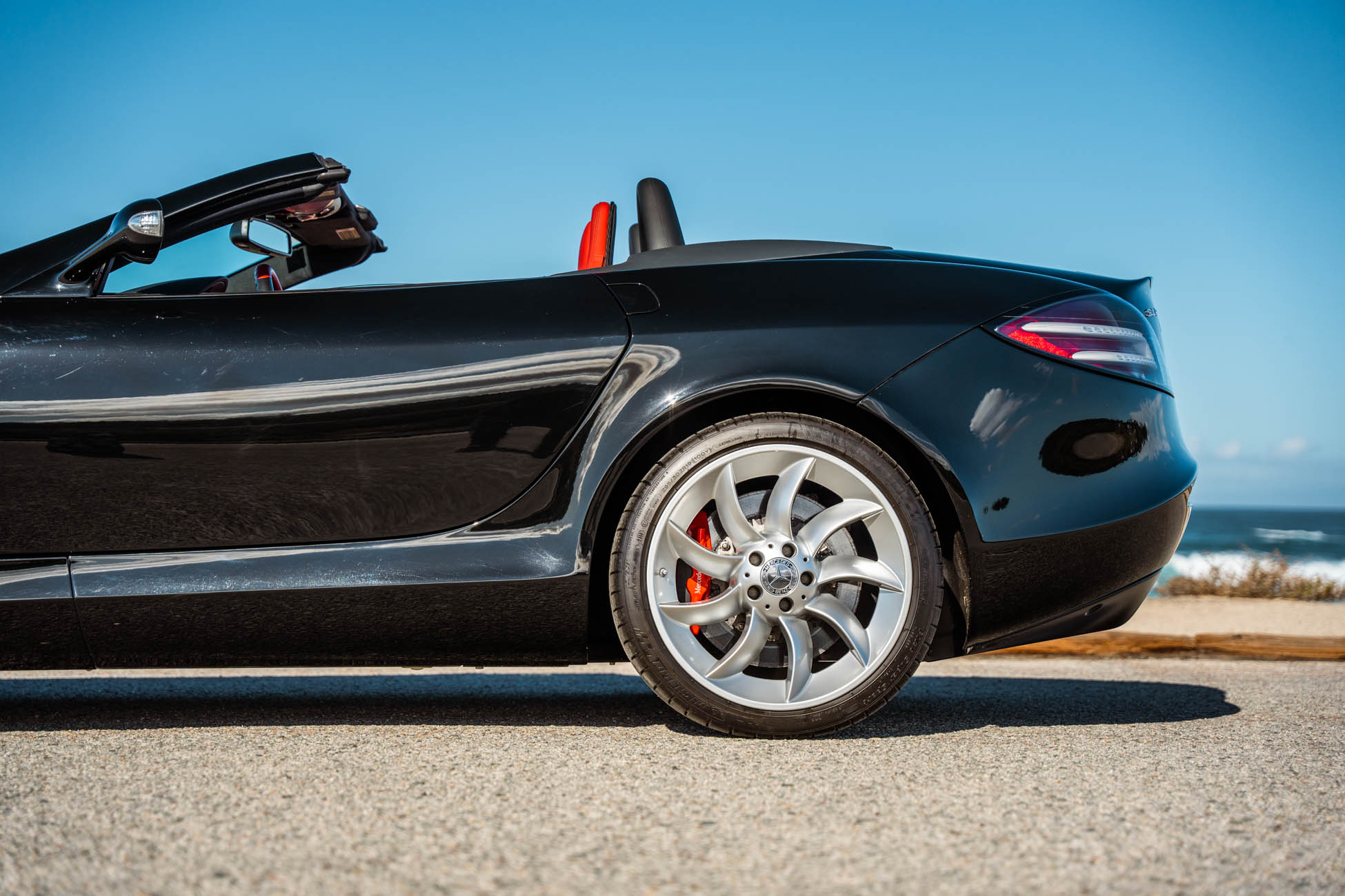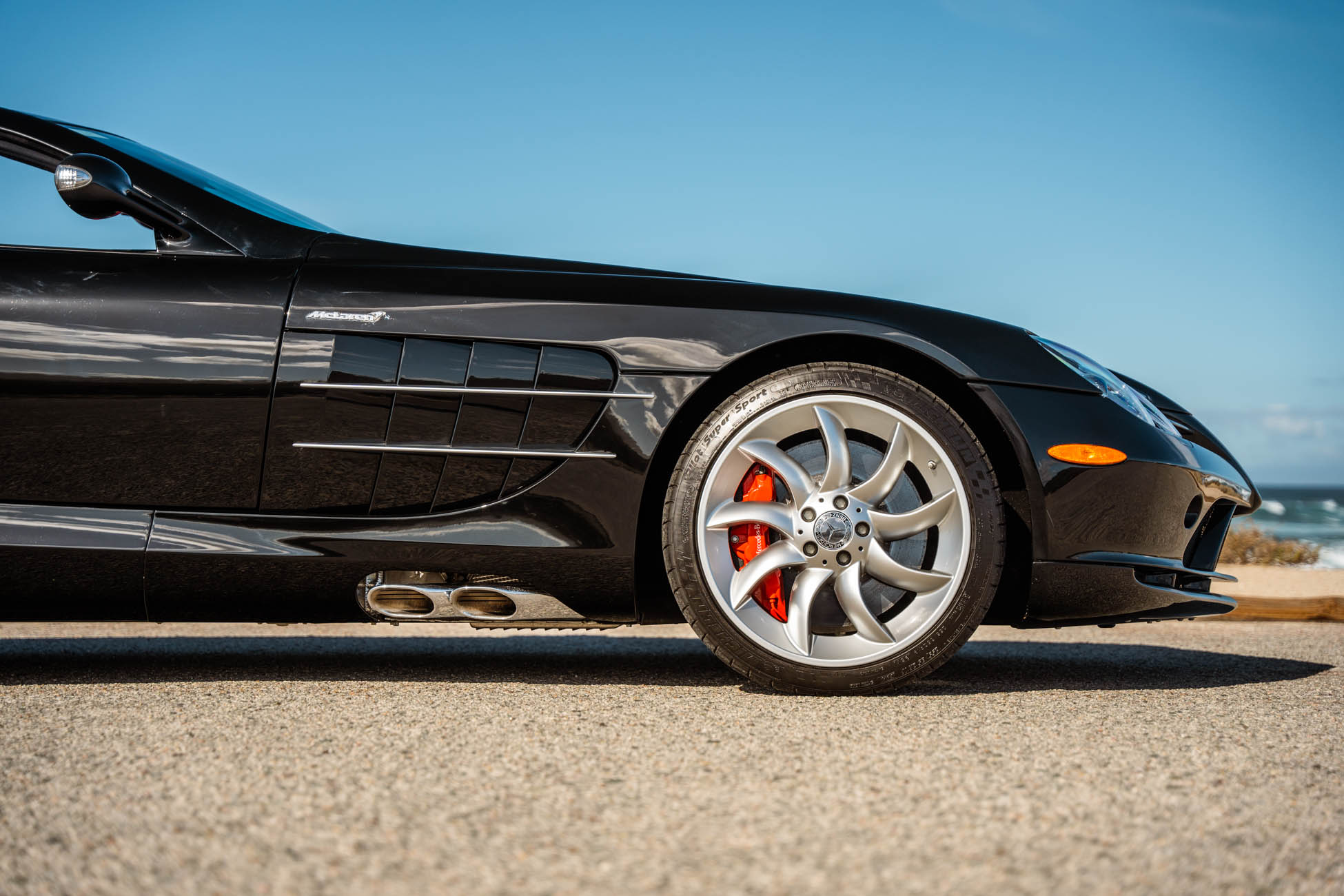 This Canadian-market 2008 Mercedes-Benz SLR McLaren roadster spent time in Nova Scotia before relocating to the US in 2010 and later to Sweden. It is powered by a supercharged 5.4-liter M155 V8 paired with an AMG Speedshift R five-speed automatic transmission and is finished in Pure Black over 300SL Red Silver Arrow leather upholstery. Equipment includes asymmetrical 19? turbine-spoke alloy wheels, carbon-ceramic disc brakes, butterfly doors, xenon headlights, an Anthracite Black soft top, side-exit exhaust pipes, carbon-fiber seats, an Alpine head unit, a Bose sound system, and dual-zone automatic climate control. Purchased by the current owner in 2024, this SLR McLaren roadster is offered on consignment in California by the selling dealer, a BaT Local Partner, with manufacturer’s literature, a Mercedes-Benz build sheet, a clean Carfax report, and a clean Montana title.