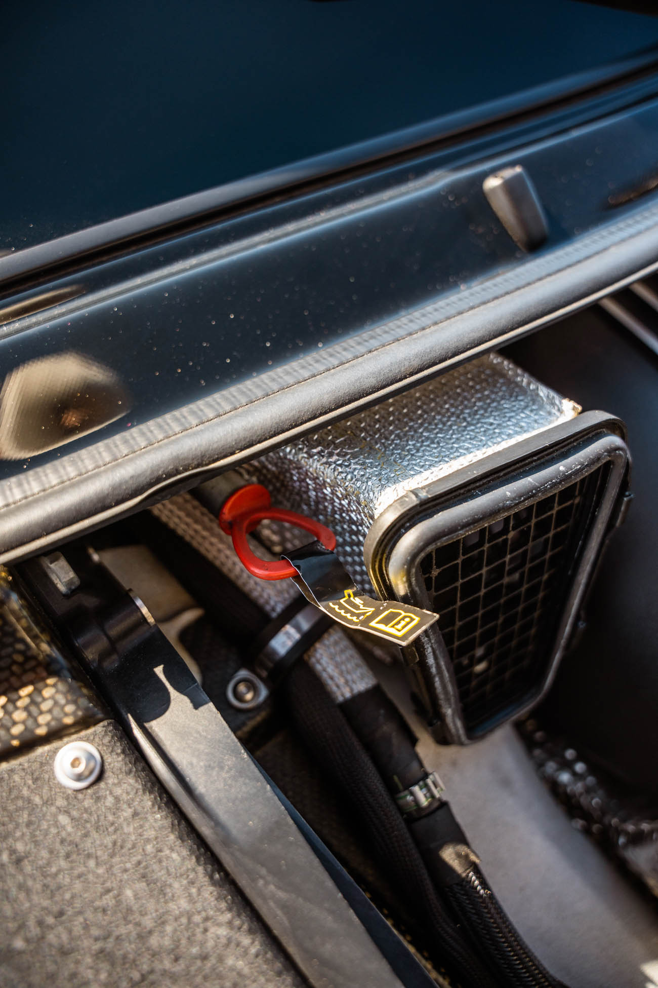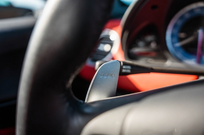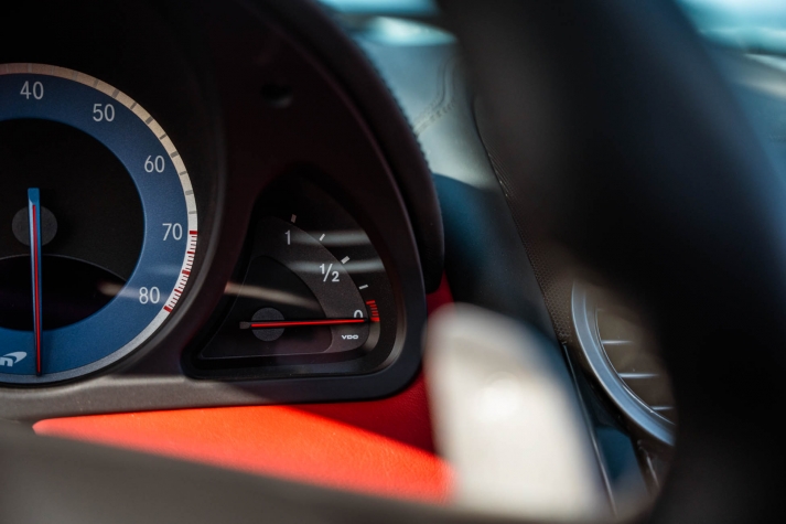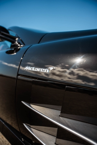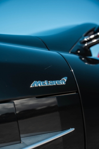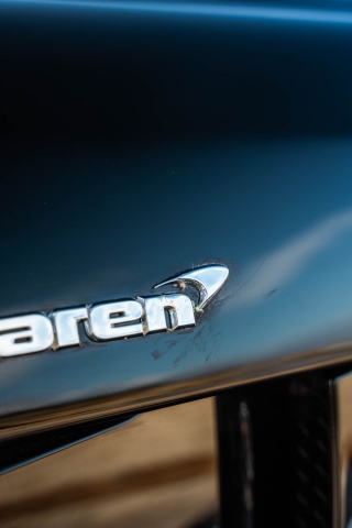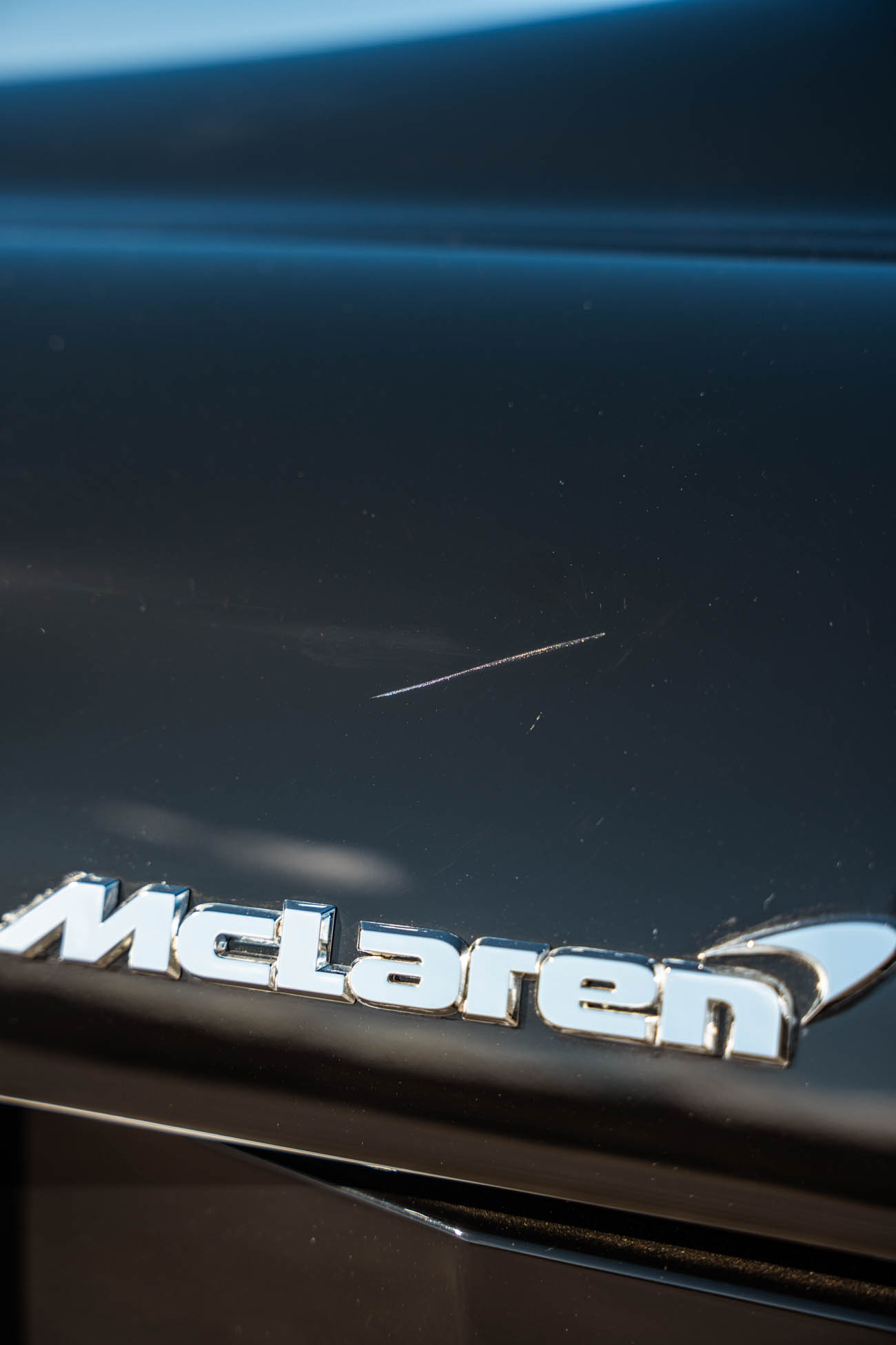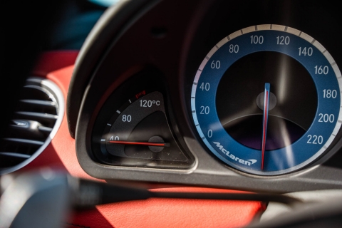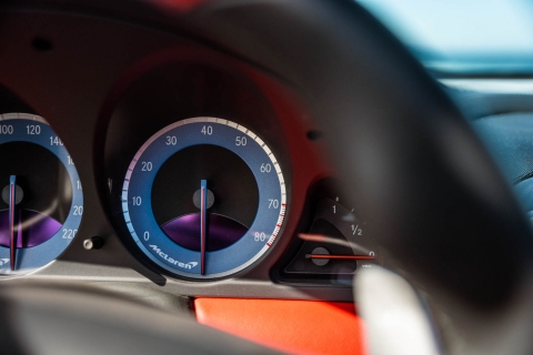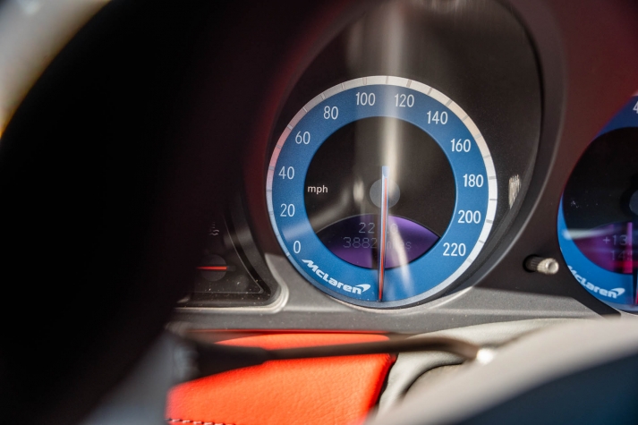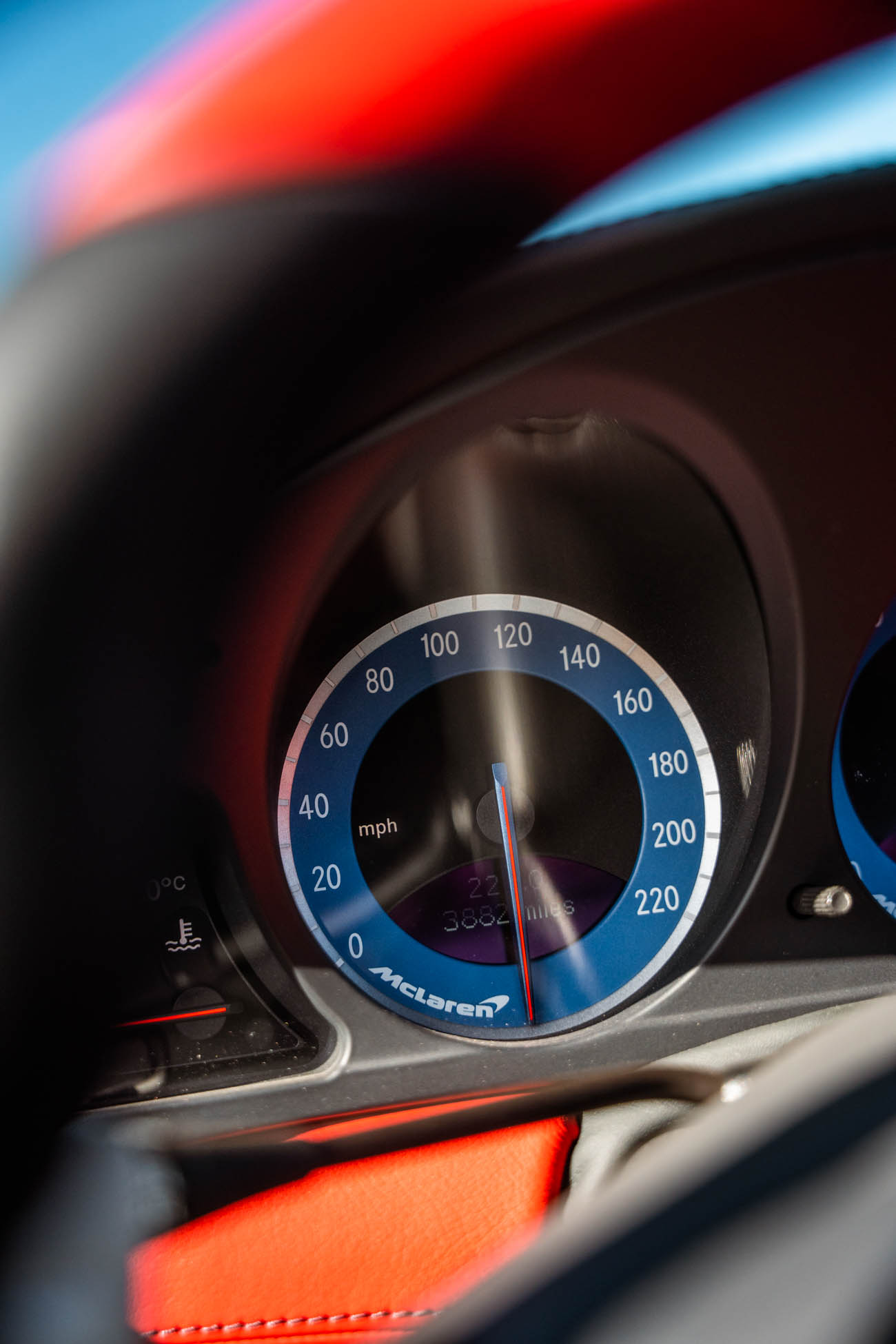 The black and red leather-wrapped steering wheel frames McLaren-branded instrumentation, including a 220-mph speedometer and a tachometer with a 7k-rpm redline, as well as gauges for coolant temperature and fuel level. The digital odometer indicates 3,900 miles.