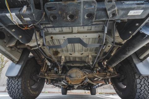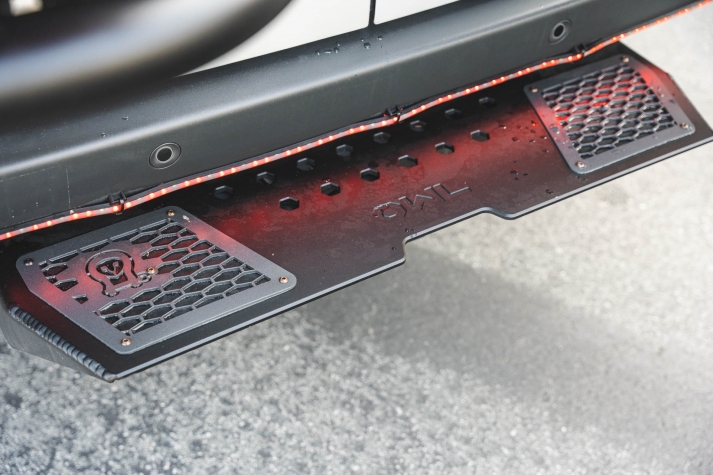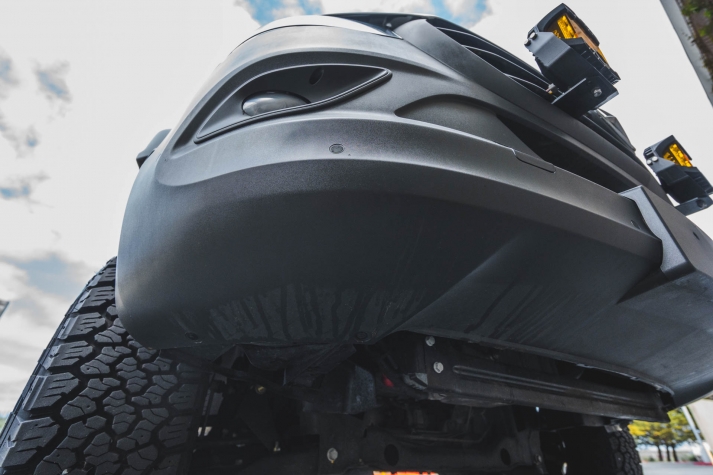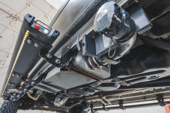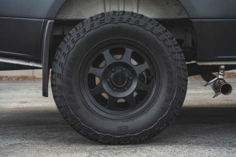 Black-finished 17? Method alloy wheels are wrapped in 275/70 General Grabber AT Tires, while a matching spare is secured to the rear carrier. Stopping power is provided by four-wheel disc brakes. Van Compass suspension components have been installed along with Falcon remote-reservoir adjustable shocks.