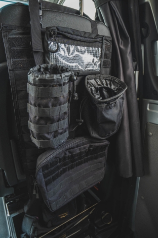 The front cabin features swiveling seats upholstered in black vinyl along with color-coordinated door panels, carbon-fiber-style accents, and a black rubber floor liner. Amenities include power windows and locks, automatic climate control, cruise control, a reverse-view camera, and a touch-screen infotainment system with navigation. Additional equipment includes a RAM accessory mount, a Trigger Six-Shooter accessory power control panel with Bluetooth connectivity, Overland Gear Guy storage pouches, and Molle-style gear panels secured to the seatbacks.