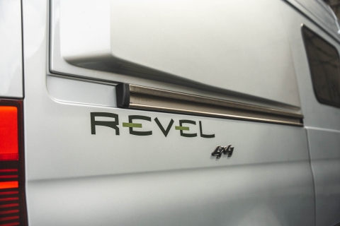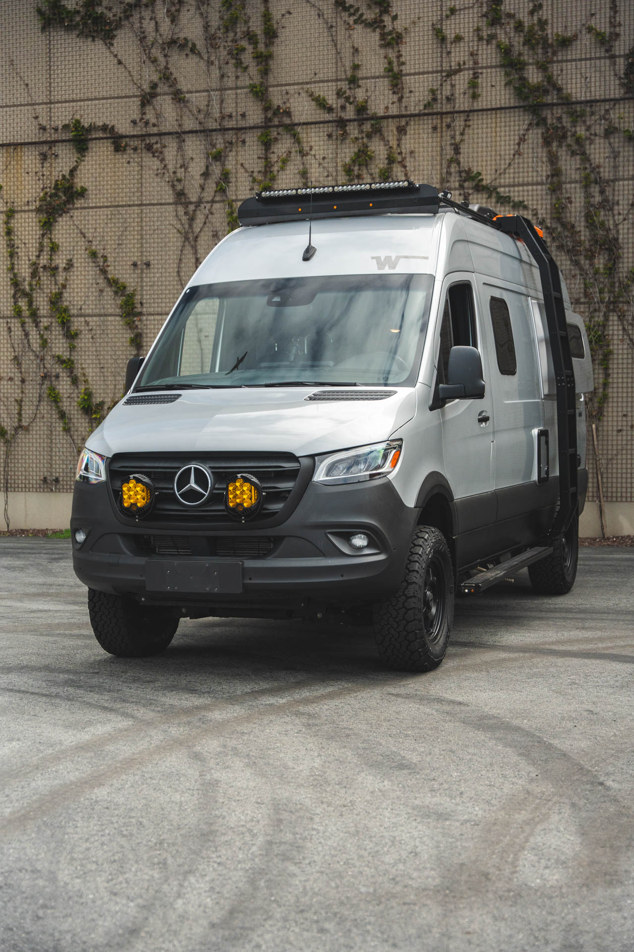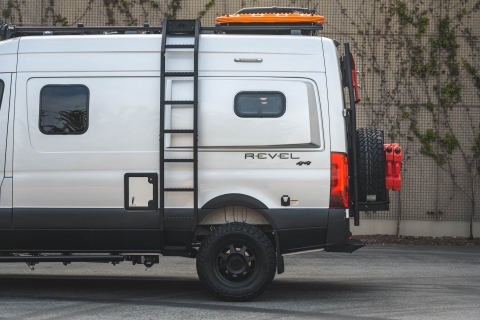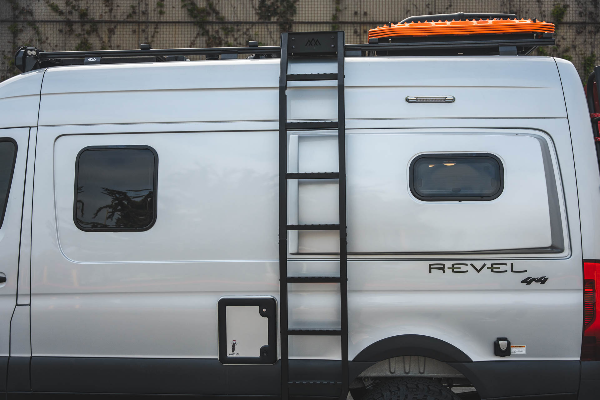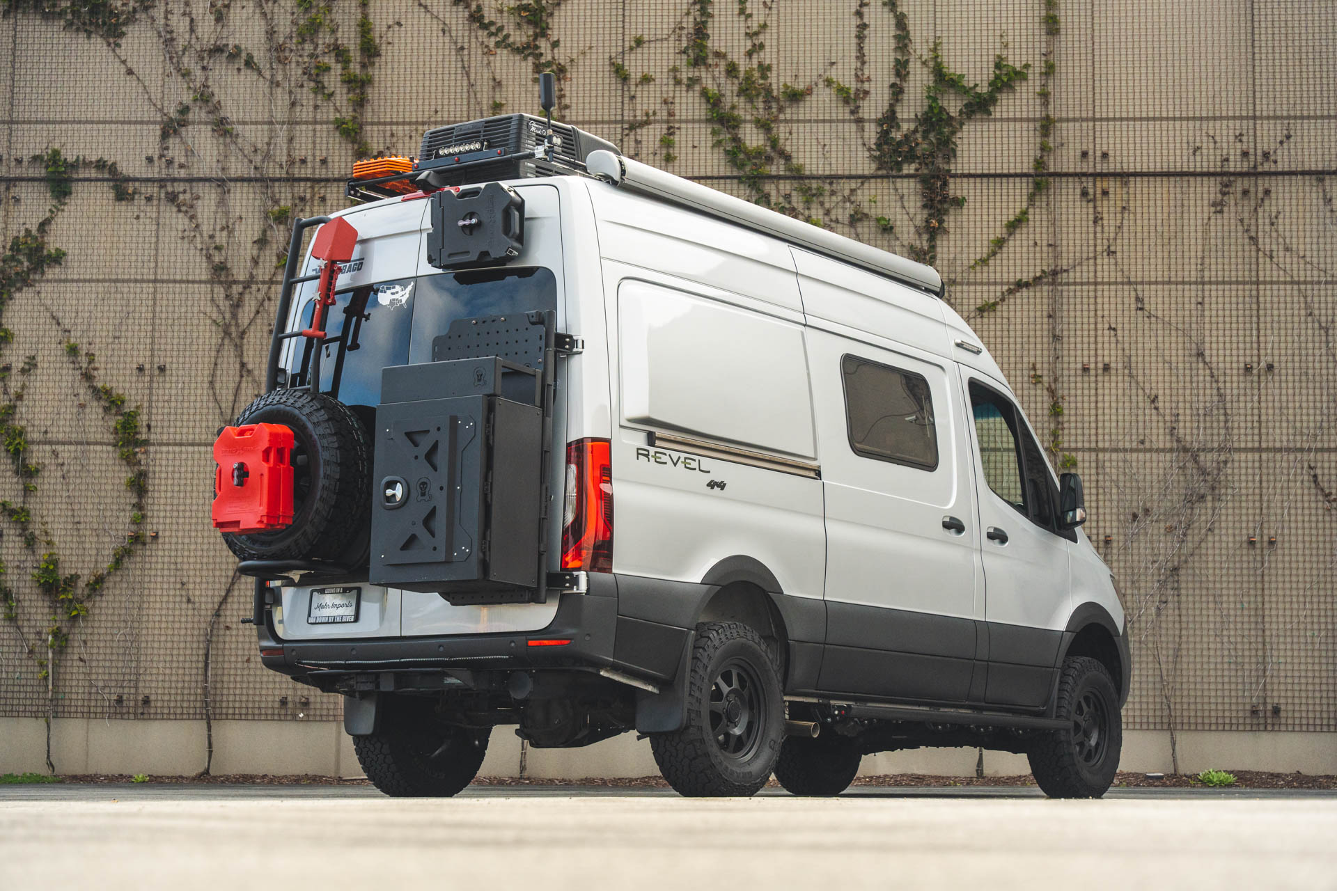 The extended-height body is finished in silver with black lower bodywork and Revel graphics. The van features a sliding side door, rear barn doors, a power-operated awning, an Agile Offroad roof rack, rooftop solar panels, running boards wrapped in black vinyl, and Terrawagen Mondo Mudguard wheel-arch flares as well as Baja Designs amber driving lights, front and rear LED light bars, and side lights. Owl Vans accessories include an aluminum cargo box, a firewood box, a hitch step, and a rear ladder with an integrated tire carrier, while additional equipment consists of a Backwoods side ladder, a Rotopax toolbox and auxiliary fuel carriers, and Maxtrax traction boards as well as shore connections for water, power, and waste disposal.