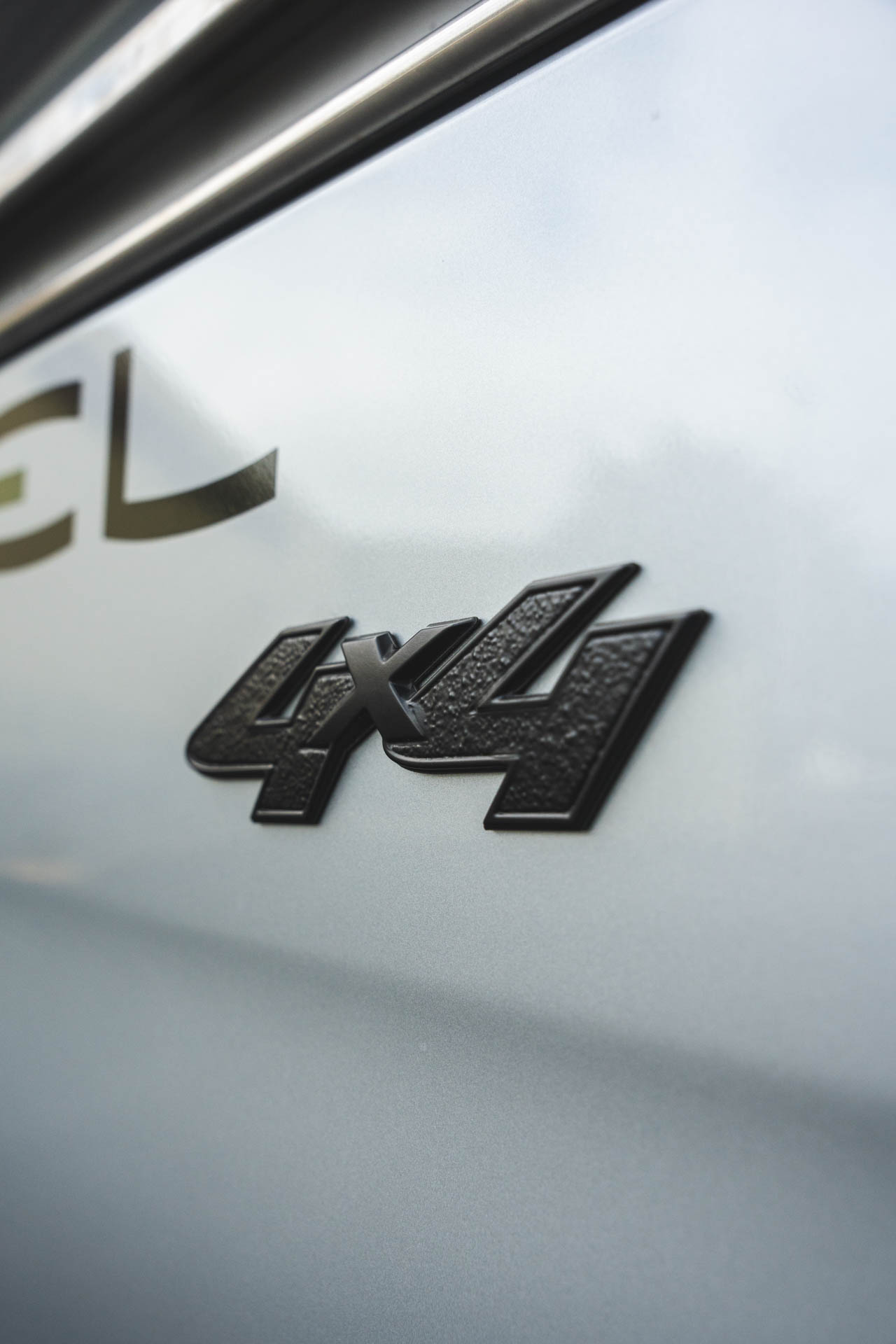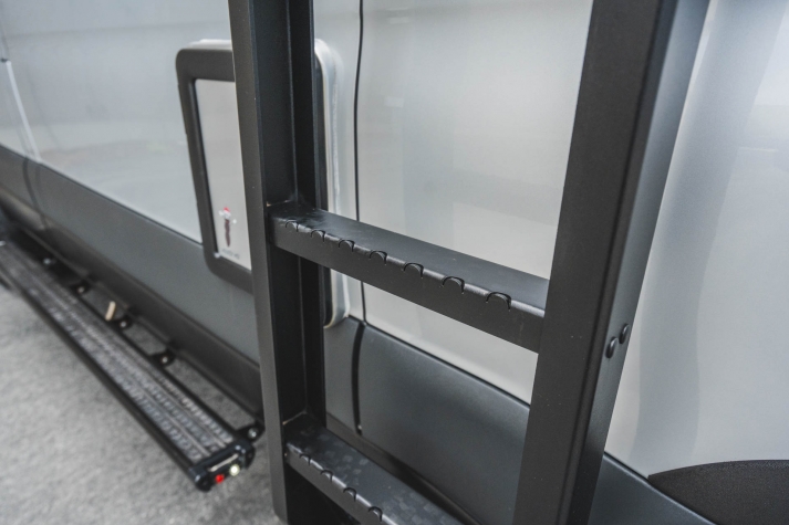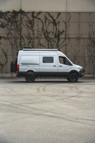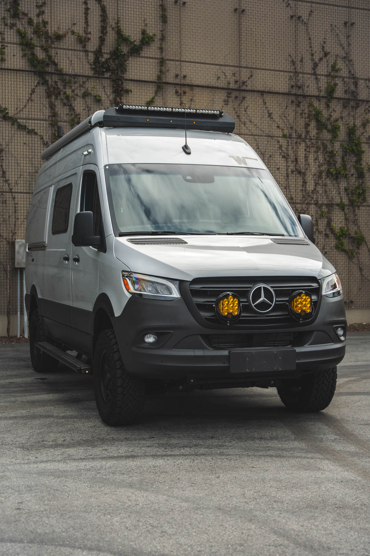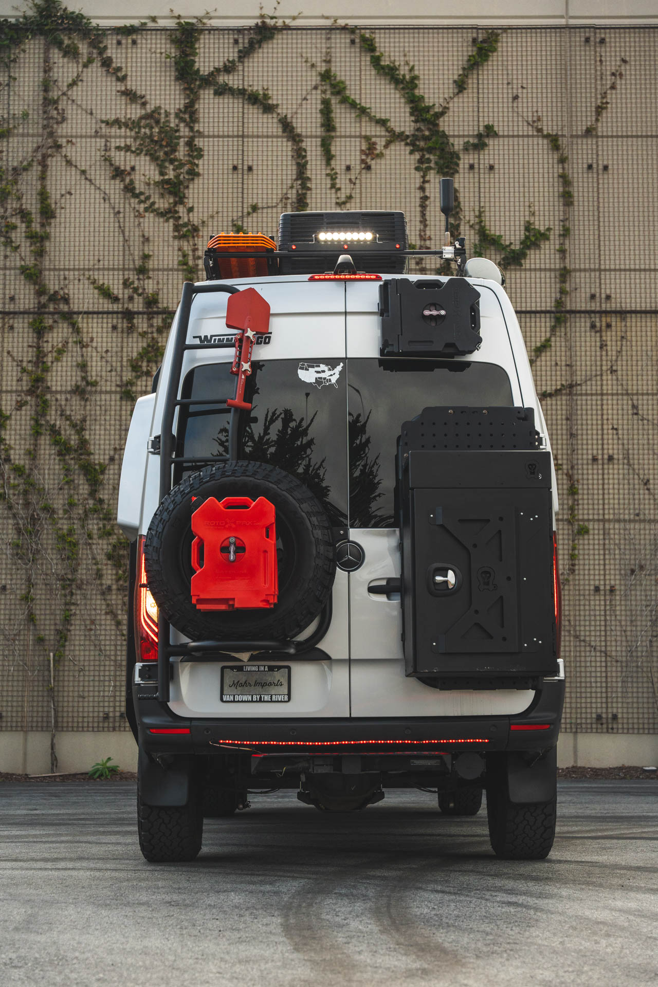 The extended-height body is finished in silver with black lower bodywork and Revel graphics. The van features a sliding side door, rear barn doors, a power-operated awning, an Agile Offroad roof rack, rooftop solar panels, running boards wrapped in black vinyl, and Terrawagen Mondo Mudguard wheel-arch flares as well as Baja Designs amber driving lights, front and rear LED light bars, and side lights. Owl Vans accessories include an aluminum cargo box, a firewood box, a hitch step, and a rear ladder with an integrated tire carrier, while additional equipment consists of a Backwoods side ladder, a Rotopax toolbox and auxiliary fuel carriers, and Maxtrax traction boards as well as shore connections for water, power, and waste disposal.