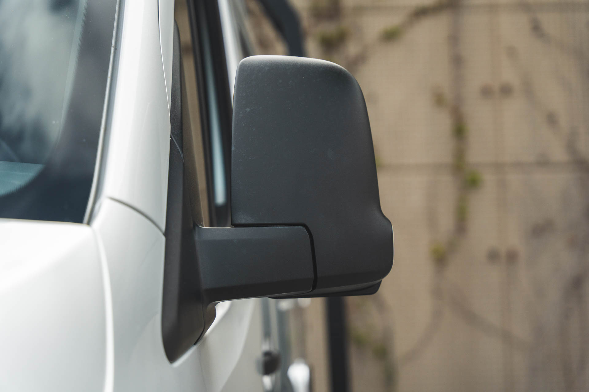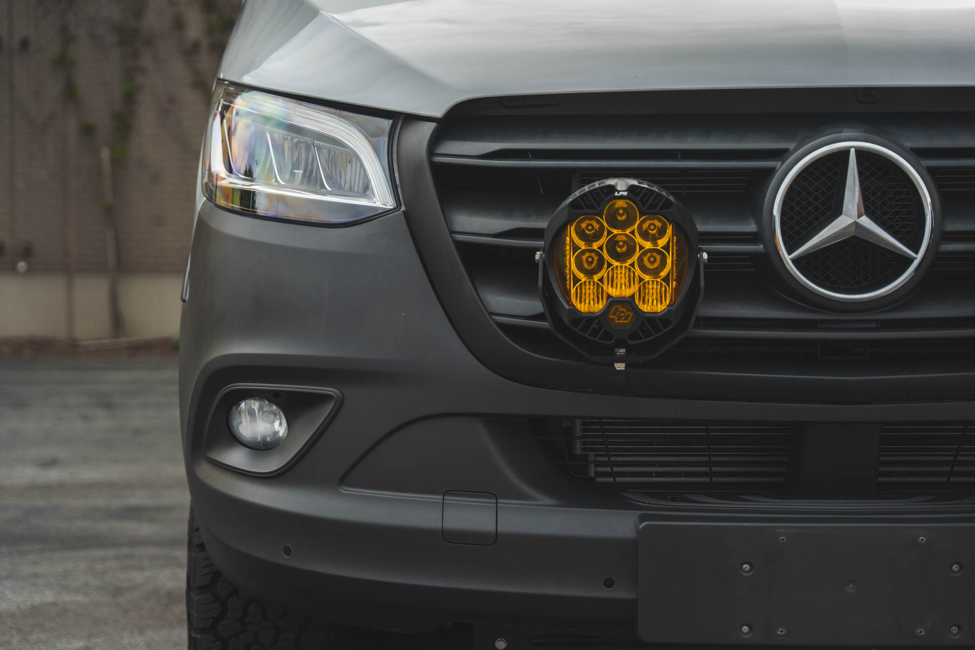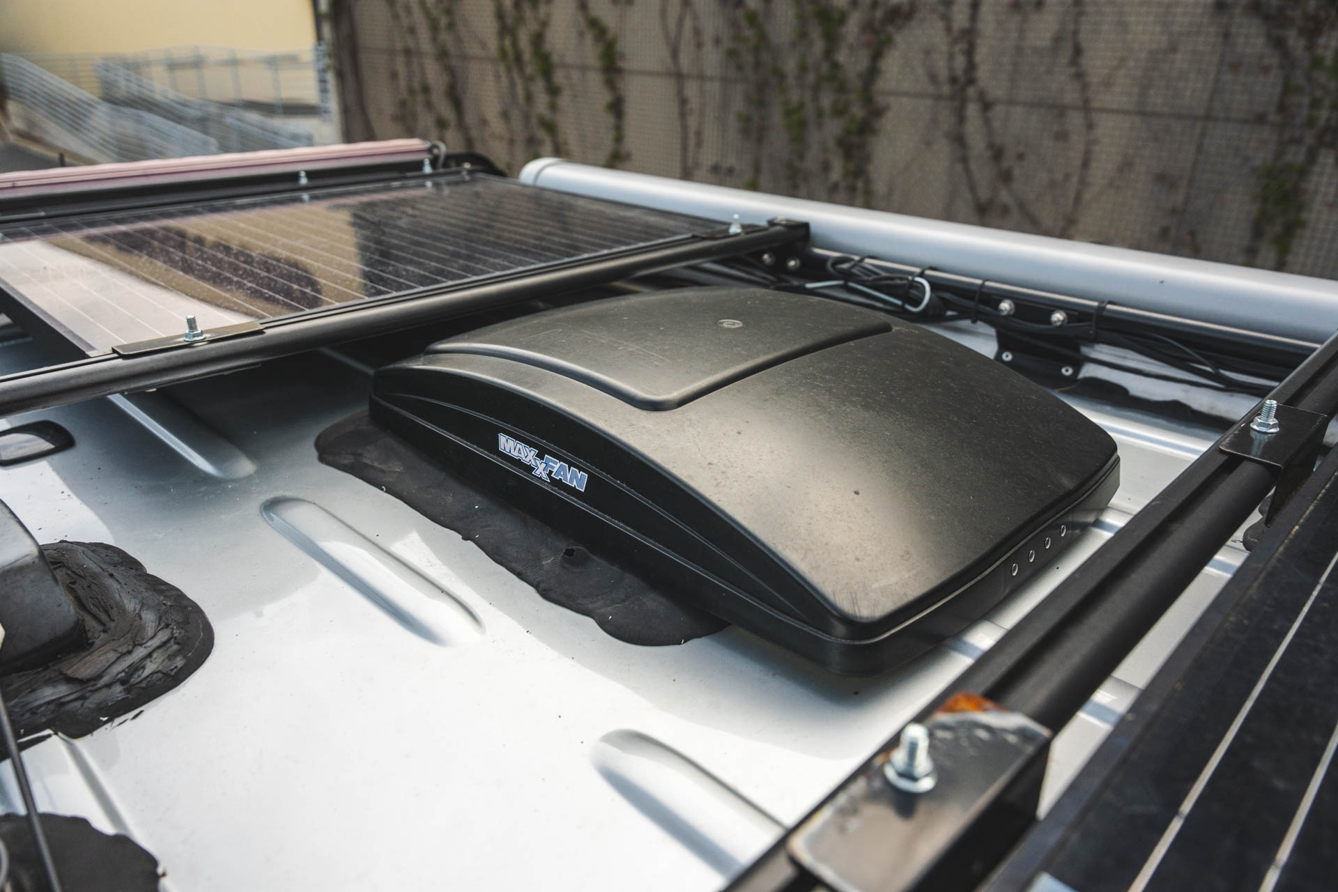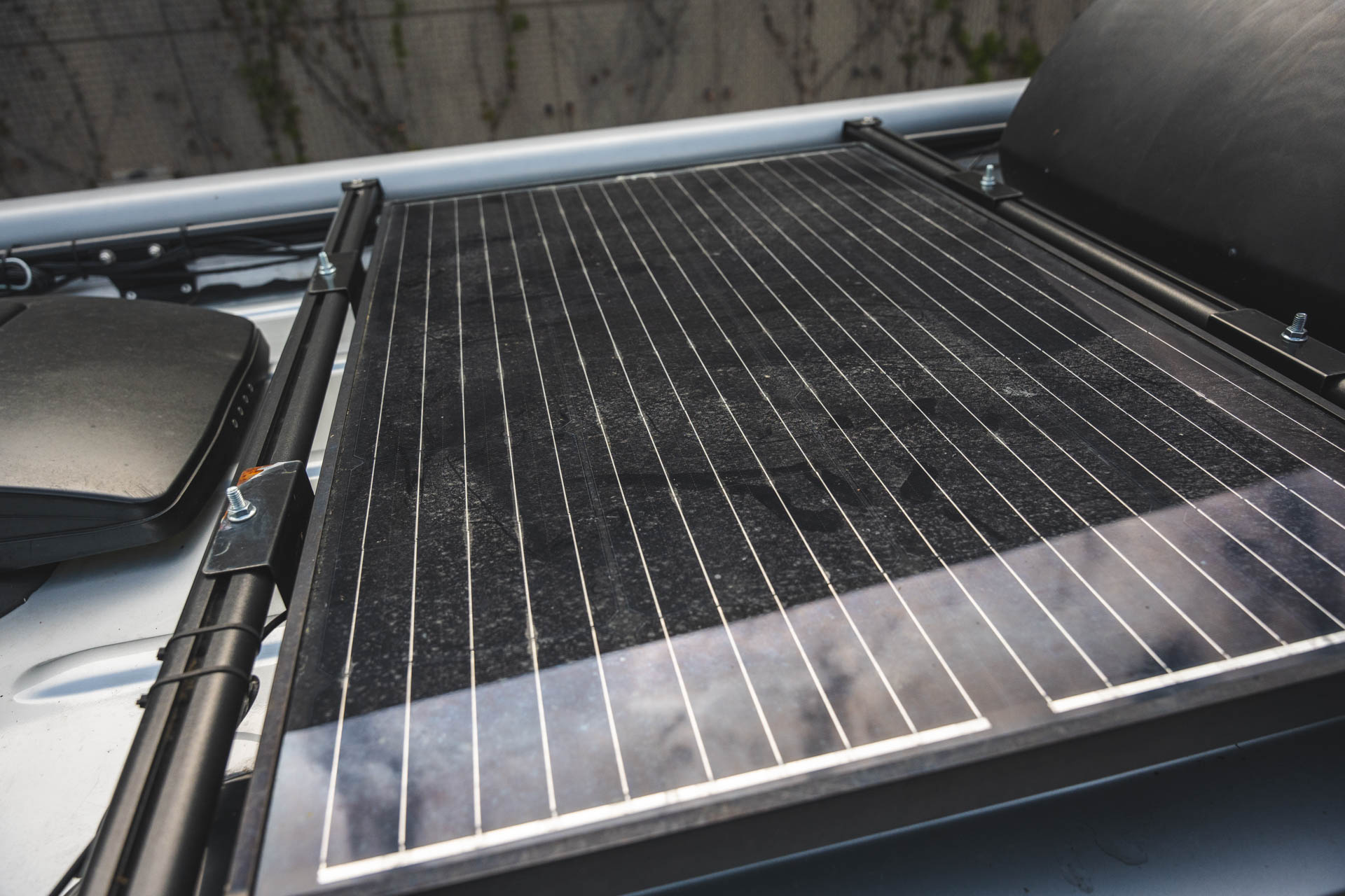 The extended-height body is finished in silver with black lower bodywork and Revel graphics. The van features a sliding side door, rear barn doors, a power-operated awning, an Agile Offroad roof rack, rooftop solar panels, running boards wrapped in black vinyl, and Terrawagen Mondo Mudguard wheel-arch flares as well as Baja Designs amber driving lights, front and rear LED light bars, and side lights. Owl Vans accessories include an aluminum cargo box, a firewood box, a hitch step, and a rear ladder with an integrated tire carrier, while additional equipment consists of a Backwoods side ladder, a Rotopax toolbox and auxiliary fuel carriers, and Maxtrax traction boards as well as shore connections for water, power, and waste disposal.