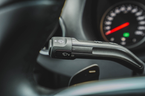 The leather-wrapped multifunction steering wheel sits ahead of a 130-mph speedometer, a 5k-rpm tachometer, a digital information display, and gauges for coolant temperature and fuel level. The digital odometer indicates 18k miles.