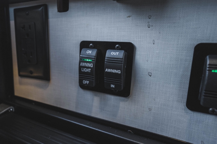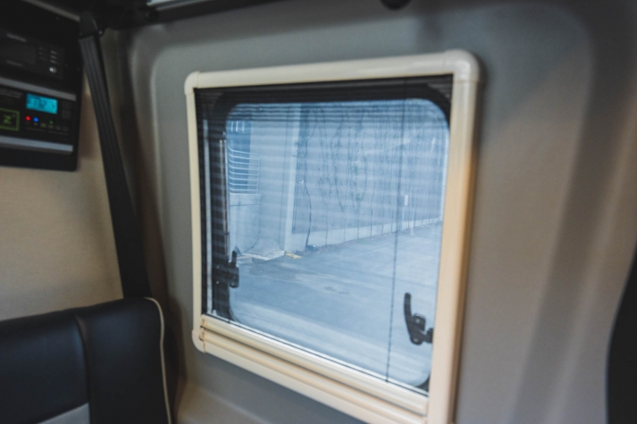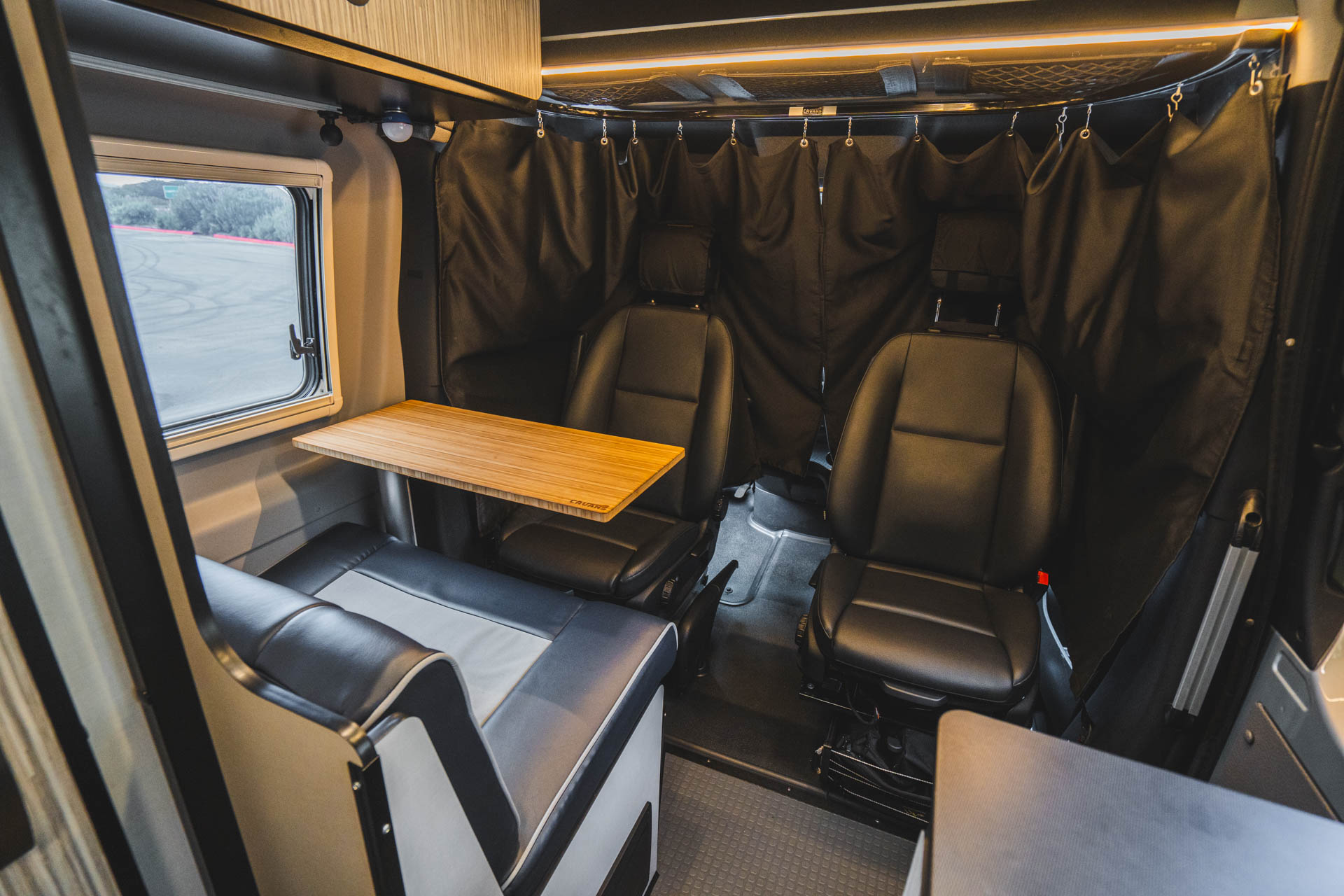 The rear compartment features Canyon Adventure Vans accessories including an arm-mounted swiveling table, a folding table, a padded bench seat, cabinets with sliding doors, a step, bed risers, a Luxe6 Cool Gel foam mattress, and Revel Dream sheets. A power-operated lift enables the sleeping surface to be raised for stowage. Additional equipment includes air conditioning controls, bump-out side panels, an outdoor shower connection, USB and 110-volt outlets, a roll-up rear screen door, and a left-side window with a shade.
