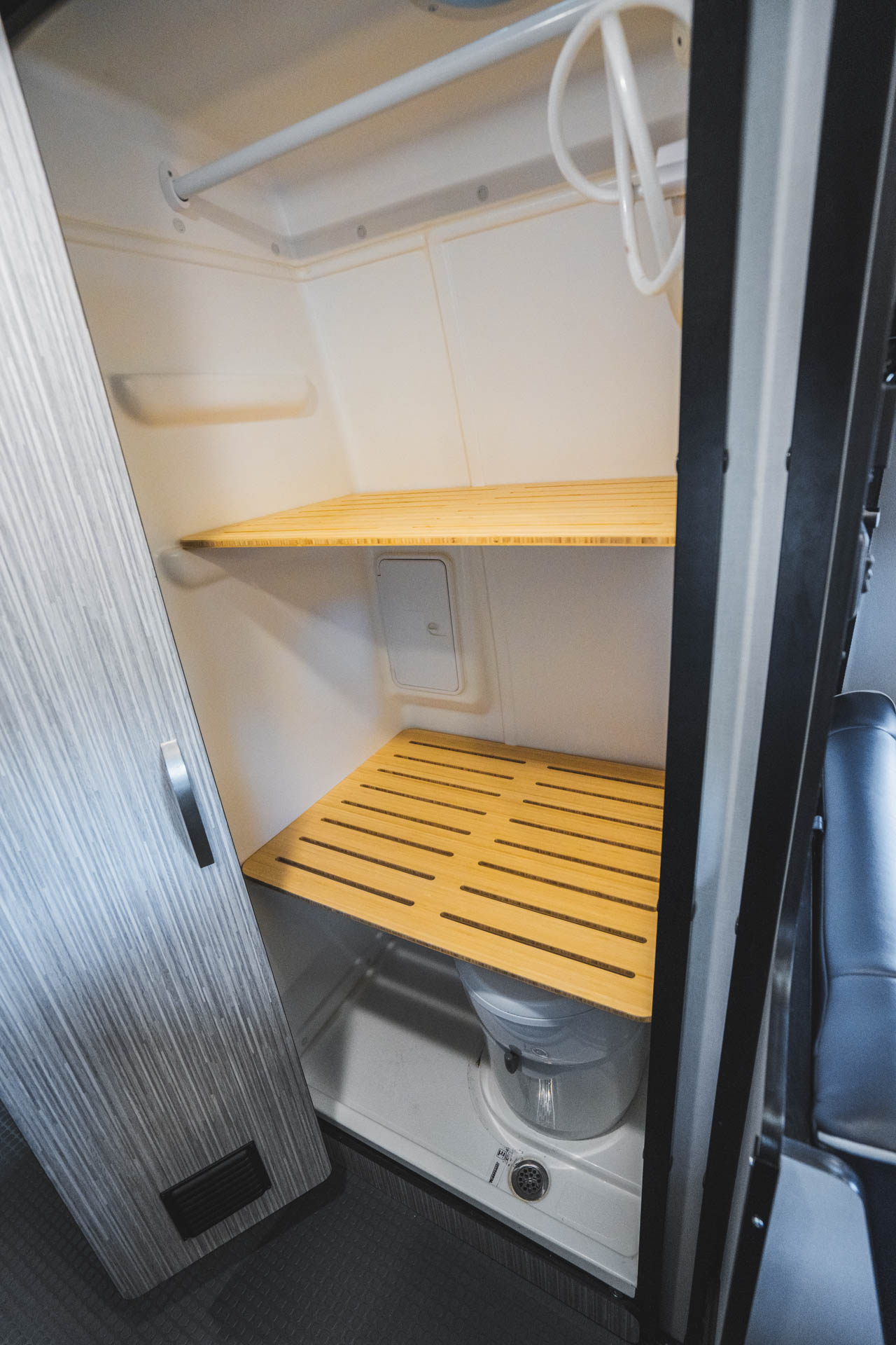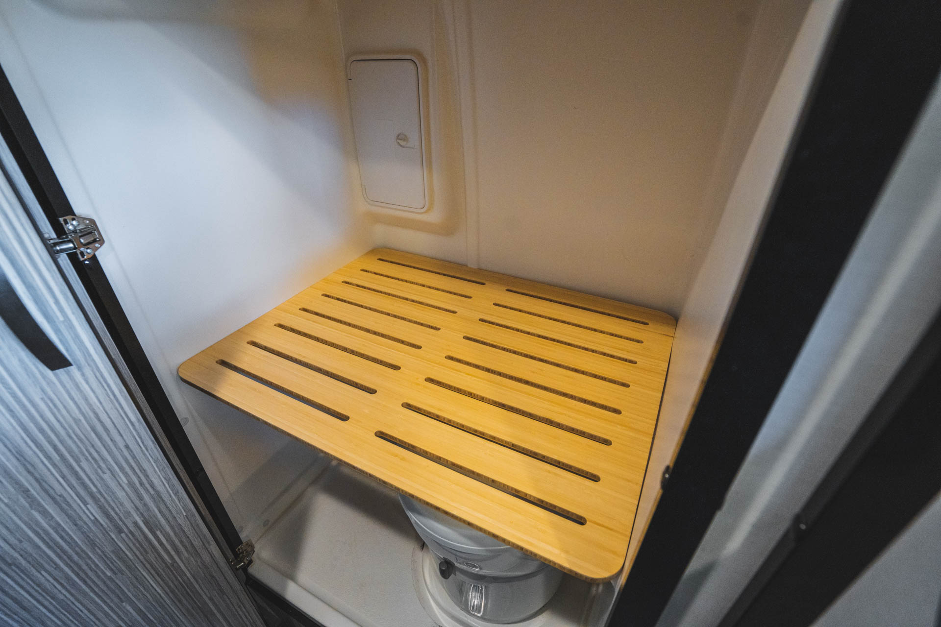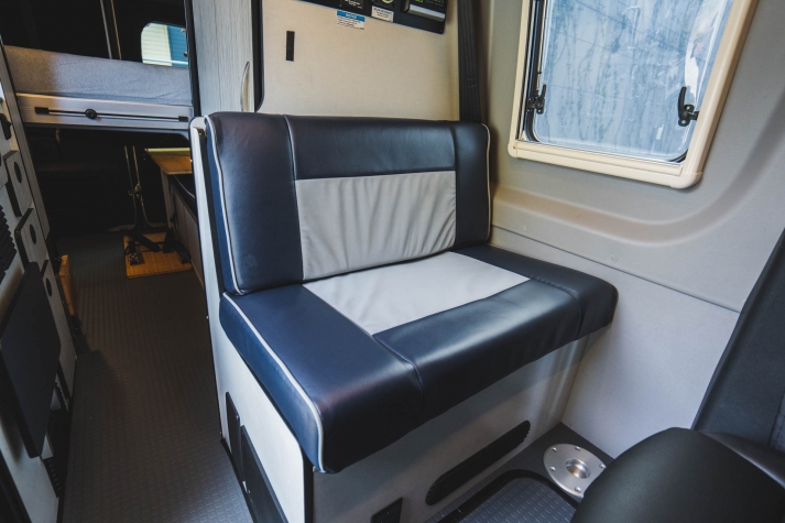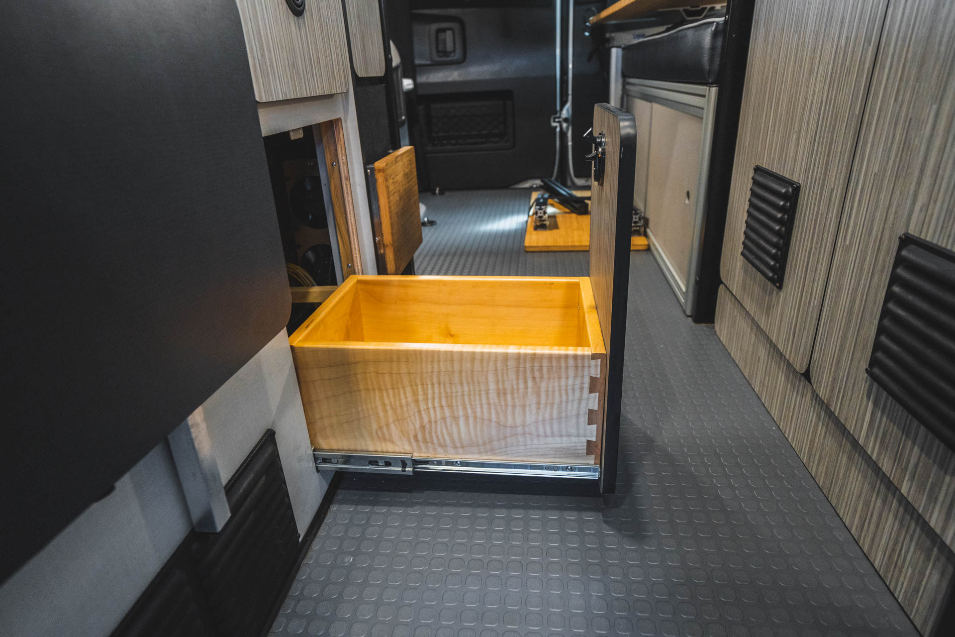 The living quarters are outfitted with LED lights, overhead storage cabinets, 110-volt outlets, USB ports, a weBoost cell signal booster, and privacy curtains. The workspace/dinette is furnished with a Canyon Adventure Vans butcher block-style table as well as a platform that converts the bench seat to a sleeping surface for a dog. The kitchenette is equipped with a sink and a David Clauson cutting board as well as electric appliances including a True Induction cooktop, a Nova Kool refrigerator/freezer, and a demand-service water heater. The wet-bath style bathroom features a shower, a cassette toilet, and removable bamboo shelving. A Coleman Mach house air conditioner is mounted overhead, and a system panel above the workspace houses controls for the cabin heater, solar charger, power systems, and holding tanks.