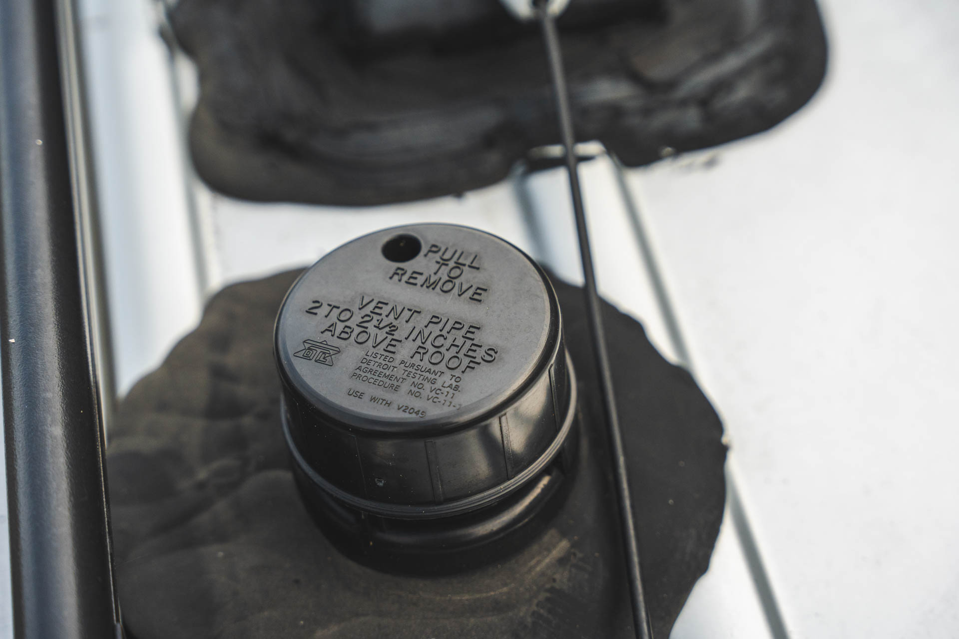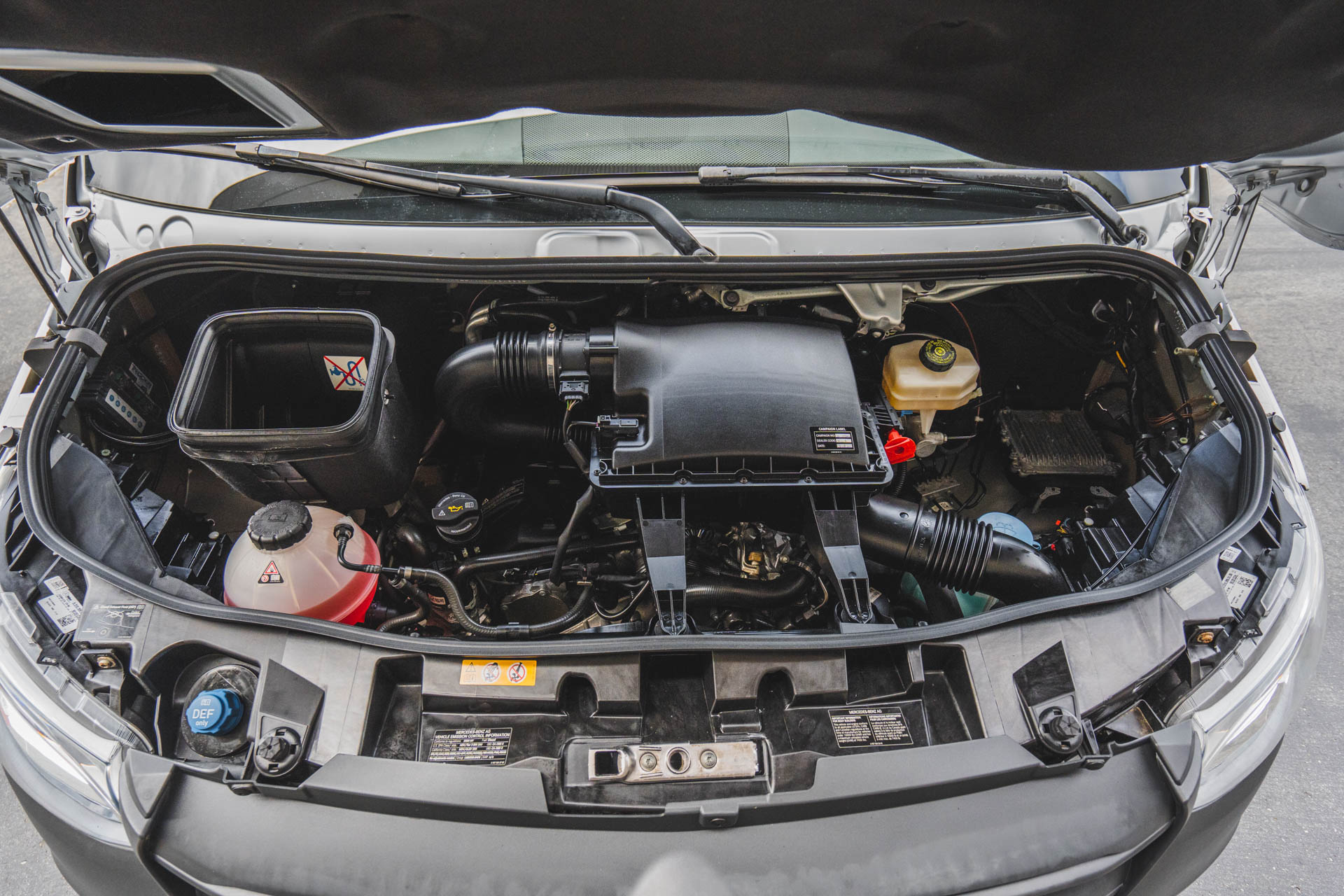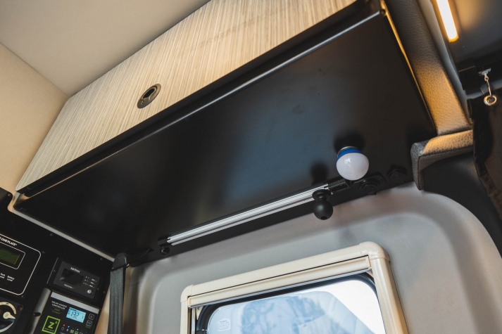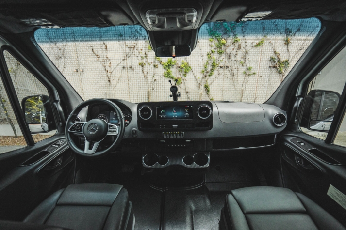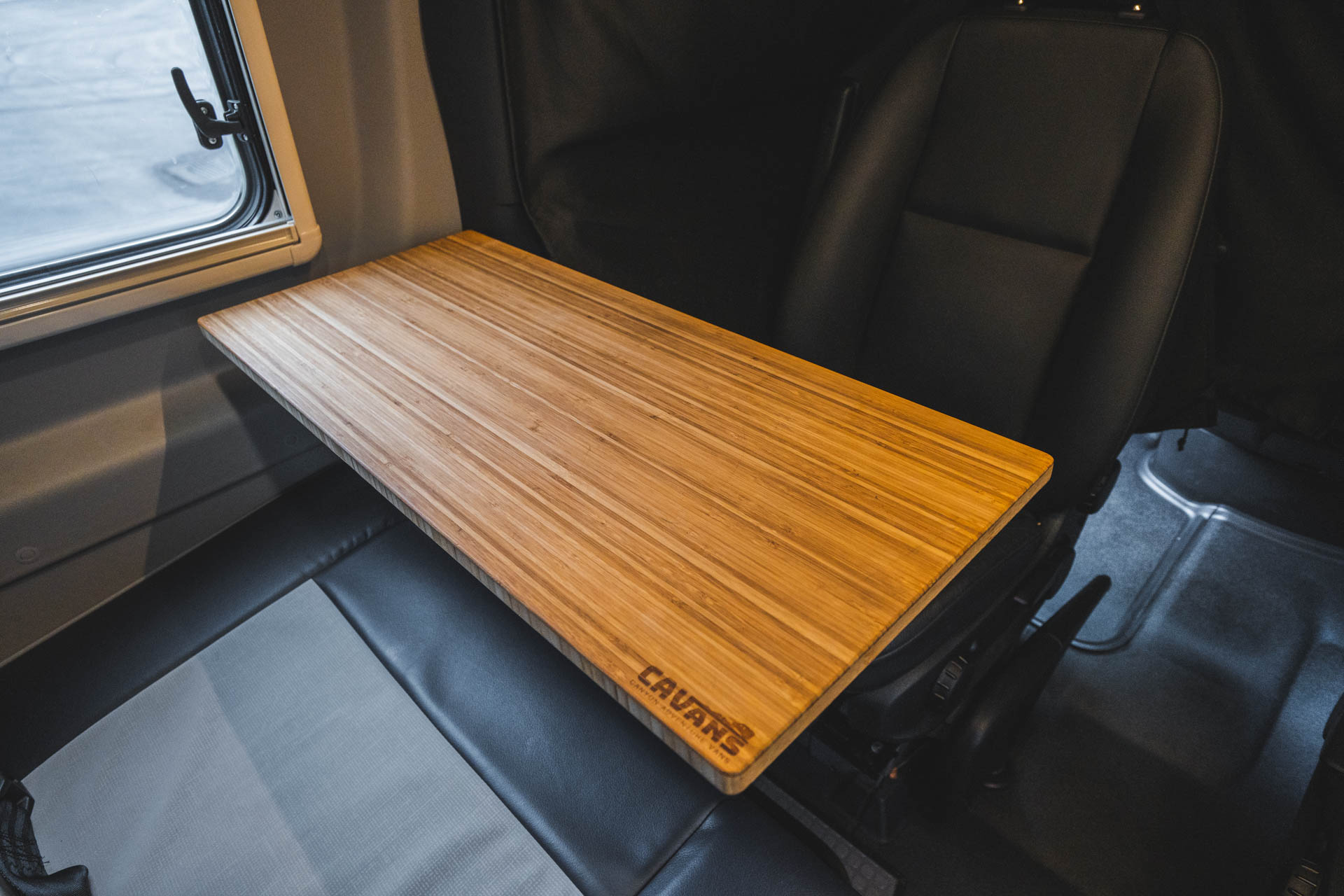 The living quarters are outfitted with LED lights, overhead storage cabinets, 110-volt outlets, USB ports, a weBoost cell signal booster, and privacy curtains. The workspace/dinette is furnished with a Canyon Adventure Vans butcher block-style table as well as a platform that converts the bench seat to a sleeping surface for a dog. The kitchenette is equipped with a sink and a David Clauson cutting board as well as electric appliances including a True Induction cooktop, a Nova Kool refrigerator/freezer, and a demand-service water heater. The wet-bath style bathroom features a shower, a cassette toilet, and removable bamboo shelving. A Coleman Mach house air conditioner is mounted overhead, and a system panel above the workspace houses controls for the cabin heater, solar charger, power systems, and holding tanks.