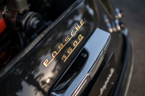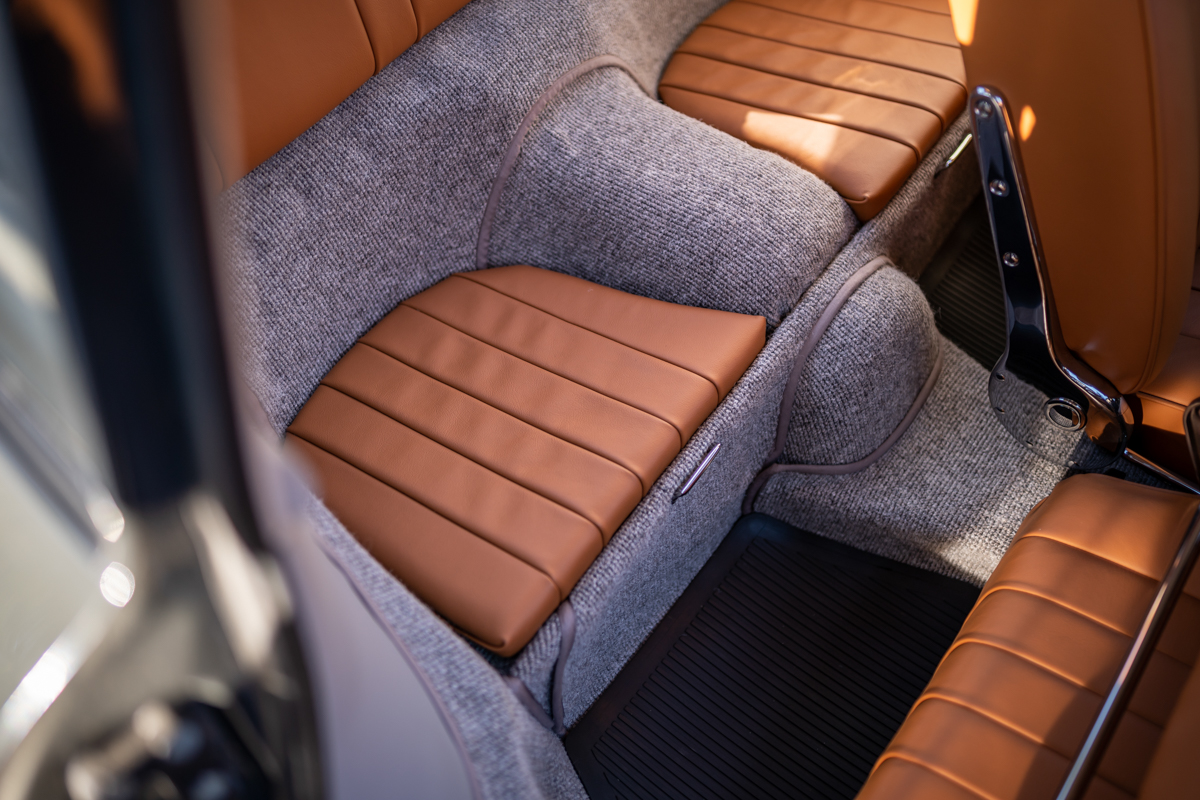 The owner is said to have replaced rust-prone areas of the chassis including the floors, longitudinals, battery box, and other structural panels with reproduction sheet metal. The original nose clip was replaced with one of 1962 vintage, and many of the suspension parts are also of that year. A 1964 356C 1600 case was rebuilt with Shasta “big-bore” pistons and cylinders, an SC crankshaft, and a sport exhaust. As a standard 1600 “C” engine is rated at 75 brake horsepower, this unit would likely develop something in the area of 80 or more, and the car is said to perform well. Power is transmitted via a rebuilt Type 741 four-speed manual transmission. Drum brakes were retained, but now rest behind aftermarket 4.5 by 15-inch chrome rims with 1600S crested hubcaps. New Michelin radial tires were fitted in 2016.