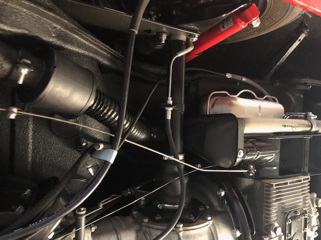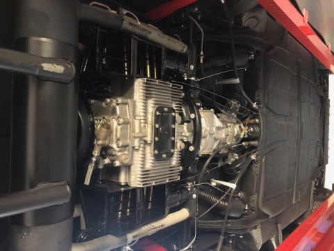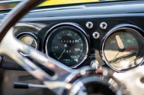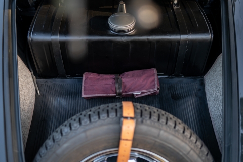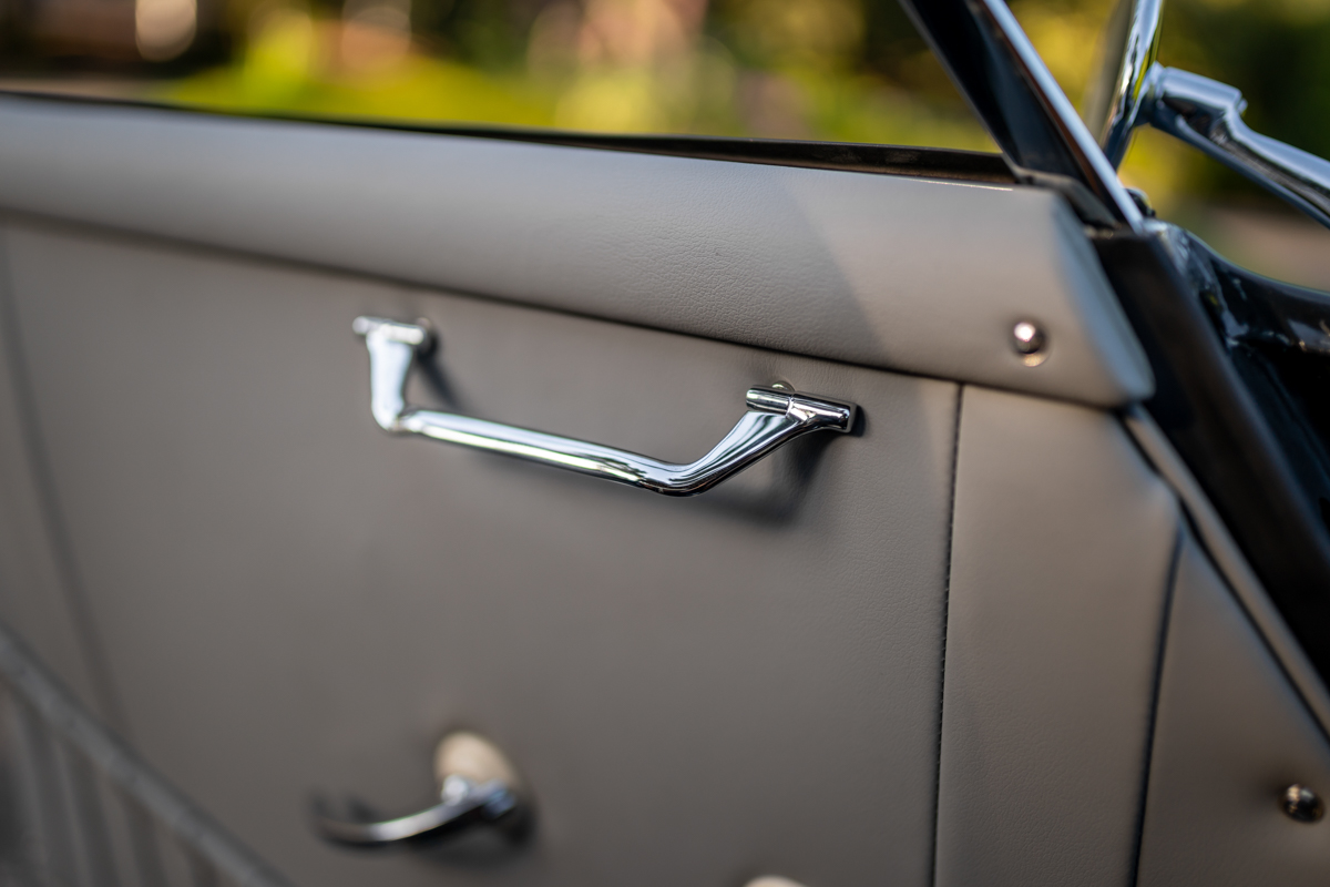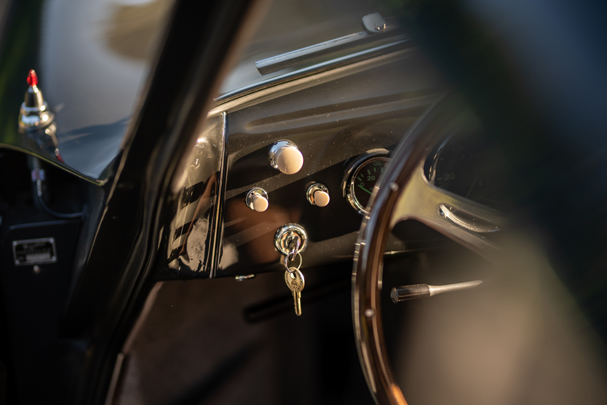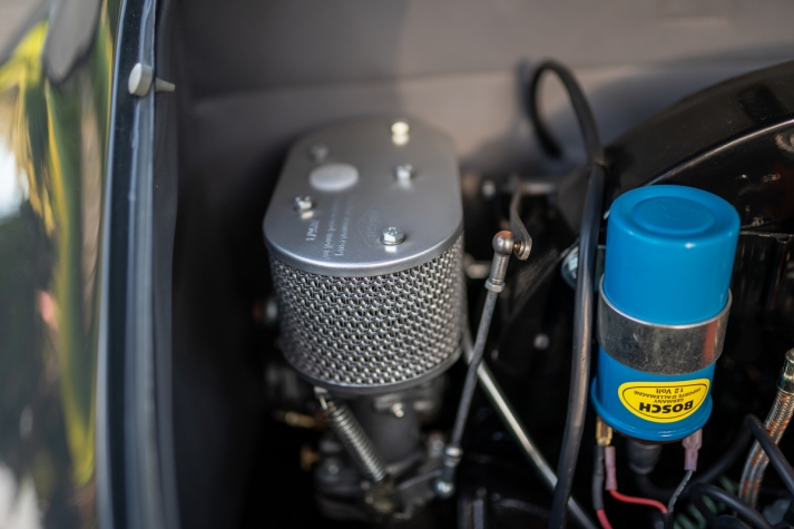 The bodywork shows good panel fit and door gaps. It was resprayed an attractive and period-correct Slate Gray and the interior reupholstered in a combination of light gray and butterscotch, with gray carpeting and black rubber floormats. The nicely-detailed engine compartment is also lined with grey leatherette. Period-correct optional green-tinted plastic sunvisors are fitted to the windshield header, and there is a Derrington-style wood-rimmed alloy steering wheel. There is a radio, but it is non-functional. The owner replaced much of the exterior bright-work, and a new German Sigla windshield was installed, along with LED tail lamp bulbs.