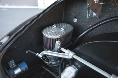 The air-cooled 1.6L flat-four utilizes an engine case sourced from a VW Type 2 equipped with dual Weber carburetors, a 123Ignition electronic distributor, an electric fuel pump, and an A-1 Sidewinder exhaust system.