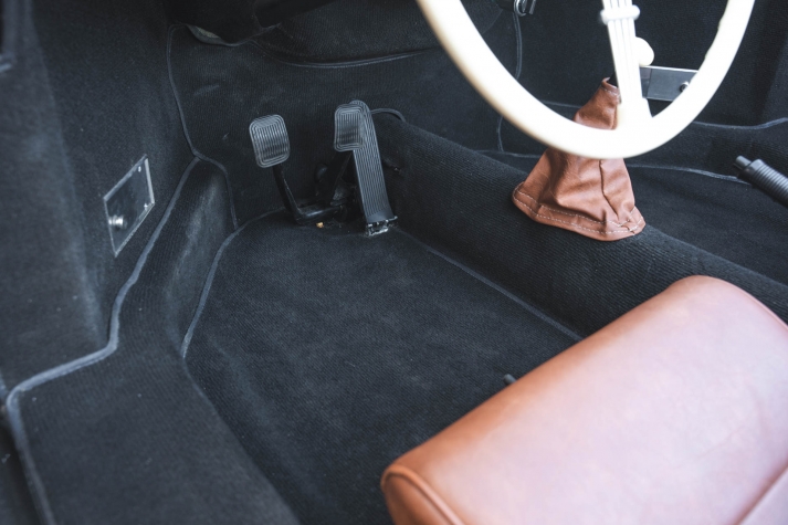 The chrome 15? steel wheels wear matching hubcaps with stamped Wolfsburg crest logos and are mounted with 185/65 Pirelli P4 tires. The car rides on EMPI dampers, and stopping power is provided by front disc and rear drum brakes.