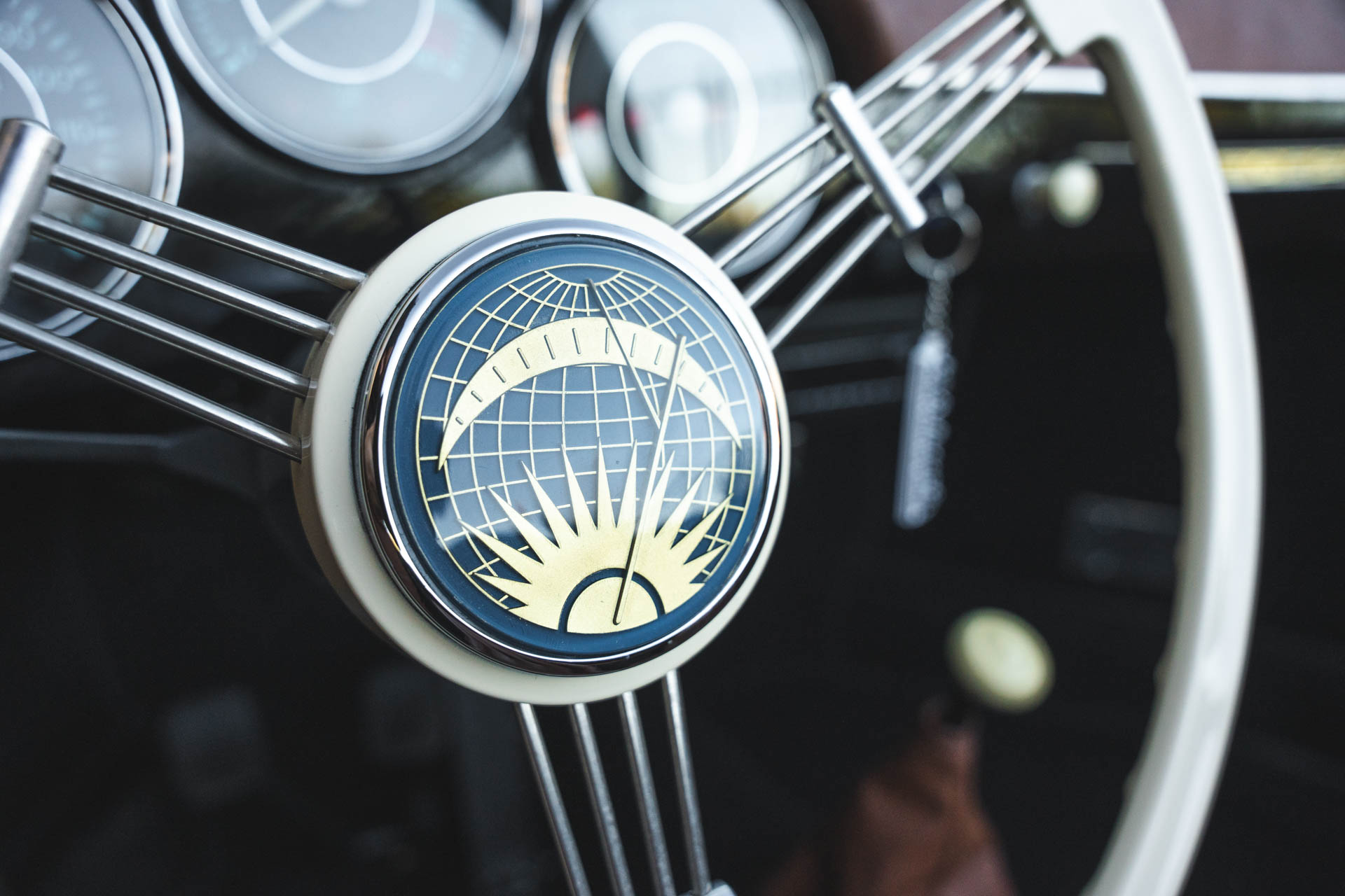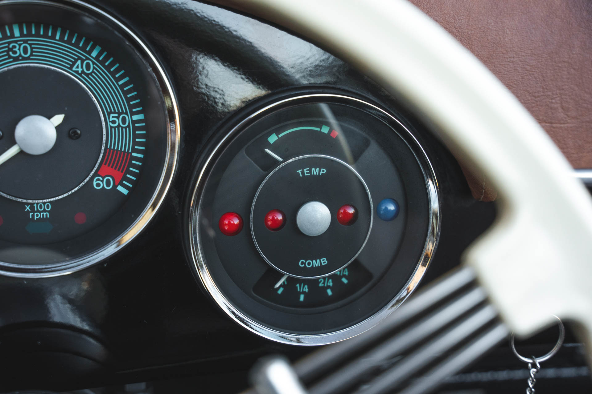 The banjo-style steering wheel wears a “Sun and Moon” horn button and frames a central tachometer flanked by a 130-mph speedometer and a combination gauge for engine temperature and fuel level. The six-digit mechanical odometer shows 5k miles.