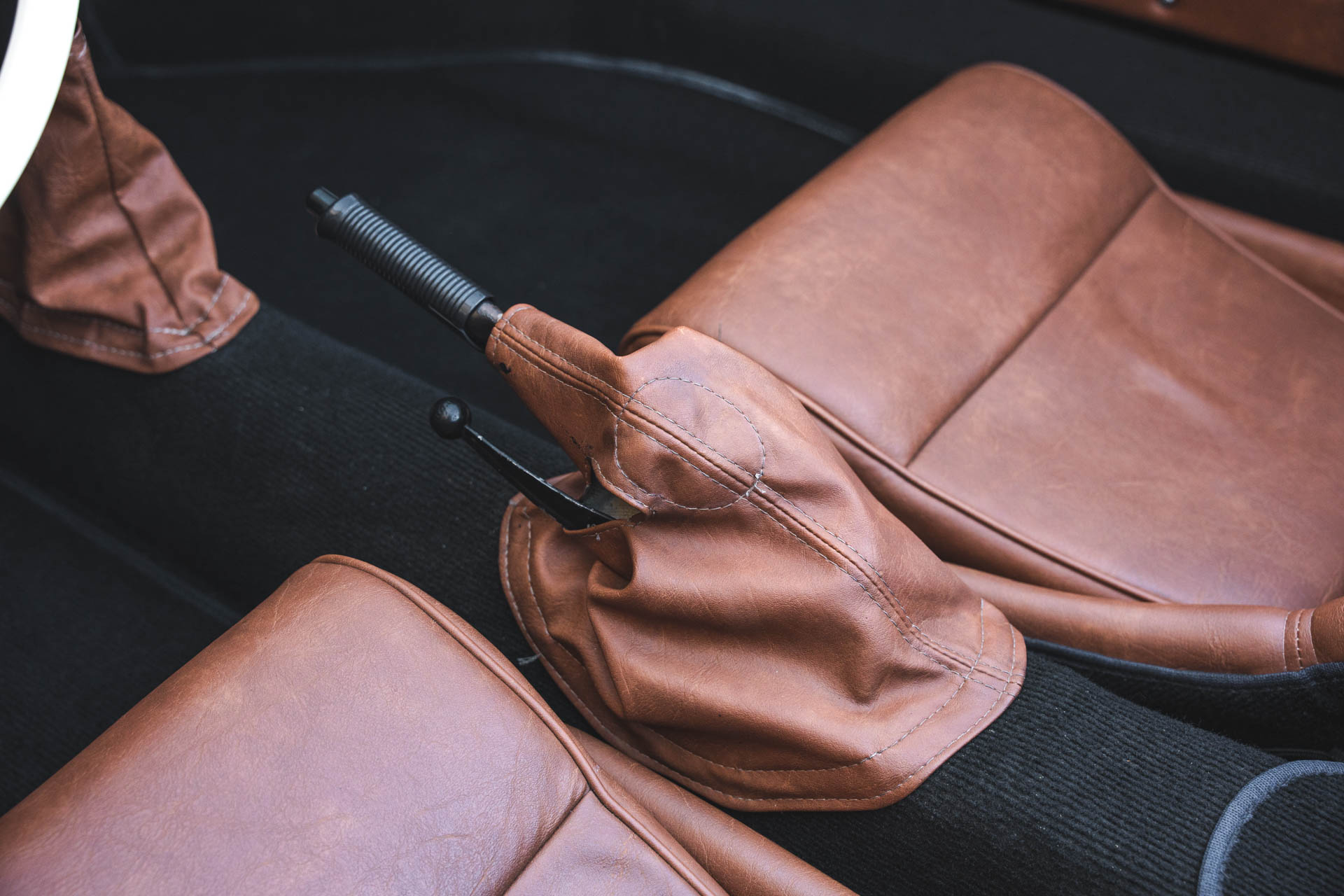 The fixed-back bucket seats are trimmed in brown leather, which extends to the dashboard pad, door panels, shifter and parking brake boots, and rear parcel shelf. Black square weave carpets line the footwells, and additional interior elements include an adjustable-height rearview mirror, lap belts, a passenger grab handle, a 12-volt charging outlet, and a Sony Xplod CD stereo.