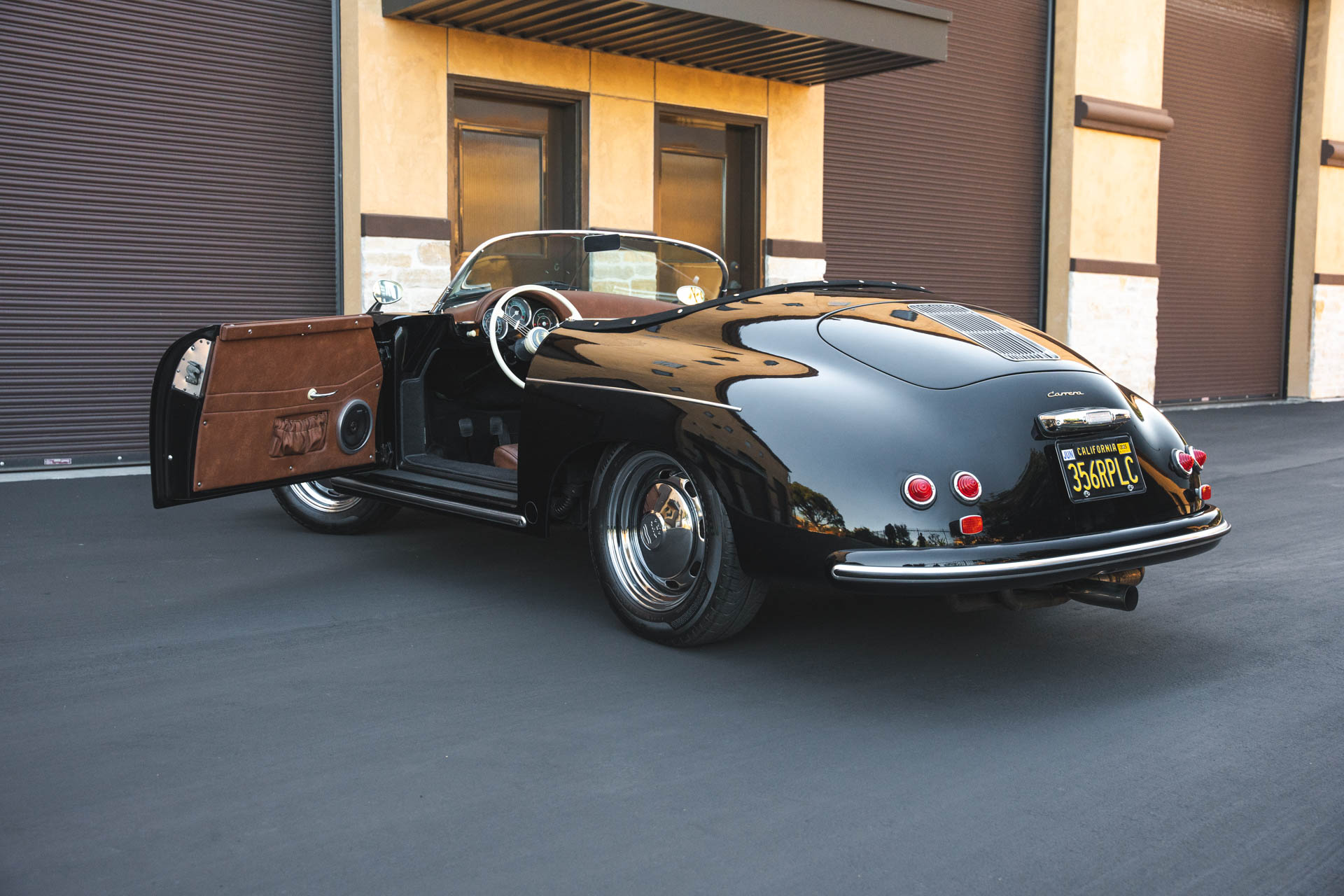 The fiberglass body is fitted over a modified Volkswagen chassis and is finished in black with a matching convertible soft top, side curtains, and boot cover. Exterior details include headlight stone guards, driving lights, fender-mounted mirrors, gold-finished Porsche Speedster and Carrera badging, a single grille decklid, beehive taillights, a center-exit exhaust outlet, and body-color bumpers with rub strips.