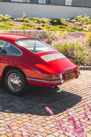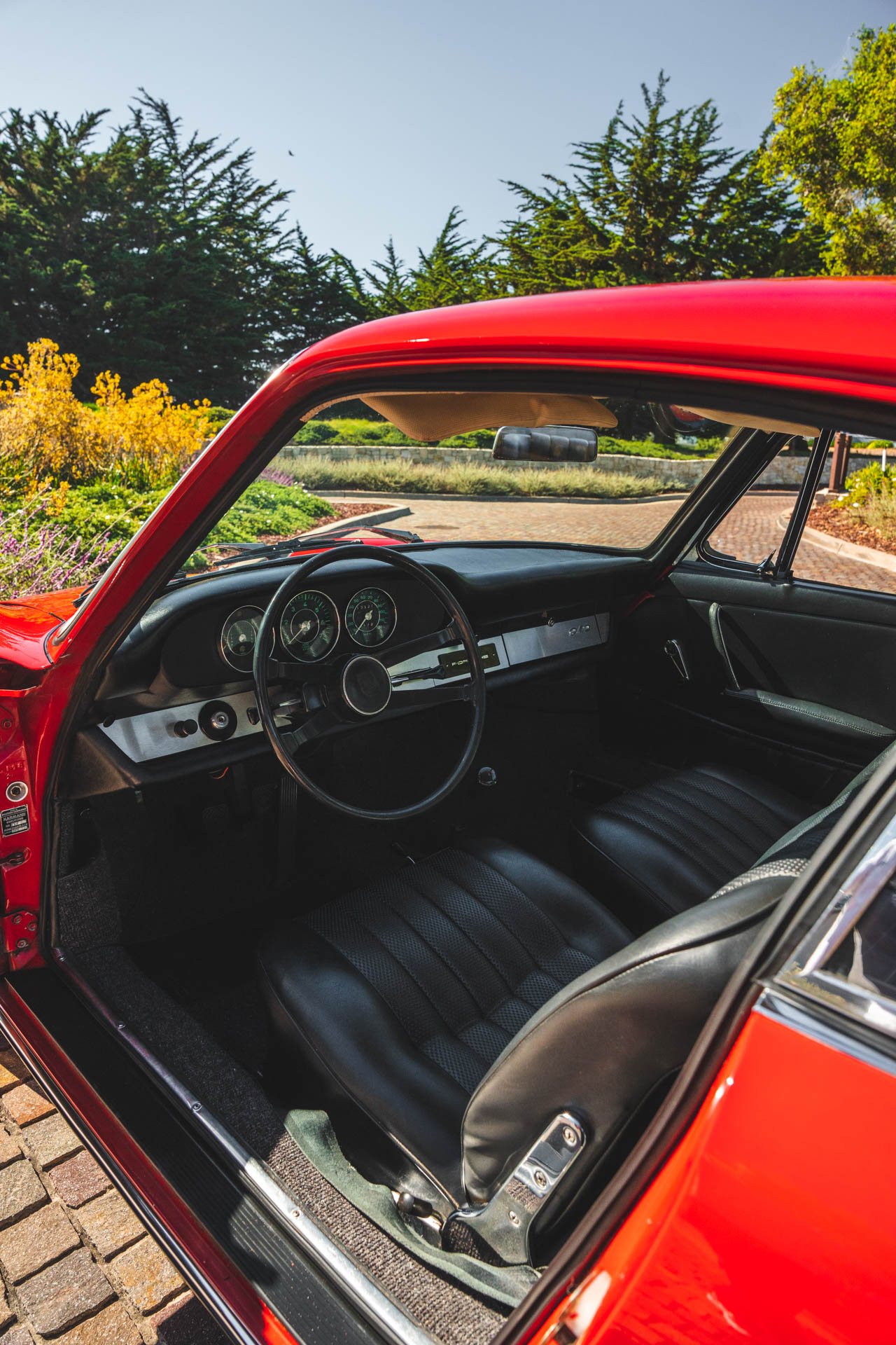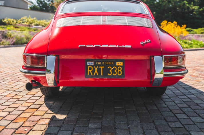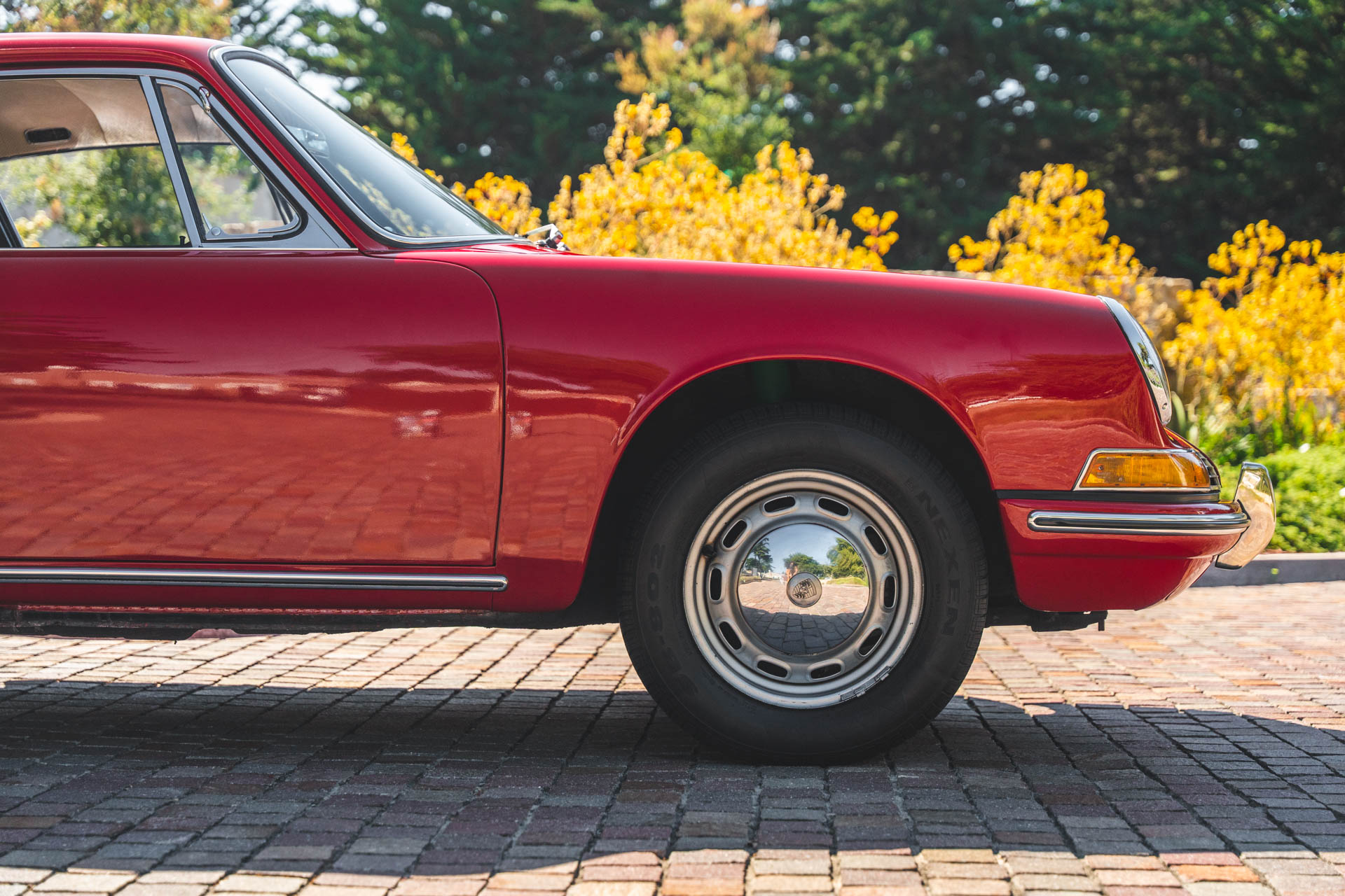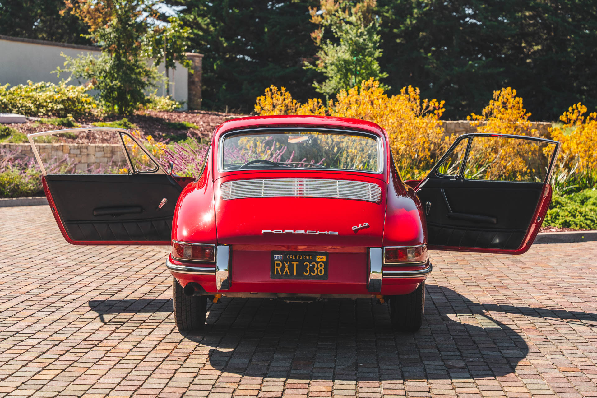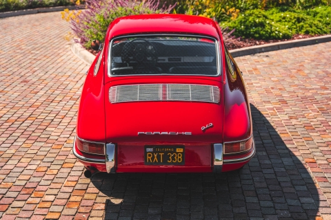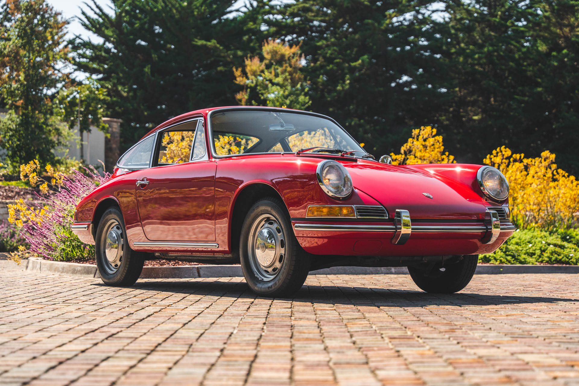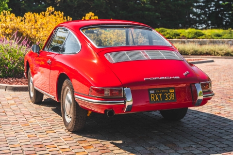This Porsche 912 coupe was purchased by the current owner’s father as a gift for her upon her discharge from the military in 1965. Delivered in January 1966, it has since remained in the bay area with black-on-yellow California plates and been driven approximately 325k miles. The car has been twice refinished in its original shade of Signal Red, and it was ordered with a five-speed manual gearbox, black leatherette upholstery, and Dunlop tires. Notable work over the past 20 years consisted of a rebuild of the 1.6-liter flat-four, retrimming the interior, and most recently a respray of the exterior in 2016. This SWB 912 coupe is now offered on dealer consignment with a window sticker, service records dating to the 1960s, handwritten notes, black California plates, and a clean California title.
