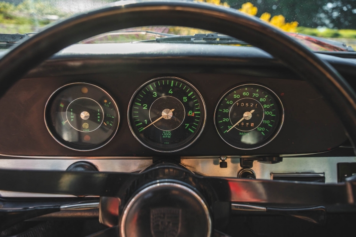 The four-spoke steering wheel sits ahead of green-script VDO instrumentation including a centrally mounted 7k-rpm tachometer flanked by a 120-mph speedometer and a combination gauge for fuel level and oil temperature. The five-digit odometer has rolled over three times and now shows 10,500 miles, and records indicate the owner has driven the car approximately 325k miles.