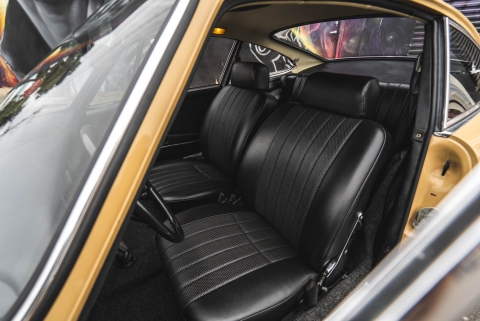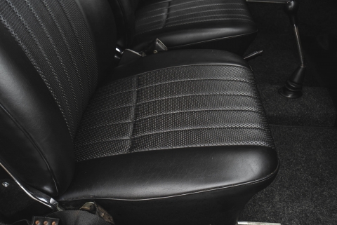 The cabin features seats trimmed in black upholstery along with a matching dashboard, door panels, carpets, and floor mats. The dashboard houses heater controls and a lockable glovebox.