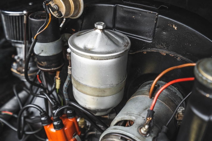 The 1.6-liter Type 616/40 flat-four features dual carburetors and air-filter assemblies, and it was factory rated at 102 horsepower. Photographs of compression-test readings can be seen in the gallery below.