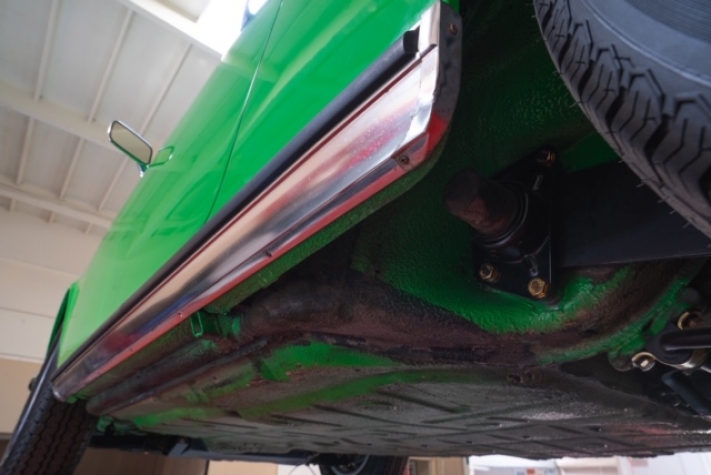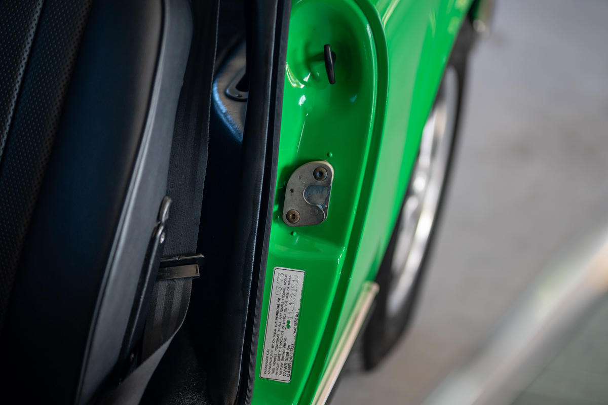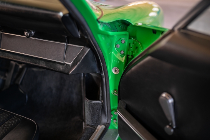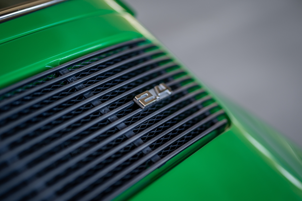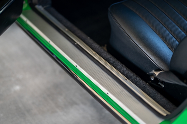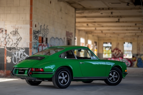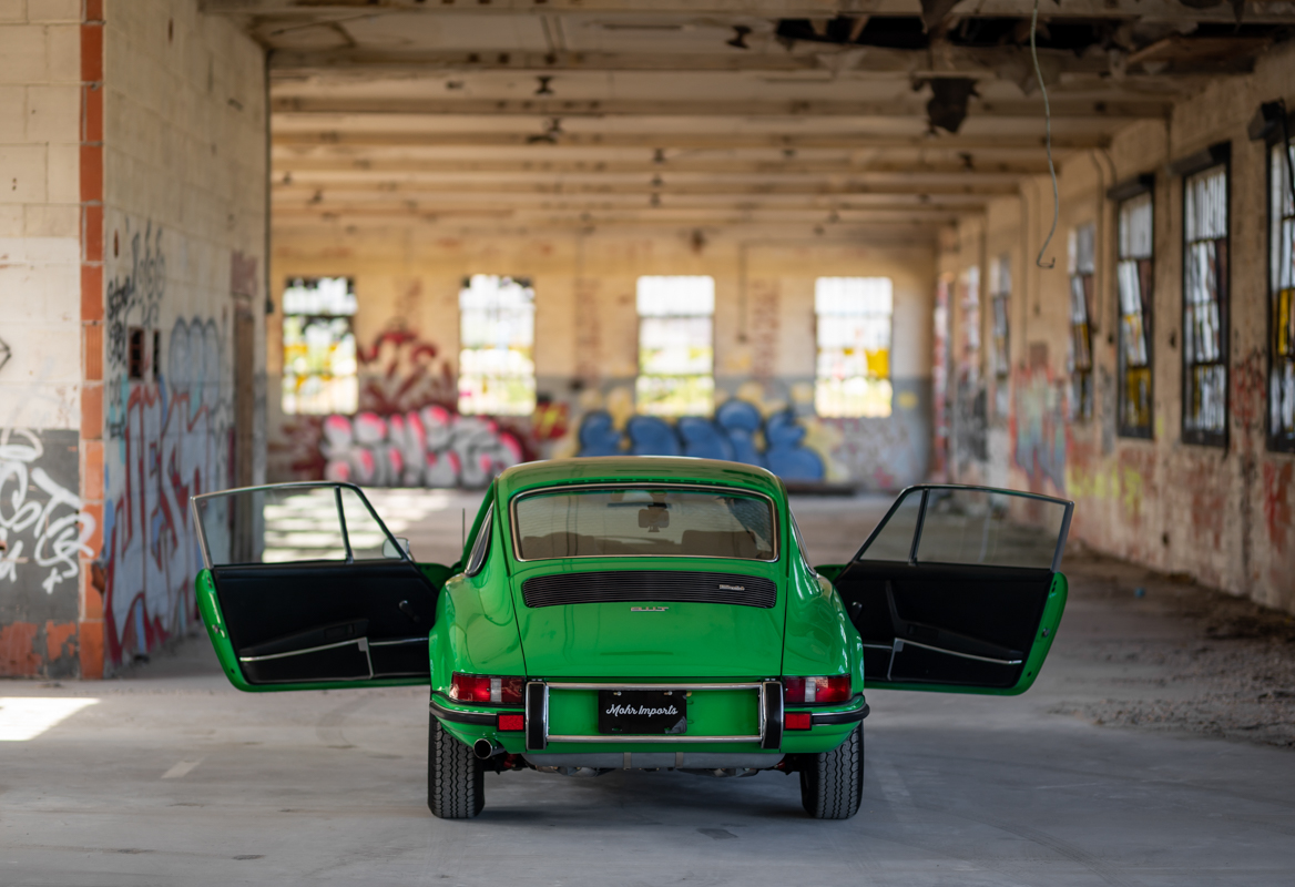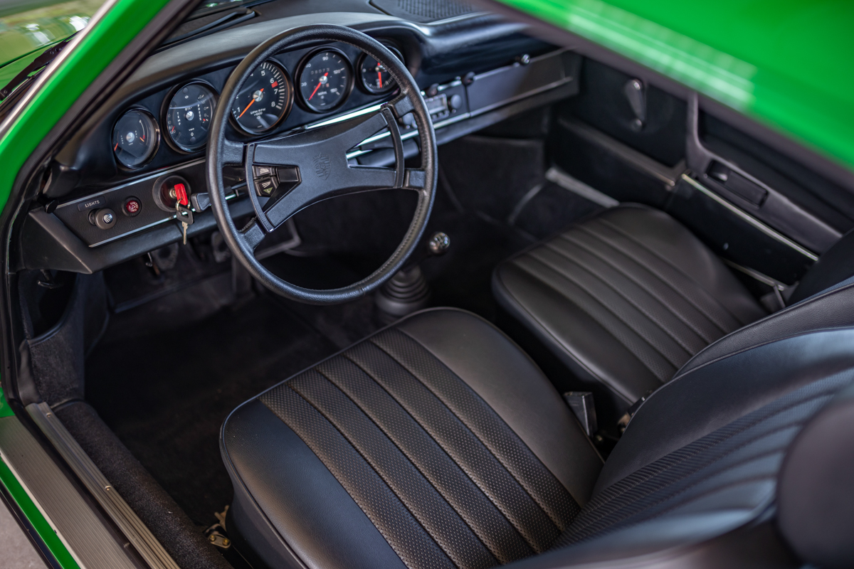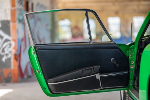 This 1973 Porsche 911T coupe is finished in Viper Green over a black leatherette interior and is powered by a 2.4-liter flat-six paired with a five-speed manual transaxle. The car has been refurbished, and work reportedly included rebuilding the cylinder heads, installing stainless steel Dansk heat exchangers, reupholstering the interior, refinishing the Fuchs wheels, replacing the fuel tank, and overhauling the brakes and suspension. The body was refinished in Viper Green and features polished window trim, deleted front bumperettes, a 911S-style front lip, and halogen headlights. Close-up photos of the paint, trim, and lenses can be viewed in the gallery.