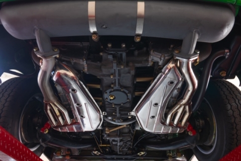 Power is routed to the rear wheels through a five-speed manual transaxle, and refurbishment work reportedly included replacing the mounts, seals, third-gear synchro, and both drive axles. The stainless steel Dansk heat exchangers are pictured above.