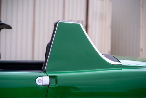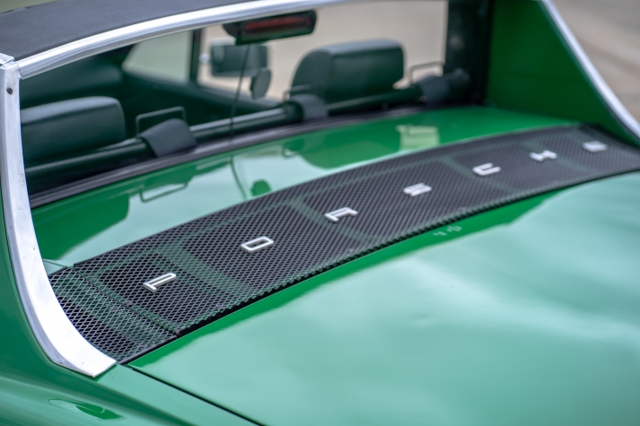 The car is finished in green with a removable black Targa roof panel that fits in the rear trunk. The bumperettes have been removed and their holes plugged, and clear front turn signals have been installed. A Hella fog light wiring harness was installed in June 2022.