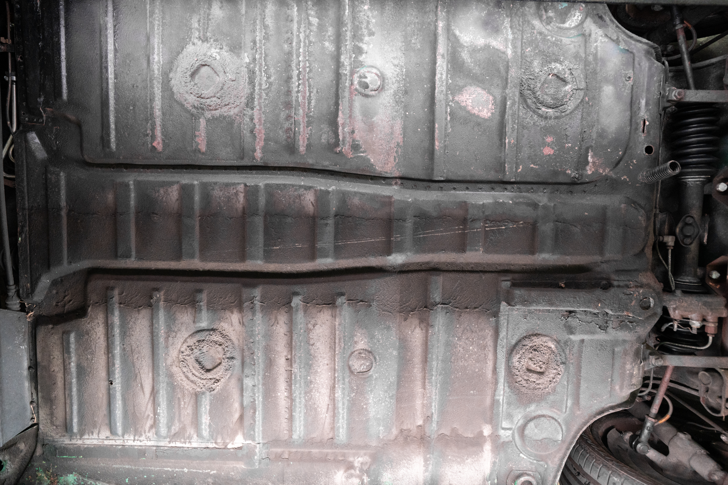 Power is delivered to the rear wheels through a five-speed manual transaxle. Corrosion is noted on the underbody, and additional photos of the underside are presented in the gallery below.