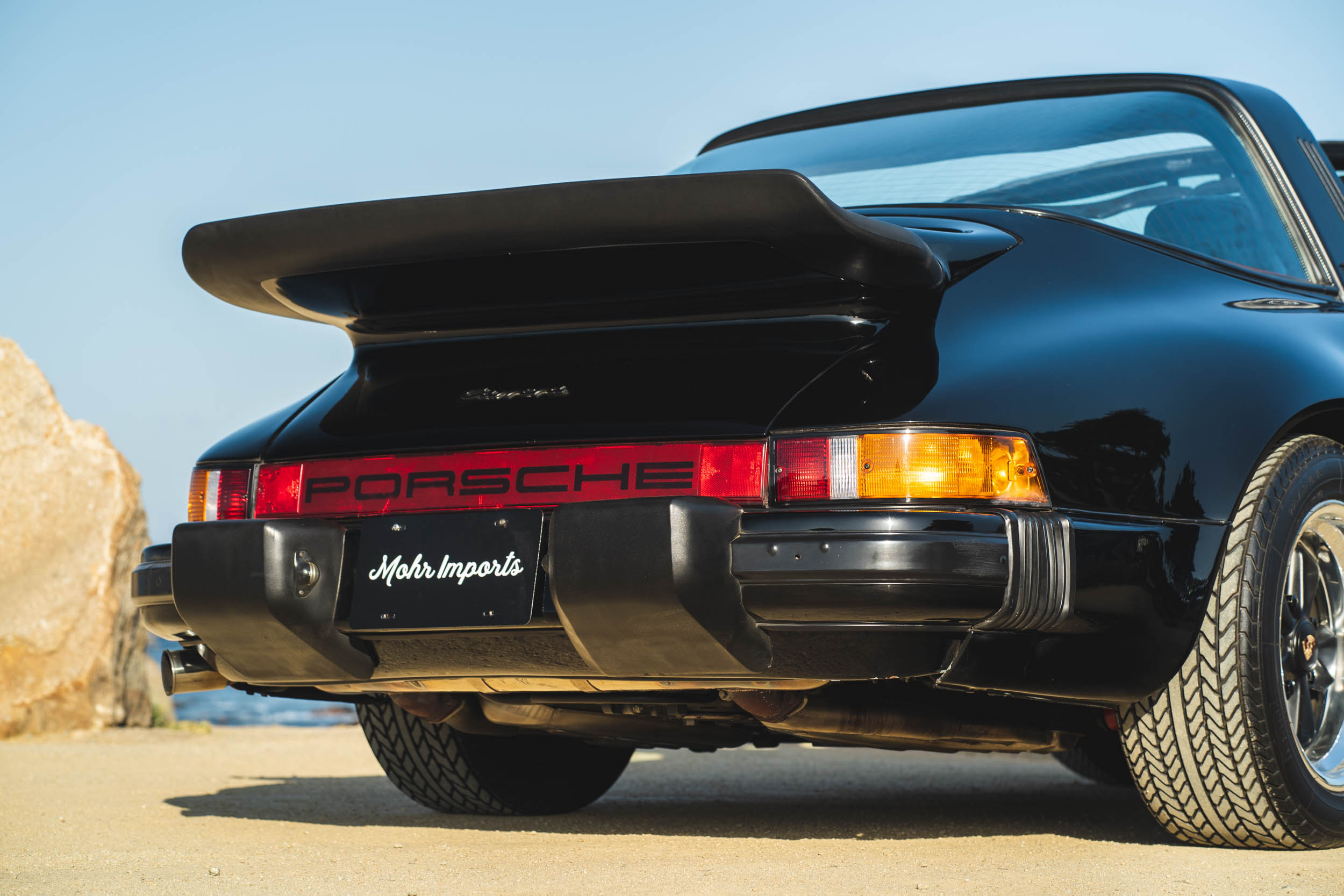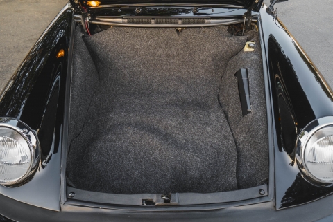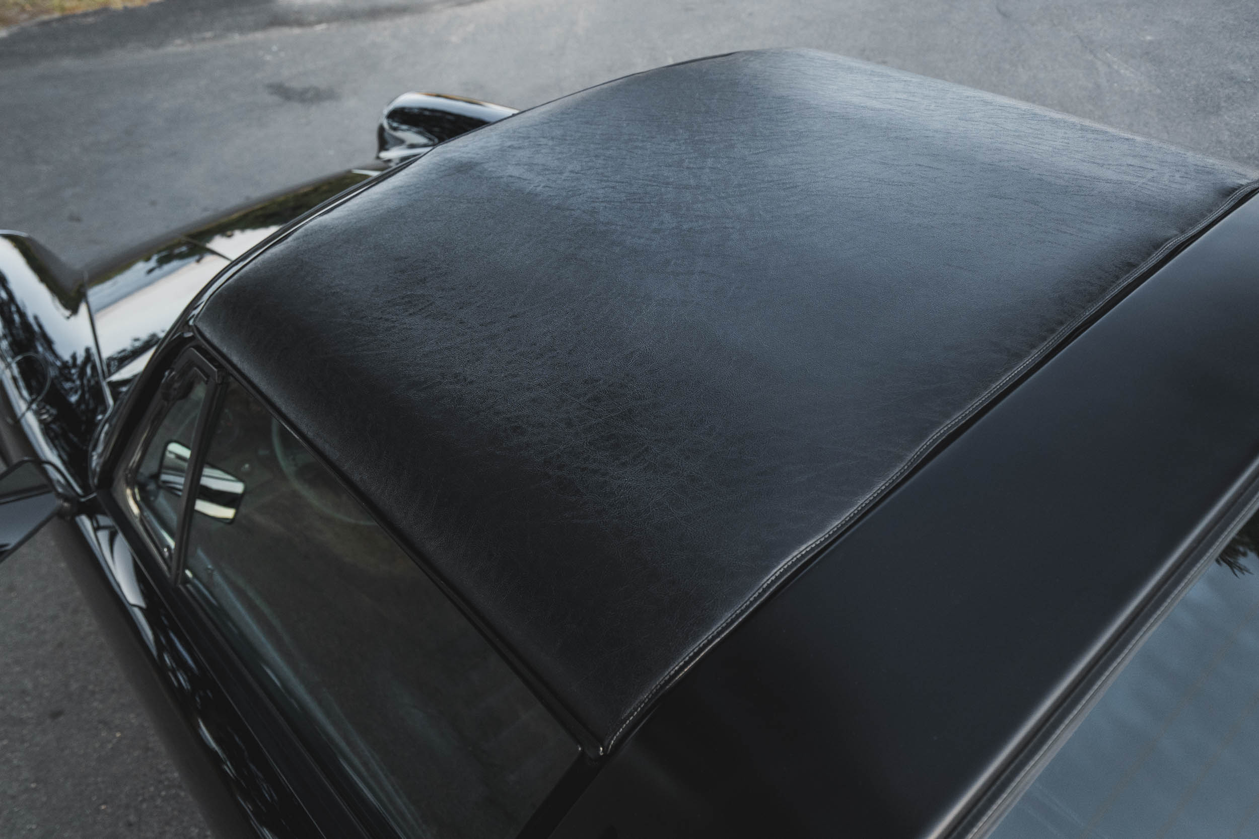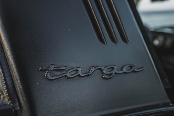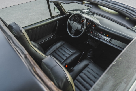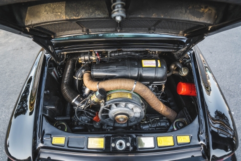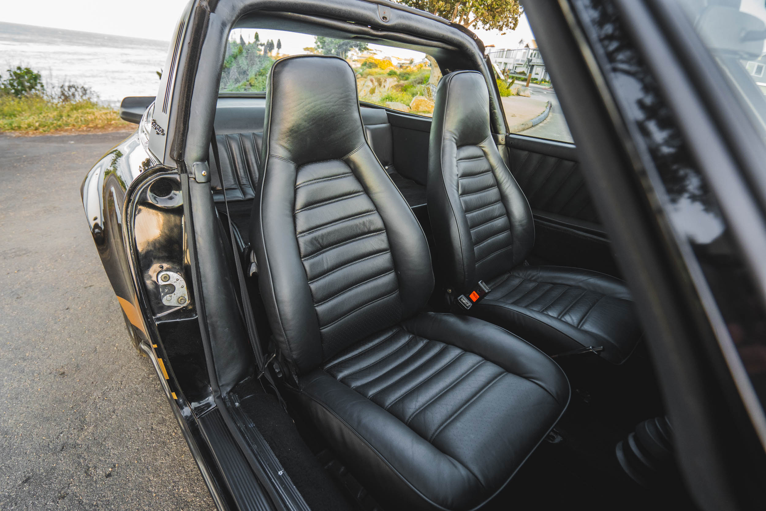 Finished from the factory in Black (700), the car is said to have received a glass-out repaint in 2016. Gold Carrera-script side stripes and Hella H4 headlights were installed more recently, and additional exterior features include a black removable roof panel and Targa bar and front and rear spoilers. The seller notes that the roof panel material is wavy and the fog lamps are inoperable.