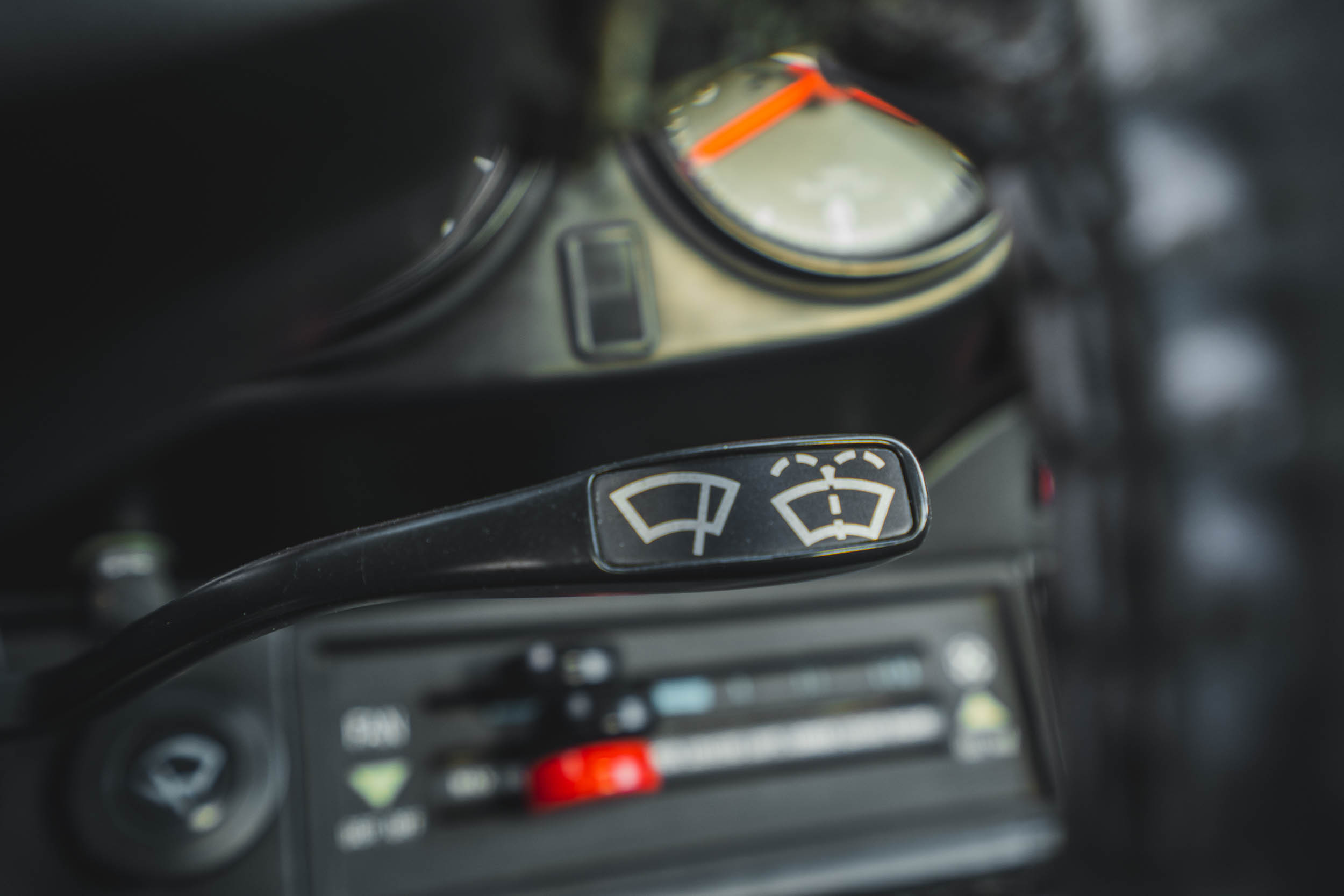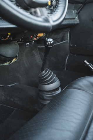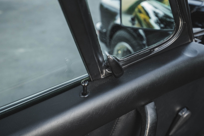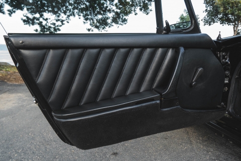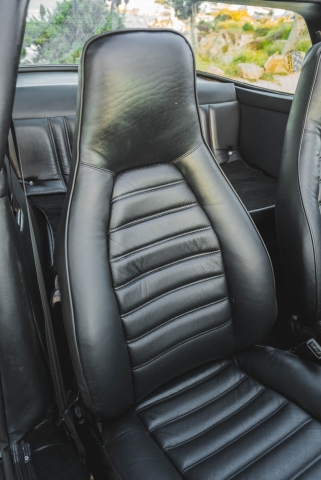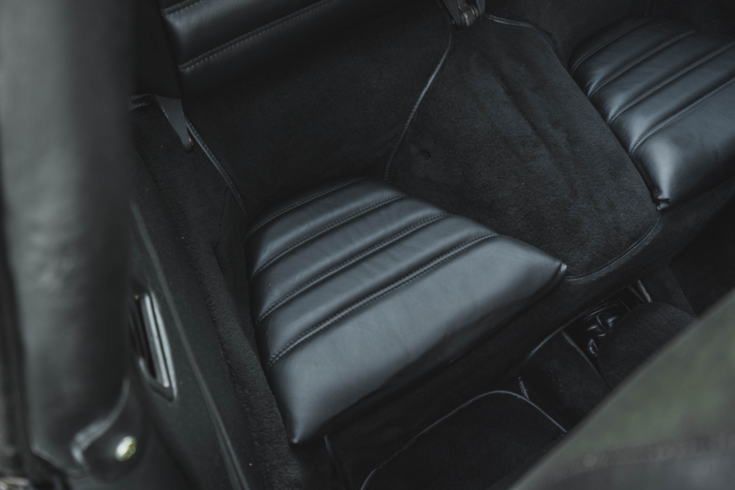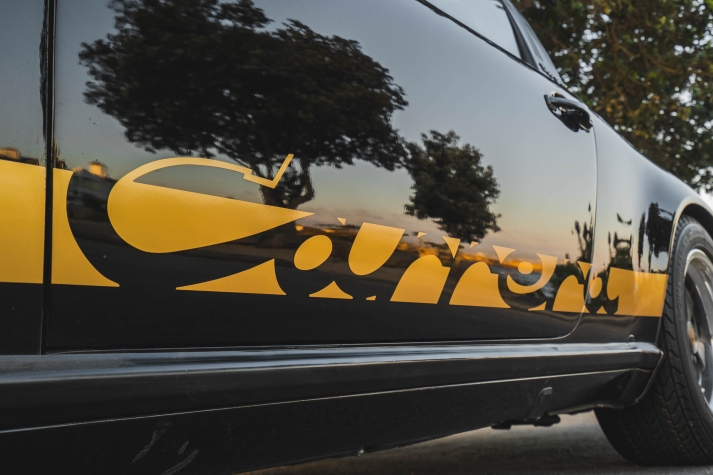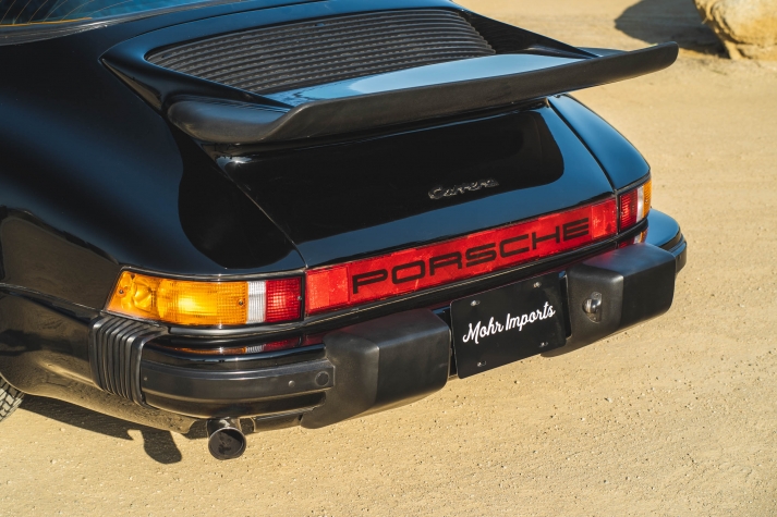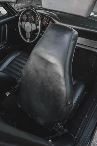 Finished from the factory in Black (700), the car is said to have received a glass-out repaint in 2016. Gold Carrera-script side stripes and Hella H4 headlights were installed more recently, and additional exterior features include a black removable roof panel and Targa bar and front and rear spoilers. The seller notes that the roof panel material is wavy and the fog lamps are inoperable.