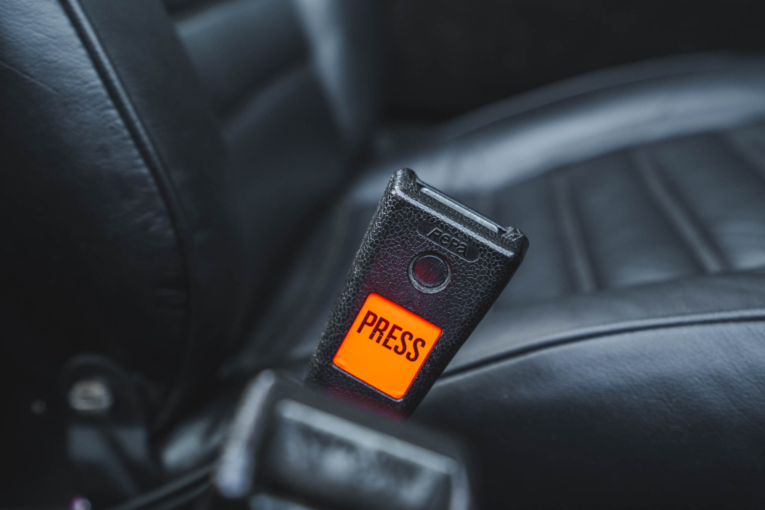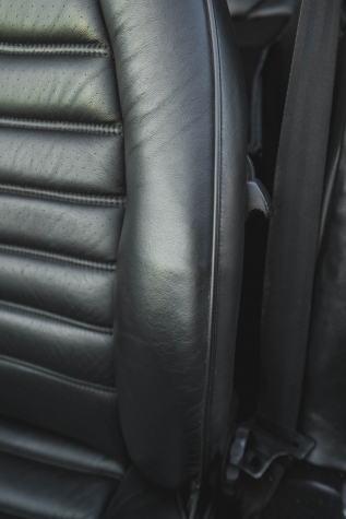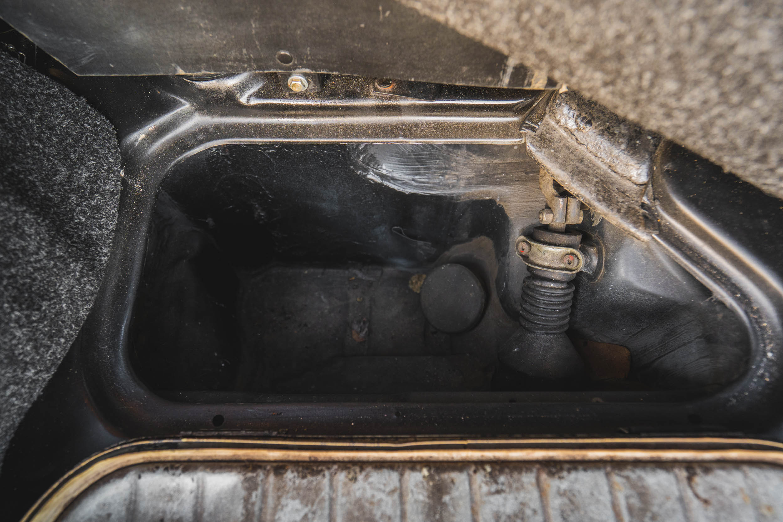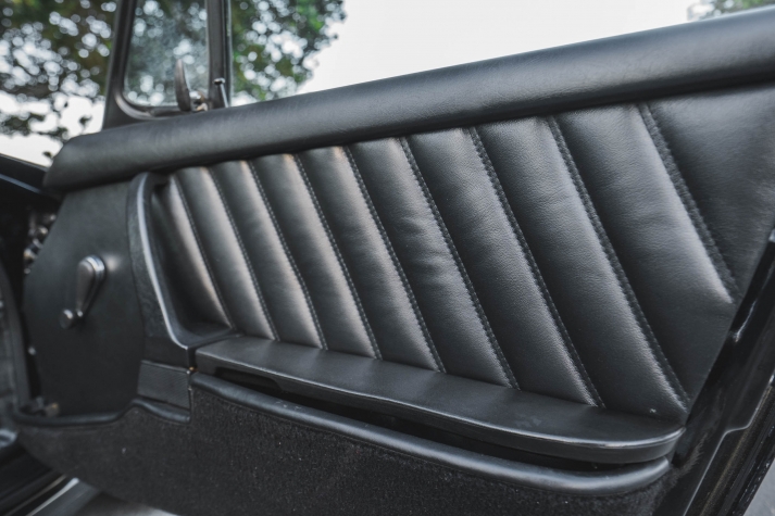 Previously trimmed in red, the cabin has been reupholstered in black leather and houses a matching dashboard, door panels, and carpets. A Kenwood CD stereo has been installed. The seller notes that the driver’s door check strap is broken and cracks are visible in the passenger-side door jamb. An uninstalled Blaupunkt AM/FM radio is included in the sale.