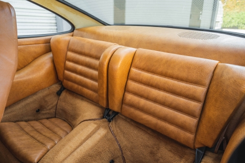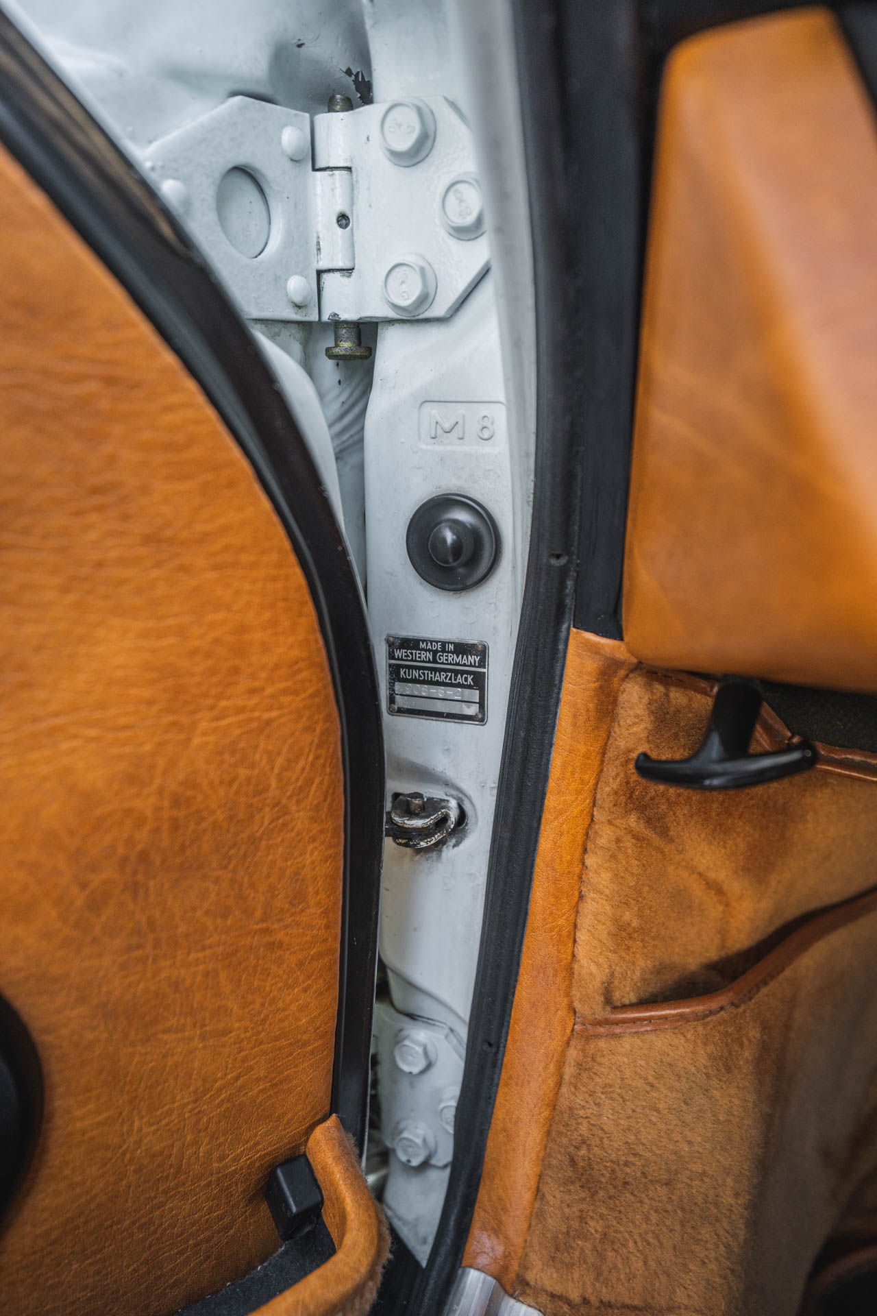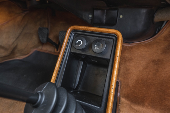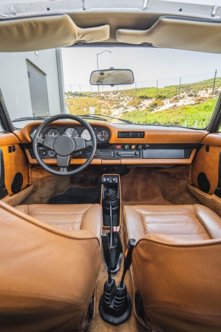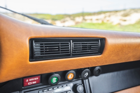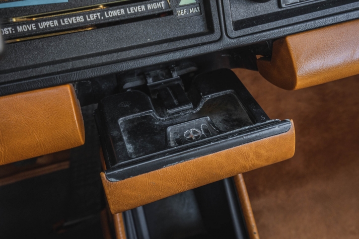 The cabin features bucket seats upholstered in Cork leather along with a color-coordinated dashboard, door panels, and carpets. Amenities include a center console, air conditioning, power windows, and a cassette stereo.