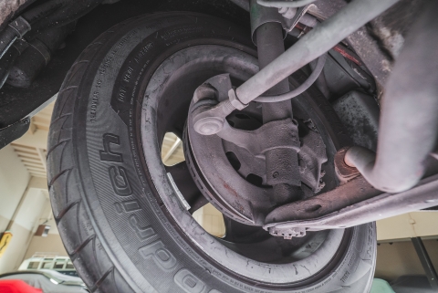 Black 16? Fuchs-style wheels are mounted with 205/55 front and 225/50 rear BFGoodrich g-Force Sport tires that were manufactured prior to 2000. A space-saver spare is located in the front trunk.