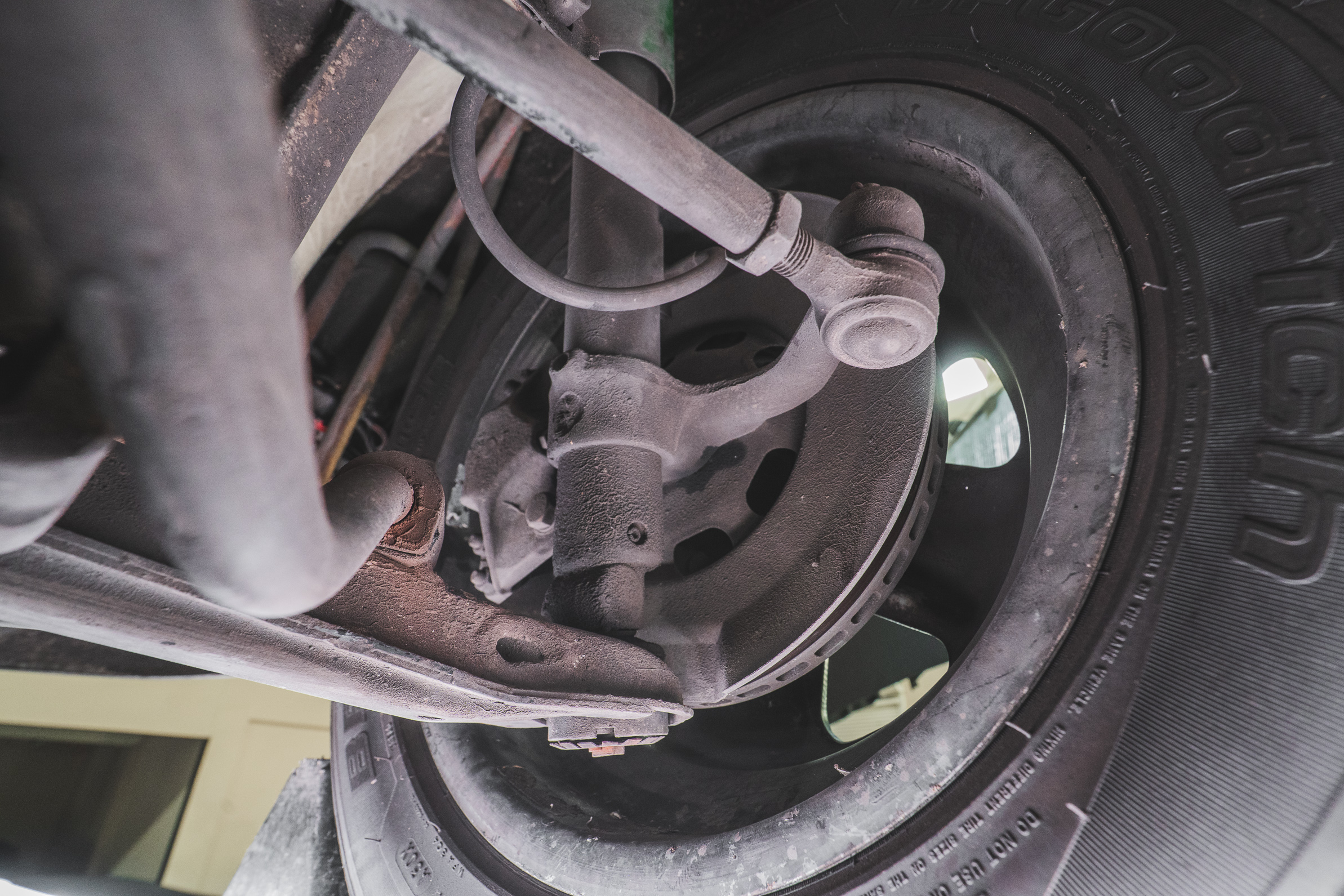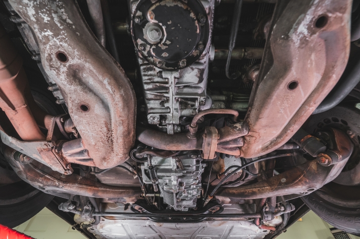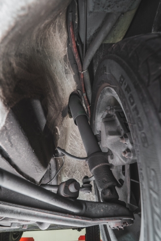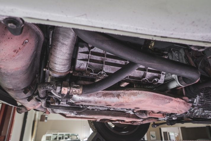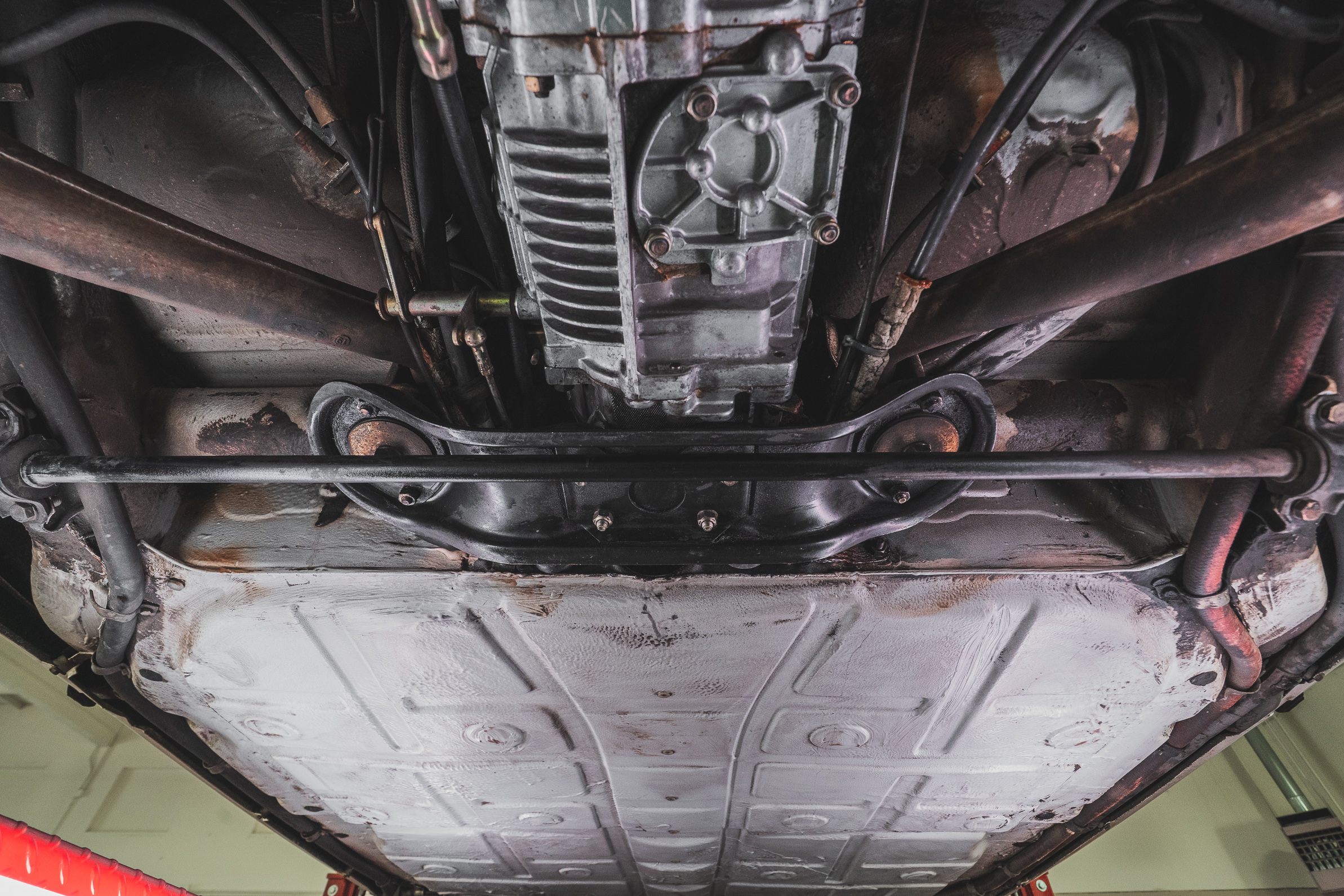 Power is delivered to the rear wheels through a five-speed manual transaxle, and the selling dealer states that the clutch was replaced in 2004. Additional photos of the underside are presented in the gallery.
