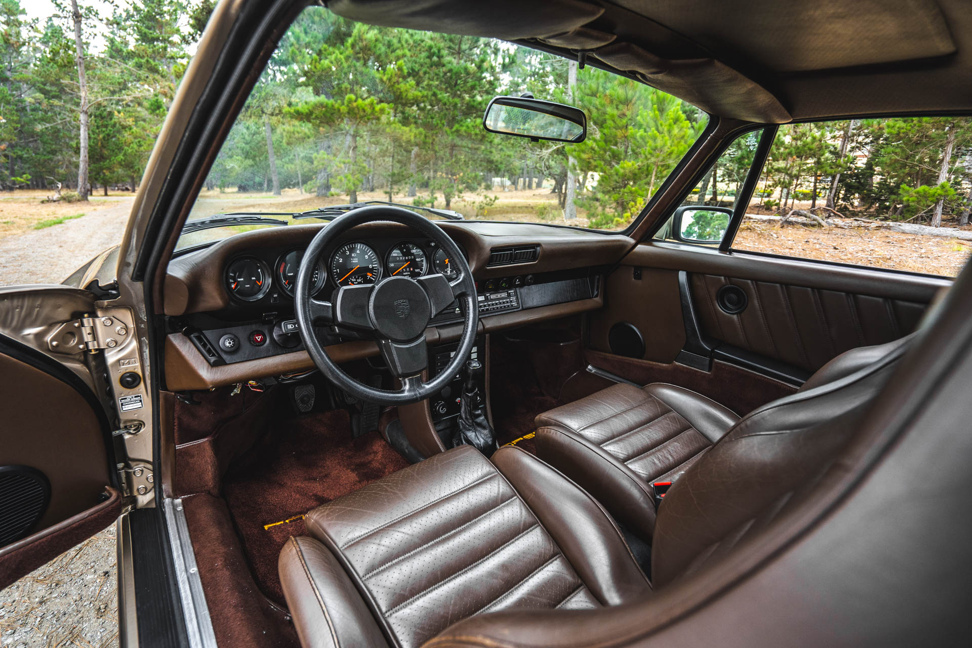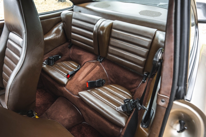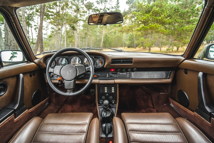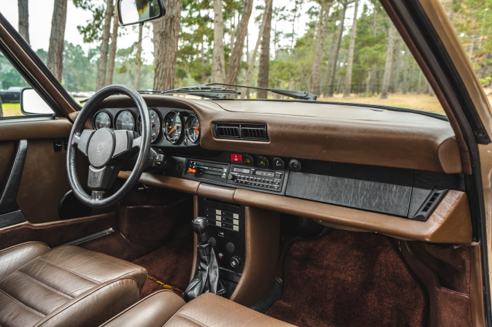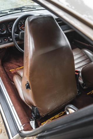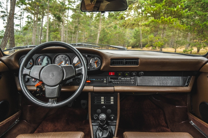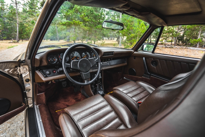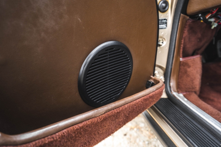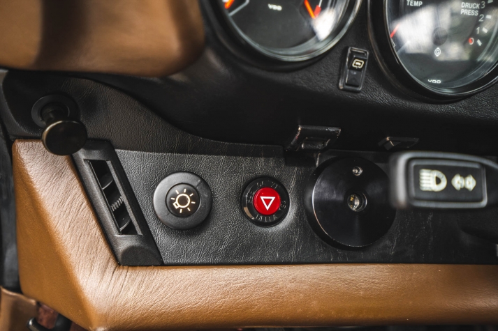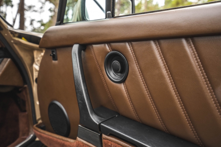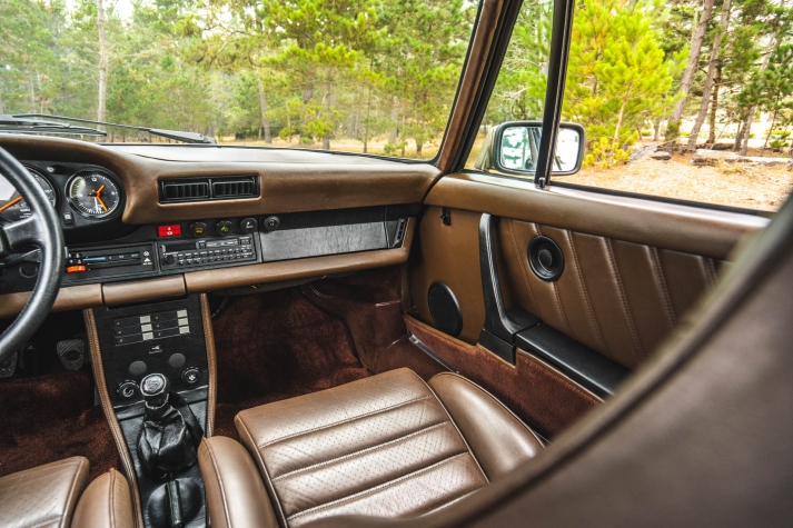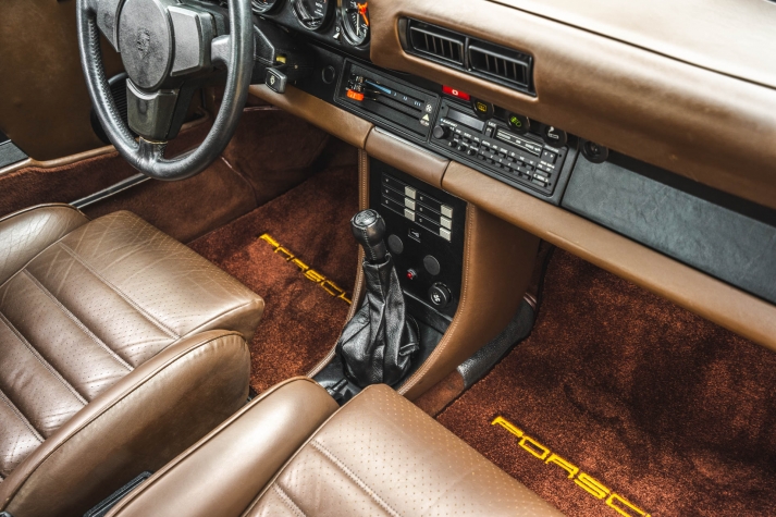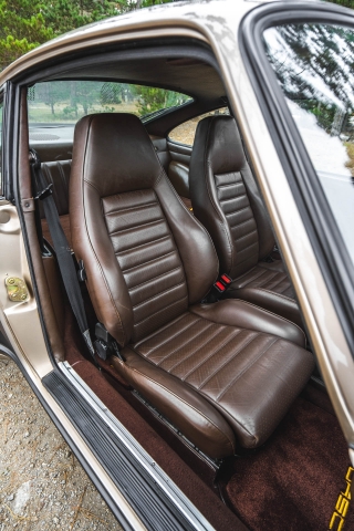 Cadbury Brown leather covers the seating surfaces, and amenities include air conditioning, a Blaupunkt Reno SQR 46 cassette stereo, power windows, and a heater. A revised center console has been fitted, and a short-shift kit has been installed.